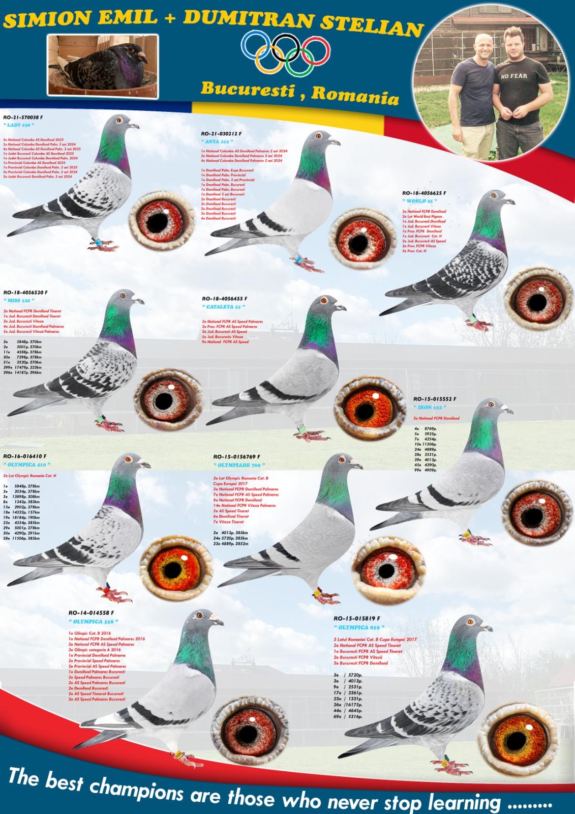 Tandemul format din domnii Simion Emil si Dumitran Stelian sunt un nume de referinta la nivel national cand vine vorba de concursurile de o zi, 100-750 km.S-au specializat in concurarea exclusiva a femelelor si o fac spectaculos. Rezultatele acestora sunt de-a dreptul fantastice intr-o concurenta atat de puternica cum este in Bucuresti, cu multipli campioni nationali la aceste categorii.