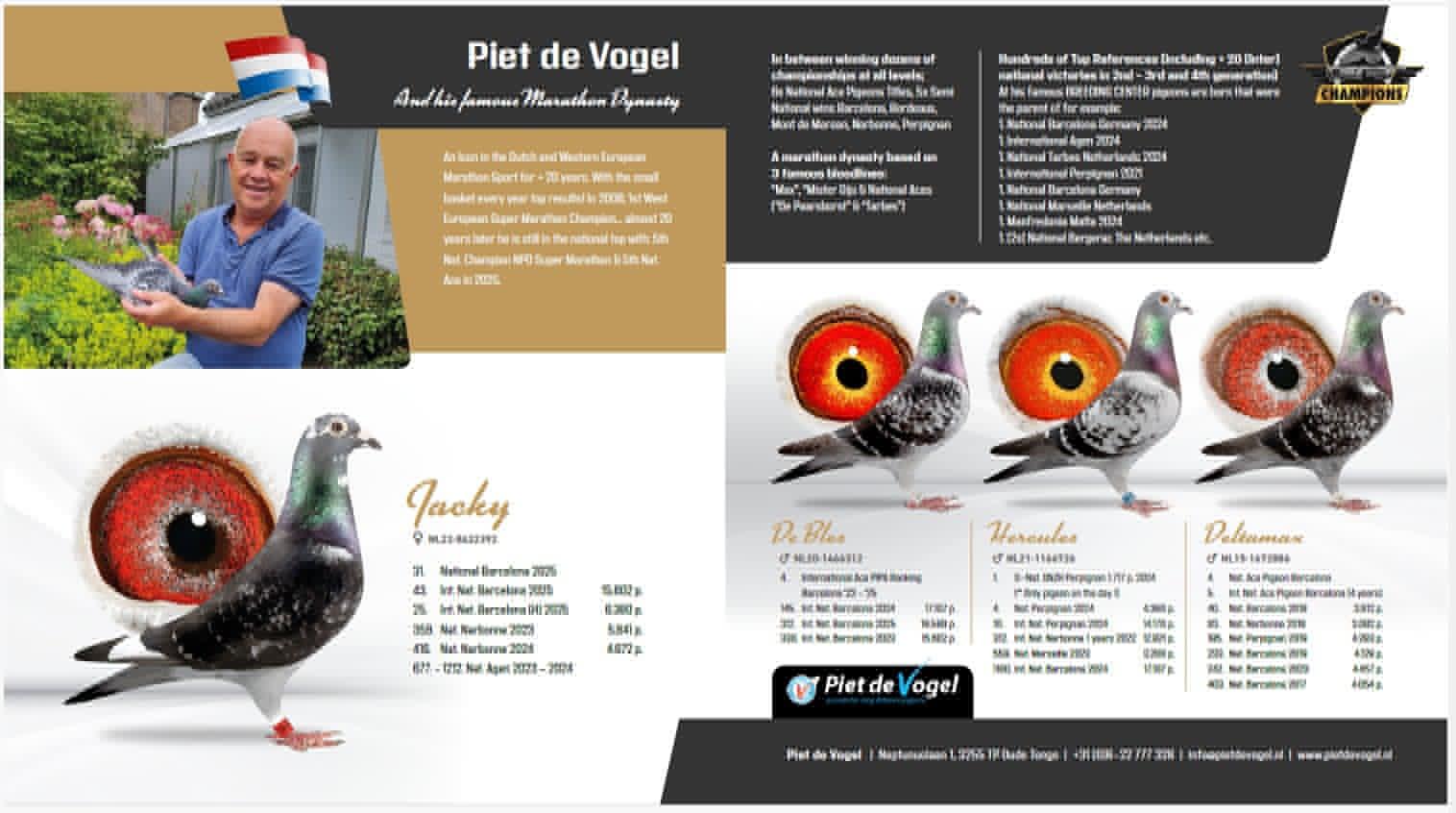 Rex de Leeuw a reusit sa-si construiasca un palmares impresionant, stabilindu-se ca o adevarata revelatie in lumea competitiilor de maraton. Inregistrand rezultate notabile precum 1. National Perpignan f. (2. National total), 1. National Bordeaux din 27.794 porumbei, 2. National Bordeaux din 18.023 porumbei, si 8. National Barcelon [...]