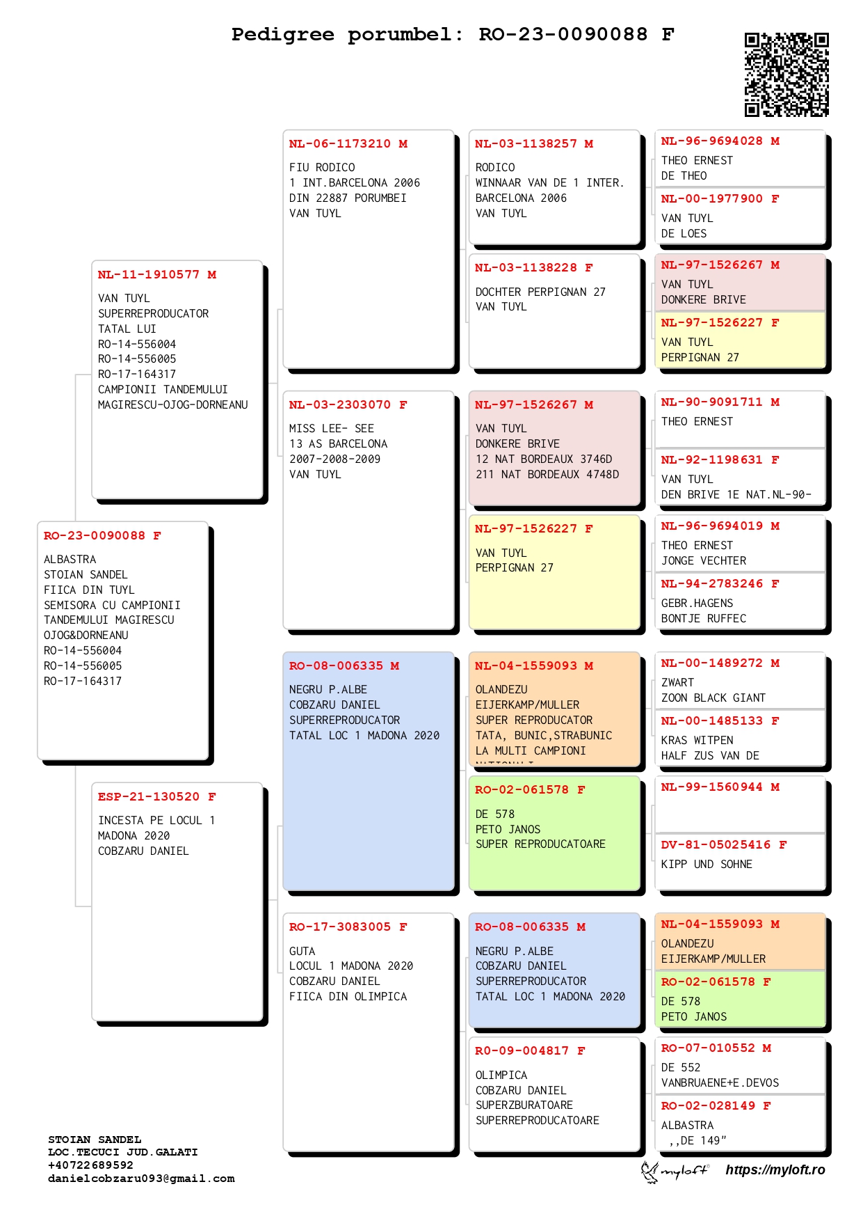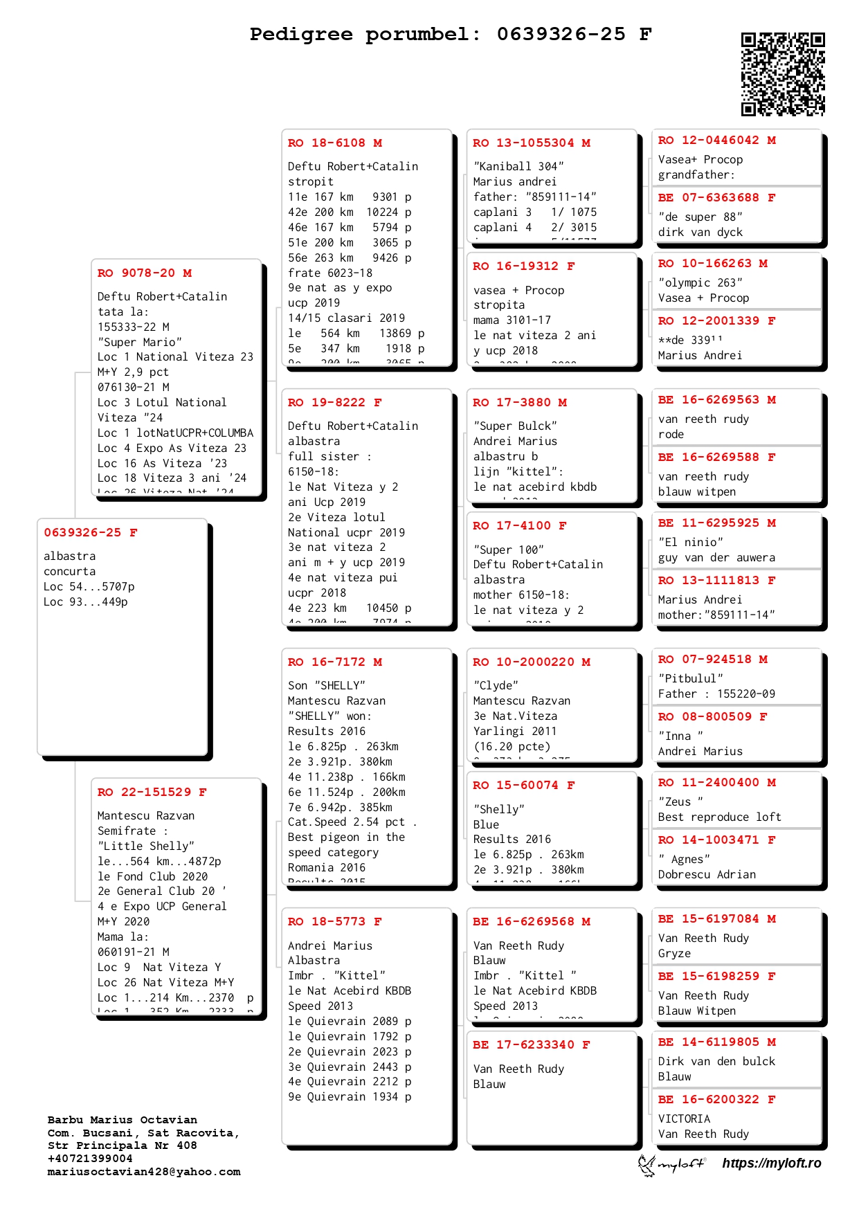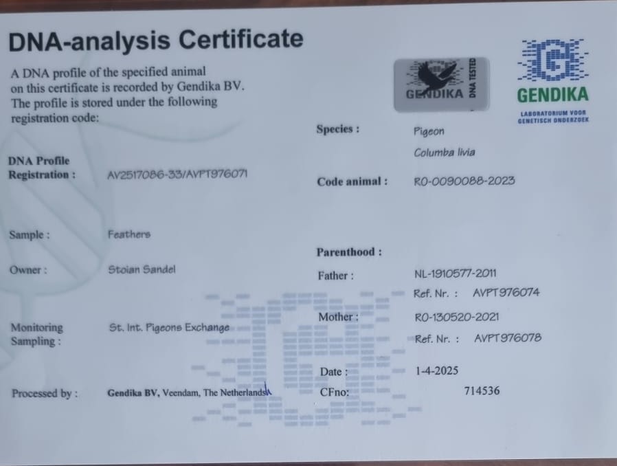 Frate bun cu 0511007-22 Loc 1 Jud. Maraton Tineret 2023 - Zlibut+Santa+Fildan Tata : Frate bun cu Faraonul RO17-900981 11 etape de Maraton Cls. Loc 2 National Pal. 2021 Loc 1 As Maraton Pal. Prov.Vest 2021 Loc 1 Nat.Berlin 3 ani Loc 1 Nat.Berlin 4 ani Mama: Sora buna cu Unica RO19-28223 2xLoc 1 la Maraton Loc 3 Nat. AS Maraton 21 Loc 1 Prov. Vest 2021 Loc 1 Nurenberg 883km/8409P Loc 1 Stendal National 950km/2369P nevandut |