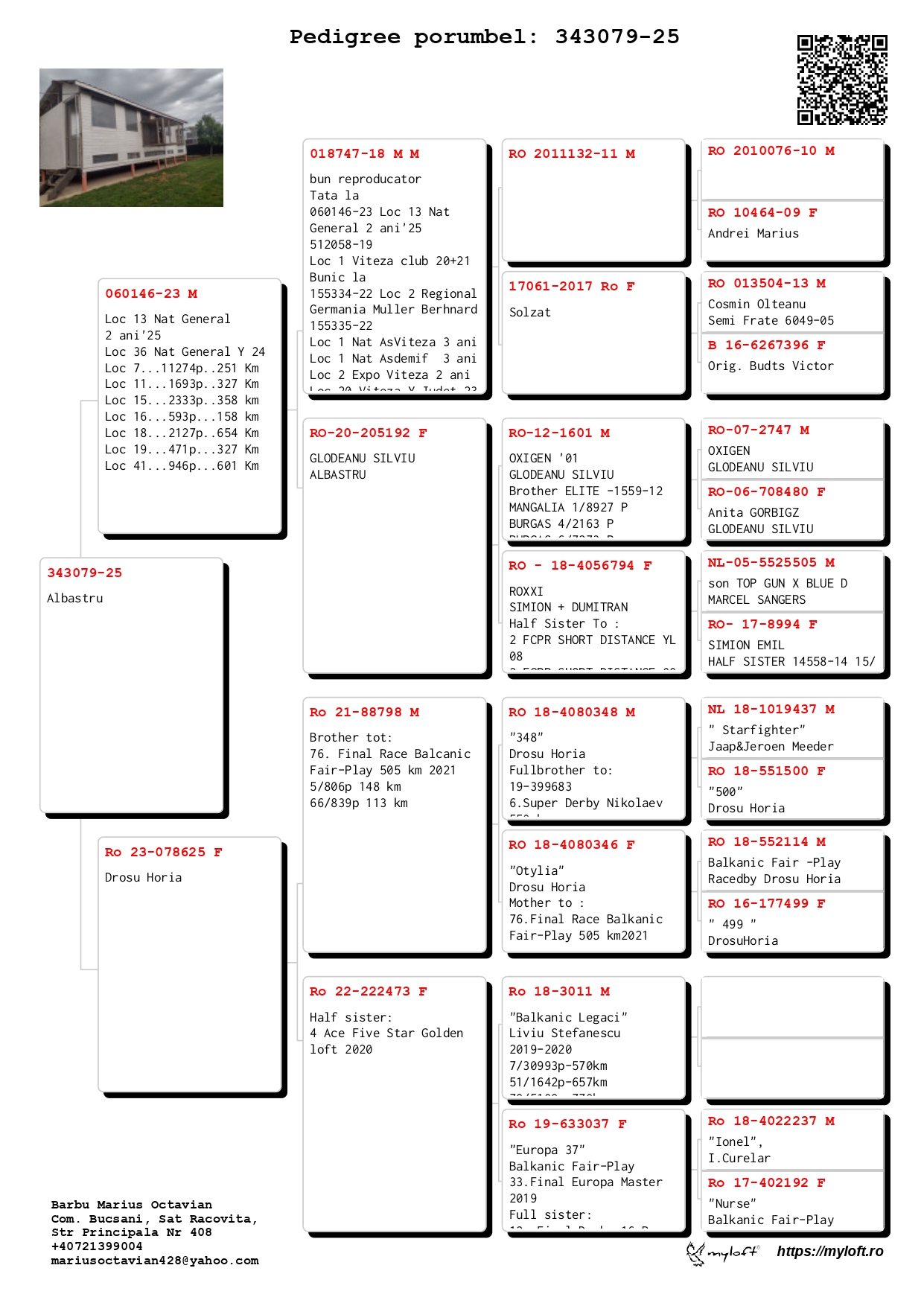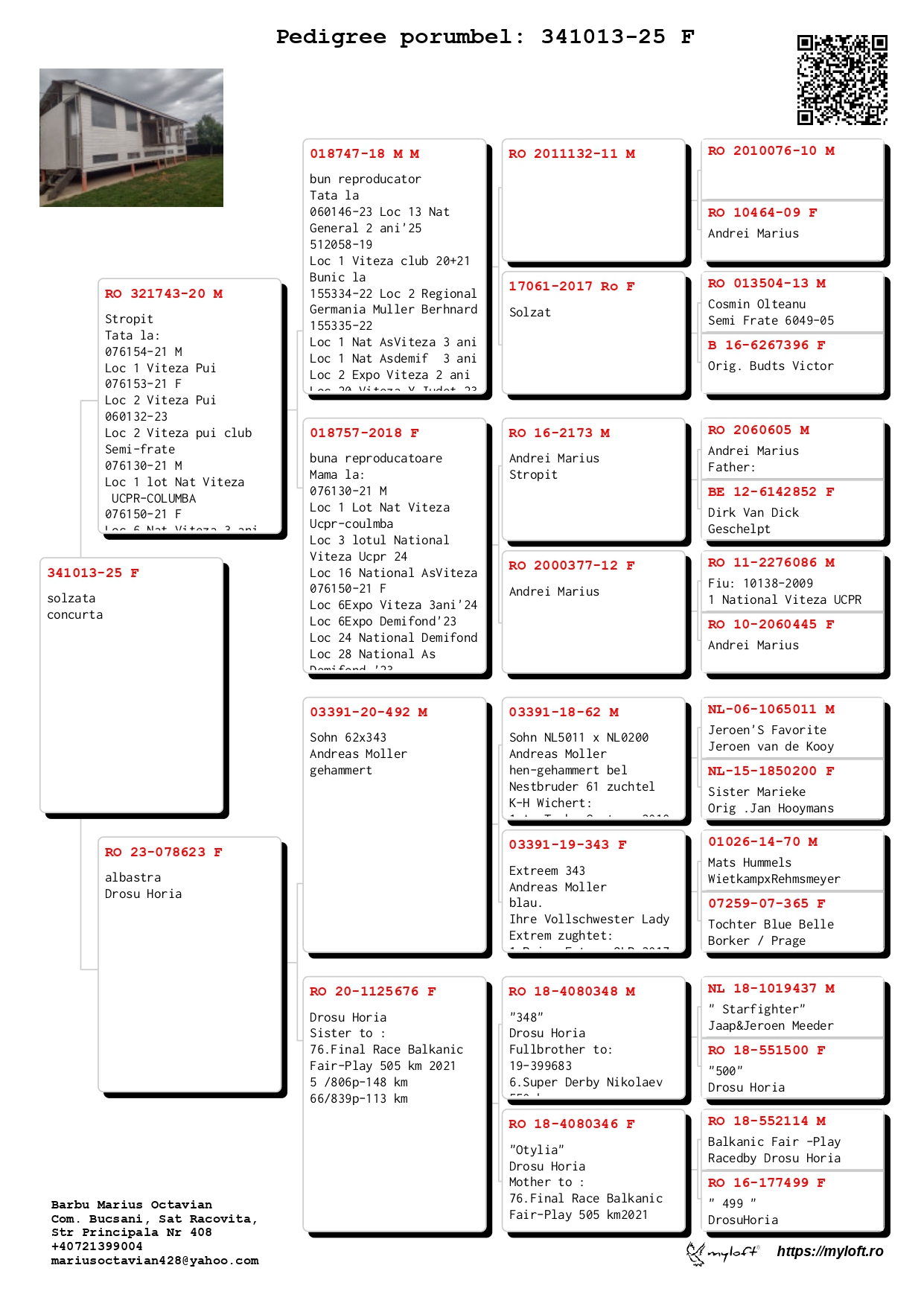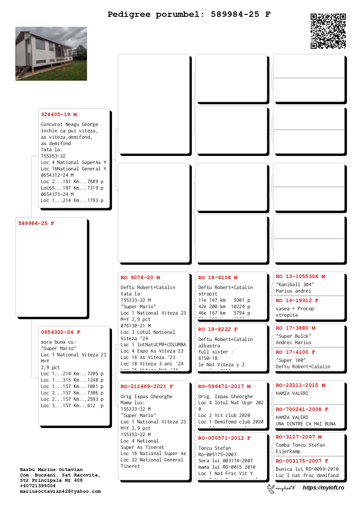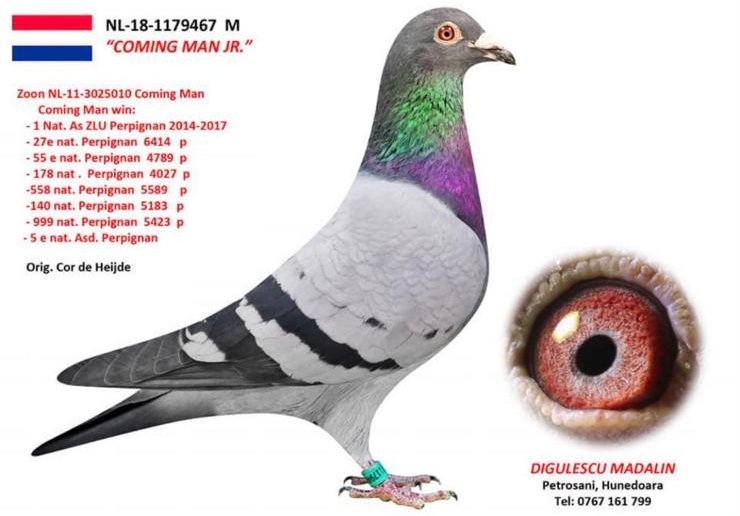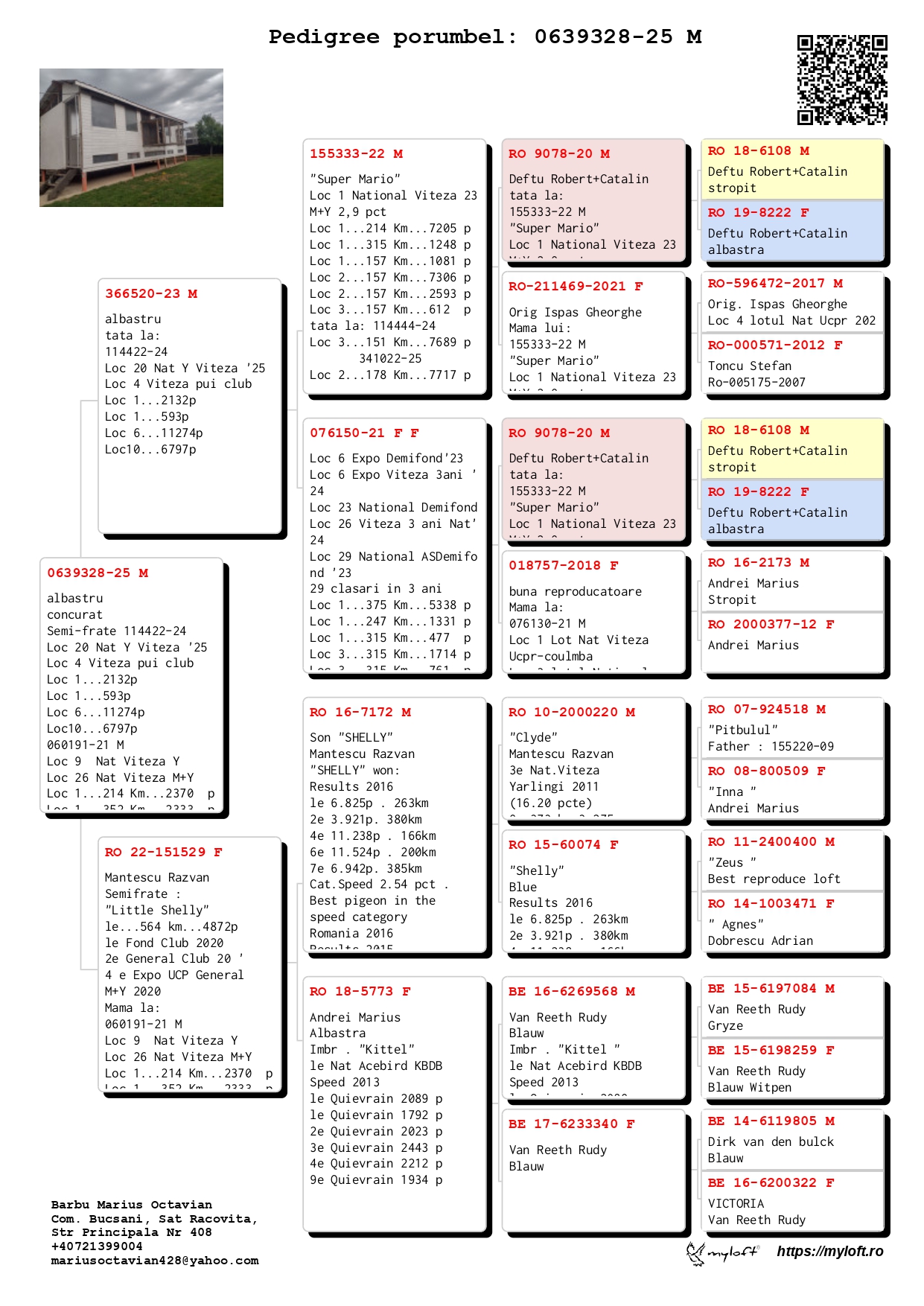 Concurata in sezonul cu puii Semi sora :155333-22 M Super Mario Loc 1 National Viteza 23 M+Y 2,9 pct 076130-21 M Loc 3 Lotul Național Viteza 24 Loc 1 lotNatUCPR+COLUMBA Loc 4 Expo As Viteza 23 060191-21 M Loc 9 Nat Viteza YLoc 26 Nat Viteza M+Y Loc 1 214 Km 2370 p Loc 1 352Km 2333 p Loc 3 352 km 507 p Loc 4 157 Km 20580 p nevandut |