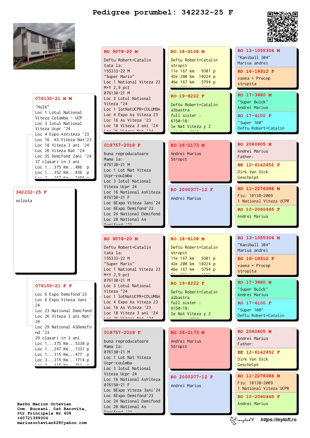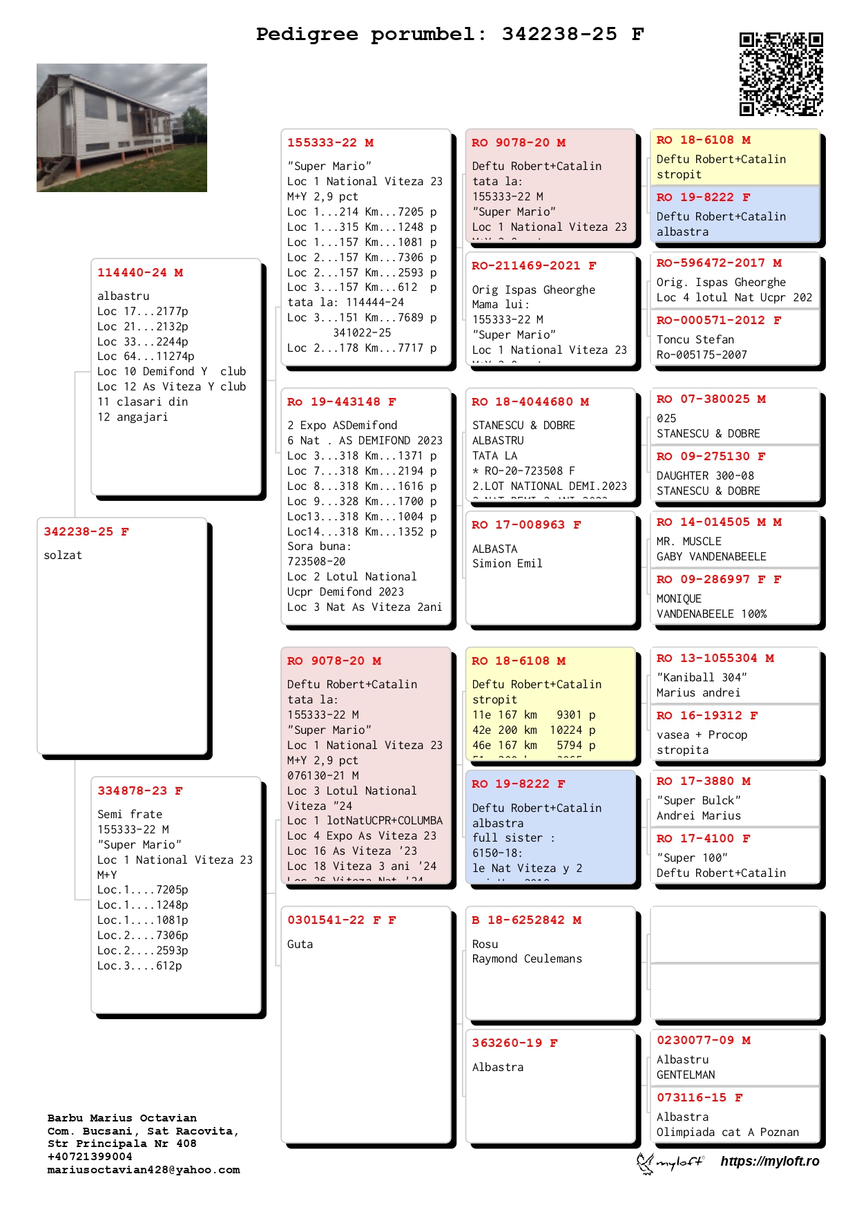 Fiica din celebrul reproducator in crescatoria Magiresccu - Tuylu Semi-sora de tata cu 556004-14 1 nat. 556005-14 2. nat. 164317-17 2. nat Mama Incesta pe Loc 1 Madona Cobzaru Daniel