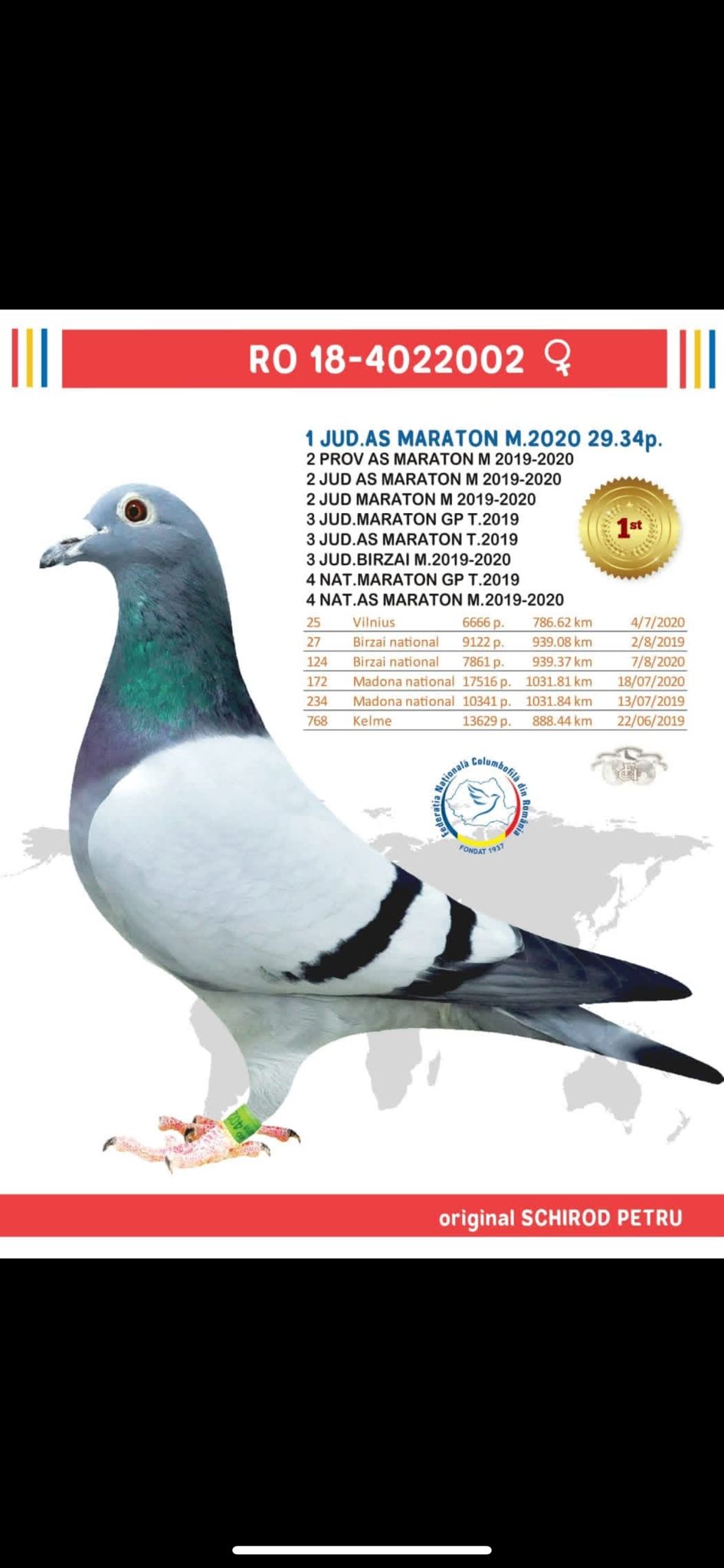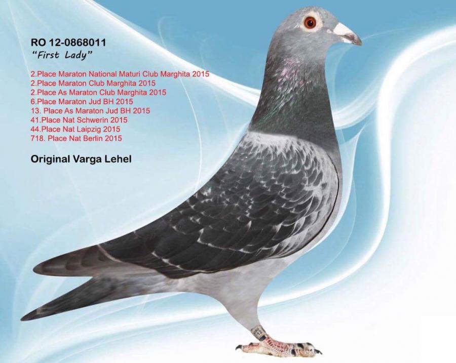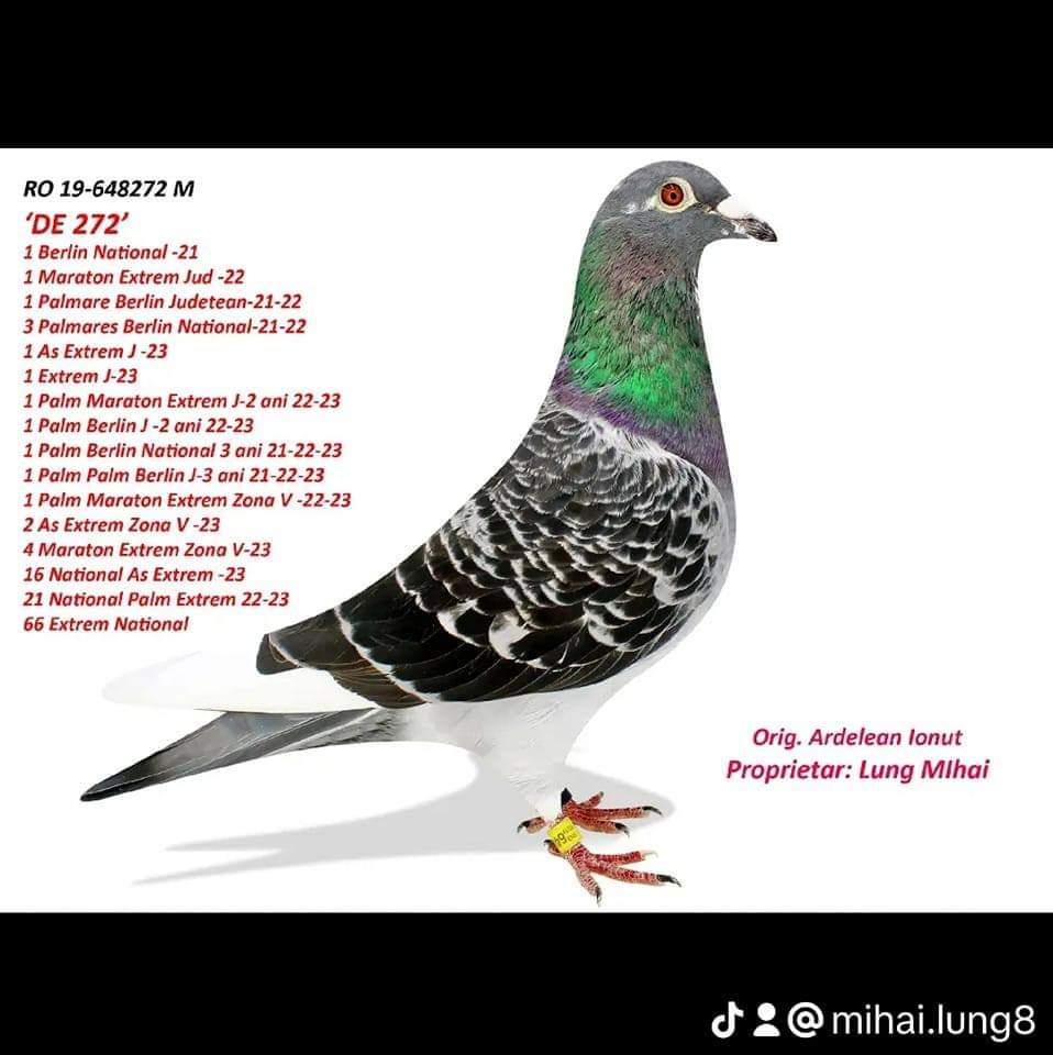 Fiu „Queen Madona” Locul 1 in clasamentul World Best Pigeons 2019 Locul 1 din 19.091 porumbei Maraton Madona National 2019, 1200 km, 0,05 pct Locul 1 din 6086 porumbei Maraton Extrem Tartu 2019, 1320 km, 0,16 pct Locul 1 National Maraton Maturi 2019, 0,21 pct Locul 1 National Trofeul Maraton Extrem 2019 Fiu „Fantastic 617” 2 National AS Fond 2018 3 National AS Maraton 2018 3 National AS Fond Palmares 2018 7 National Fond Palmares 2018 10 National AS Fond Palmares 2019 10 National Maraton Palmares 2019 16 National Maraton Extrem 2018 nevandut |