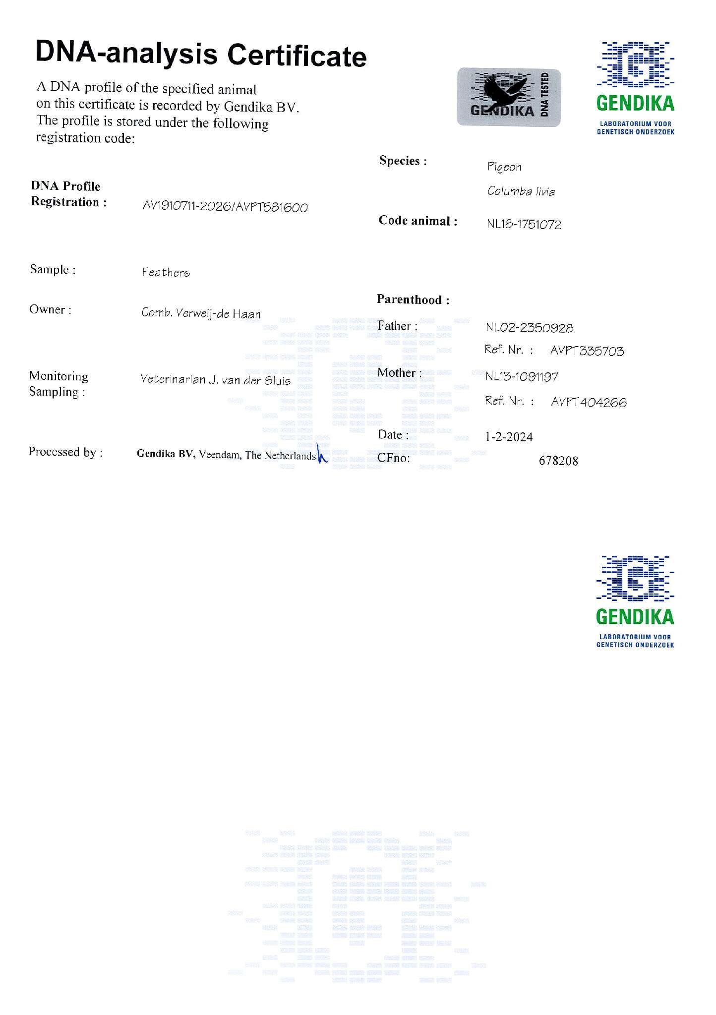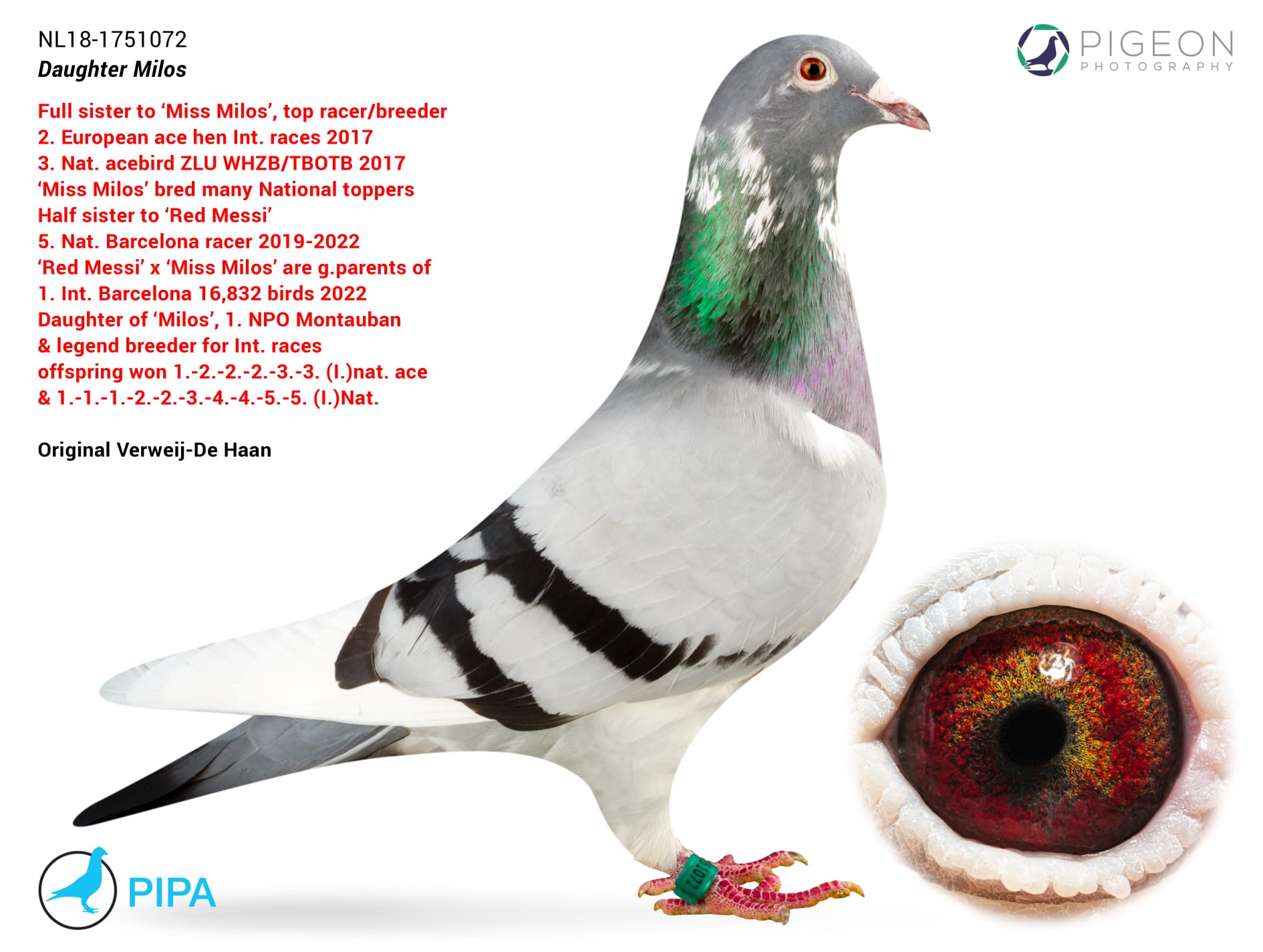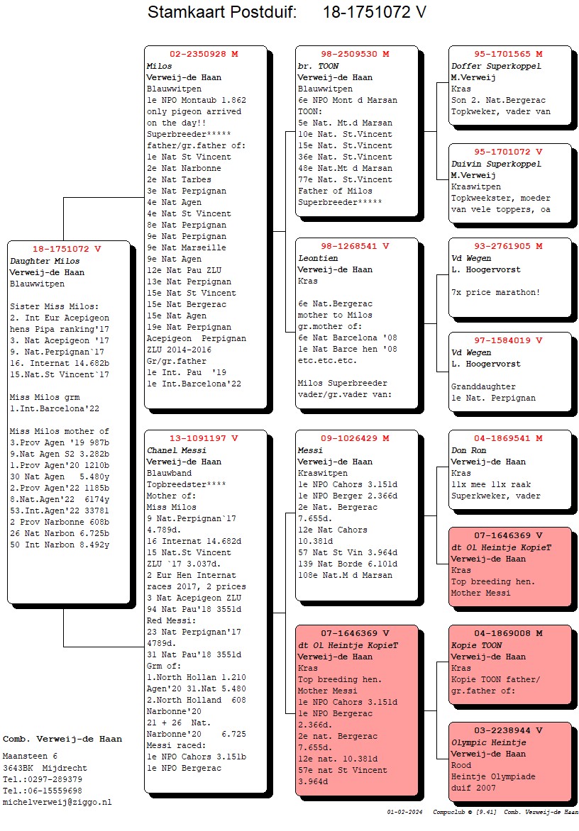 Fiu Sky Verweij-de Haan 1 Acepigeon North South Holland 19 1 Acepigeon Fondunion 2000 19 3 Nat. Acepigeon ZLU 19 2 Nat. Acepigeon WHZB/BOTB 19 188 Nat St Vince 19 12.692b 156 Nat Perpignan 20 2.354b Toate cursele peste 1.050 km! Nepot Red Messi nevandut |