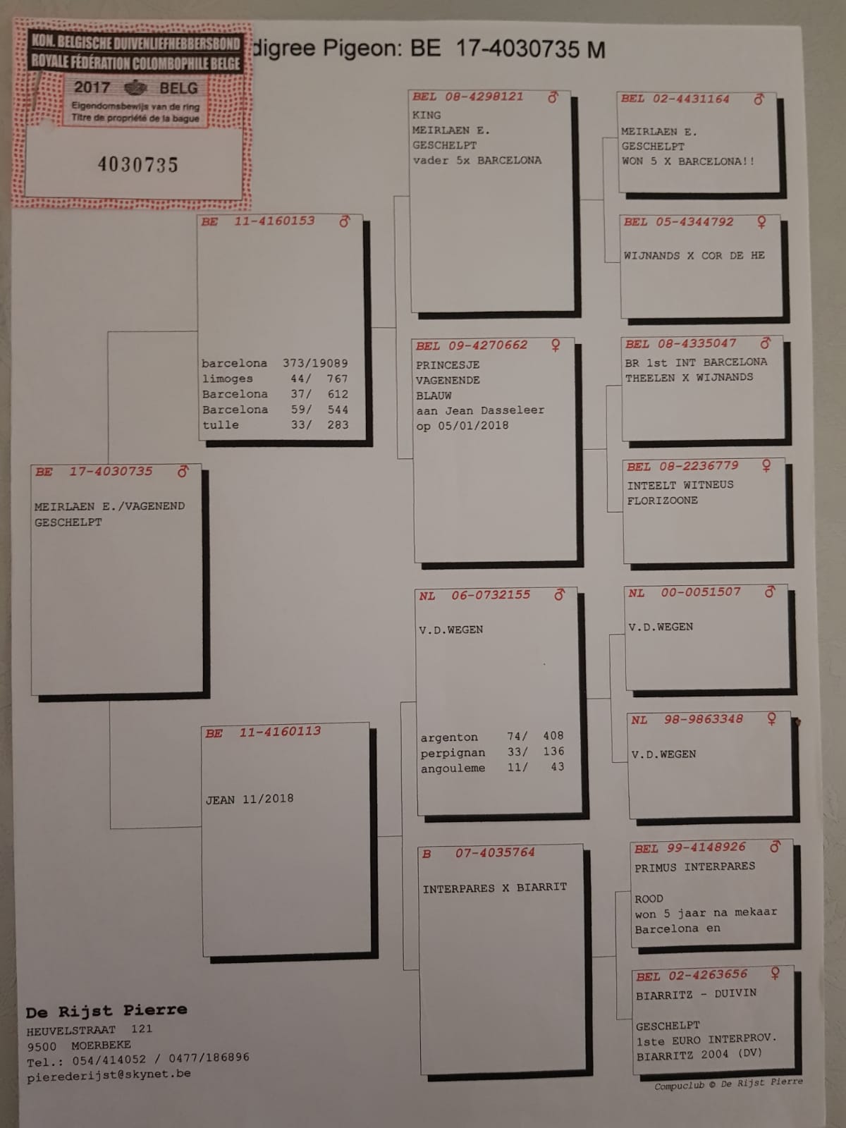 Dublu Nepota Red Rose Ace pigeon Perpignan ZLU 2014–2016 2e Eur Acepigeon Pau 2015–2016 5e Eur Ace hen 2016 1e Nat Pau 3.788d 12e Nat Agen 1.004d 19e Nat Perp 4.027d 52e Int Perp 12.689d 4e Nat Perp 1.079d nevandut |