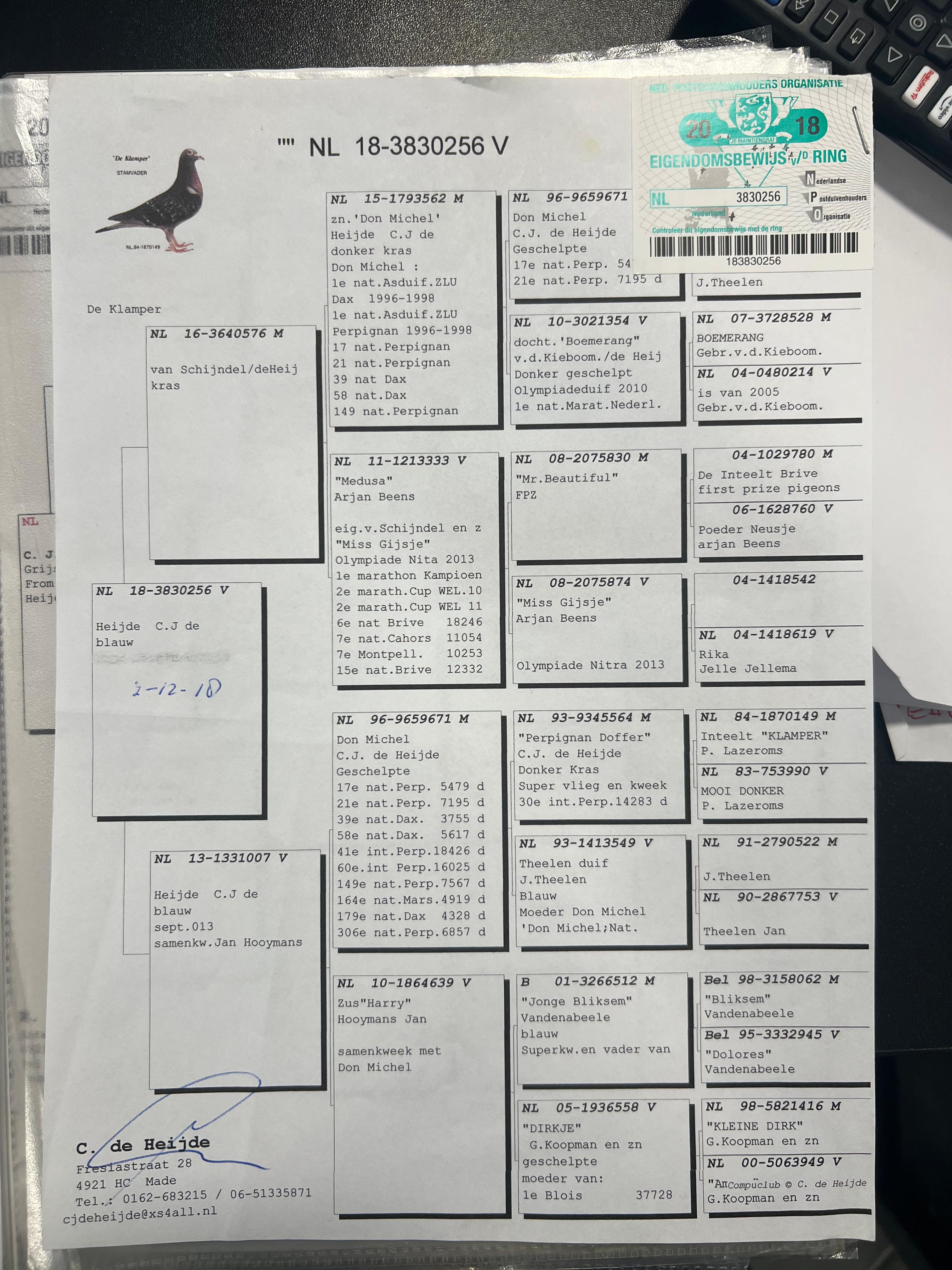 Fiu Ons Tess 3 Nat. Marseille 950 km 2021 26 Nat. Pau 2023 33 Nat. Marseille 950 km 2022 Doua sosiri nocturne la 00:42 si 4:00 Ons Tess este nepoata Annemarie 1 Nat. Marsilia 4899 p. Fiu Mon Vic 59 Nat. Marseille 3312 p. 2022 Porumbelul se afla in Germania. Transportul costa 250 lei. cumparat de Theil Norberth in data de 14.11.2025 07:47:11 |