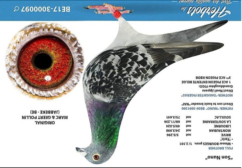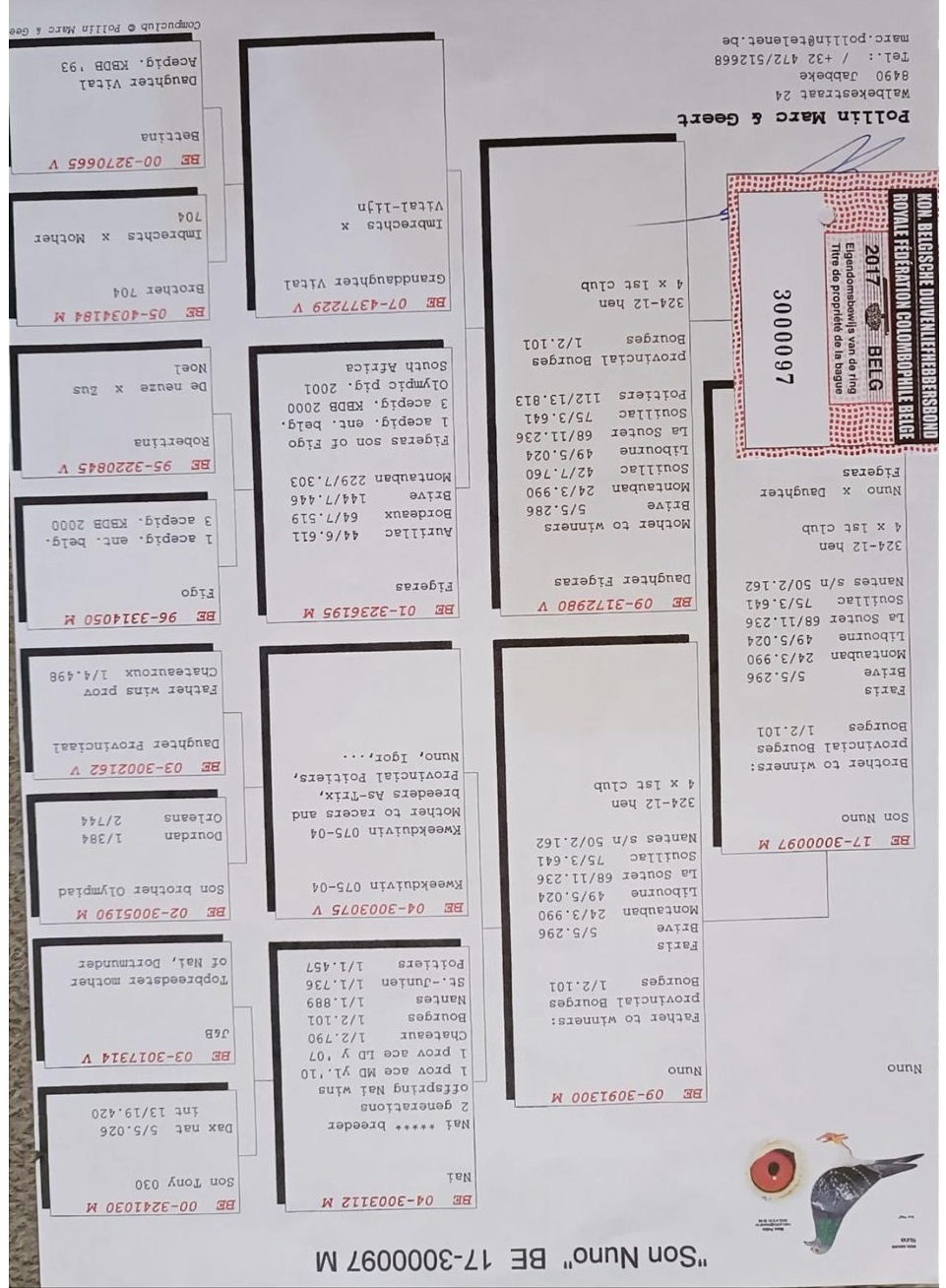 Fiu Sky Verweij-de Haan 1 Acepigeon North South Holland 19 1 Acepigeon Fondunion 2000 19 3 Nat. Acepigeon ZLU 19 2 Nat. Acepigeon WHZB/BOTB 19 188 Nat St Vince 19 12.692b 156 Nat Perpignan 20 2.354b Toate cursele peste 1.050 km! Nepot Red Messi nevandut |