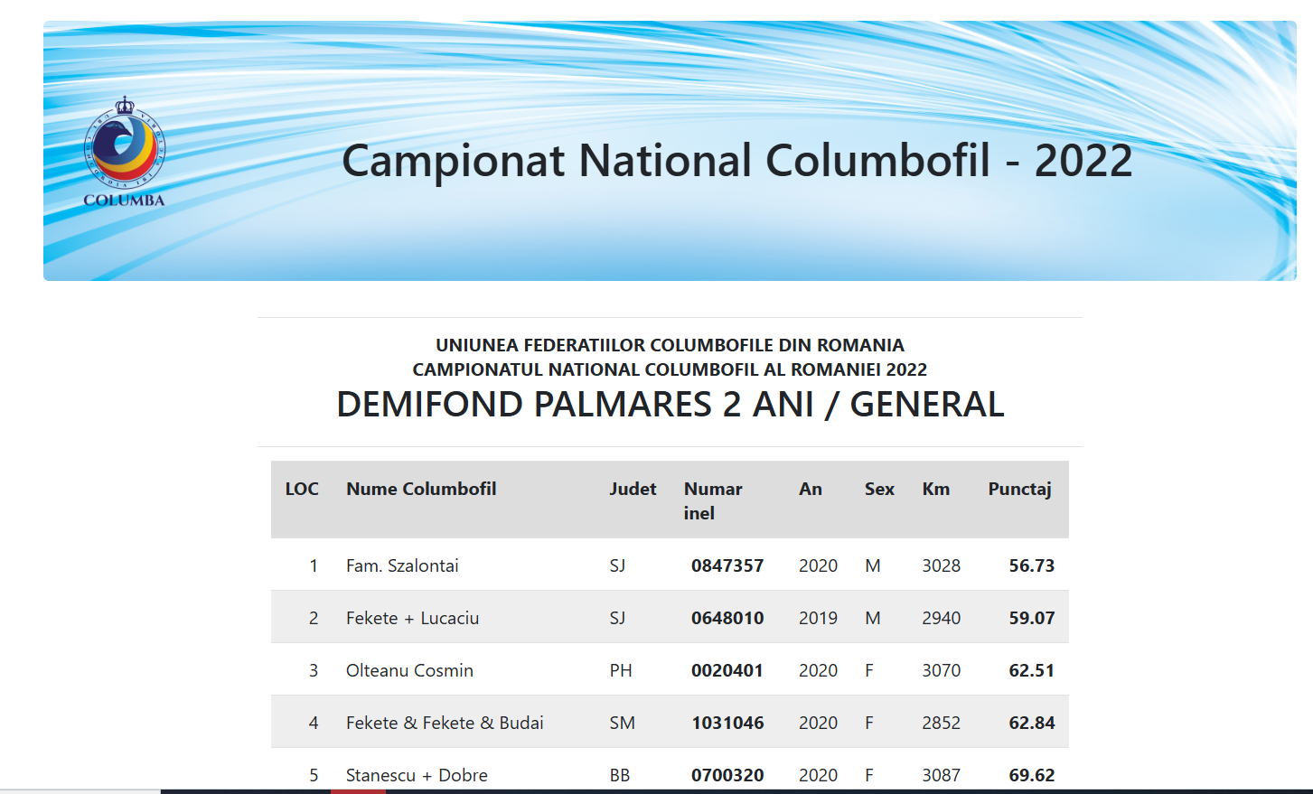 Fiu „Queen Madona” Locul 1 in clasamentul World Best Pigeons 2019 Locul 1 din 19.091 porumbei Maraton Madona National 2019, 1200 km, 0,05 pct Locul 1 din 6086 porumbei Maraton Extrem Tartu 2019, 1320 km, 0,16 pct Locul 1 National Maraton Maturi 2019, 0,21 pct Locul 1 National Trofeul Maraton Extrem 2019 Fiu „Fantastic 617” 2 National AS Fond 2018 3 National AS Maraton 2018 3 National AS Fond Palmares 2018 7 National Fond Palmares 2018 10 National AS Fond Palmares 2019 10 National Maraton Palmares 2019 16 National Maraton Extrem 2018 nevandut |