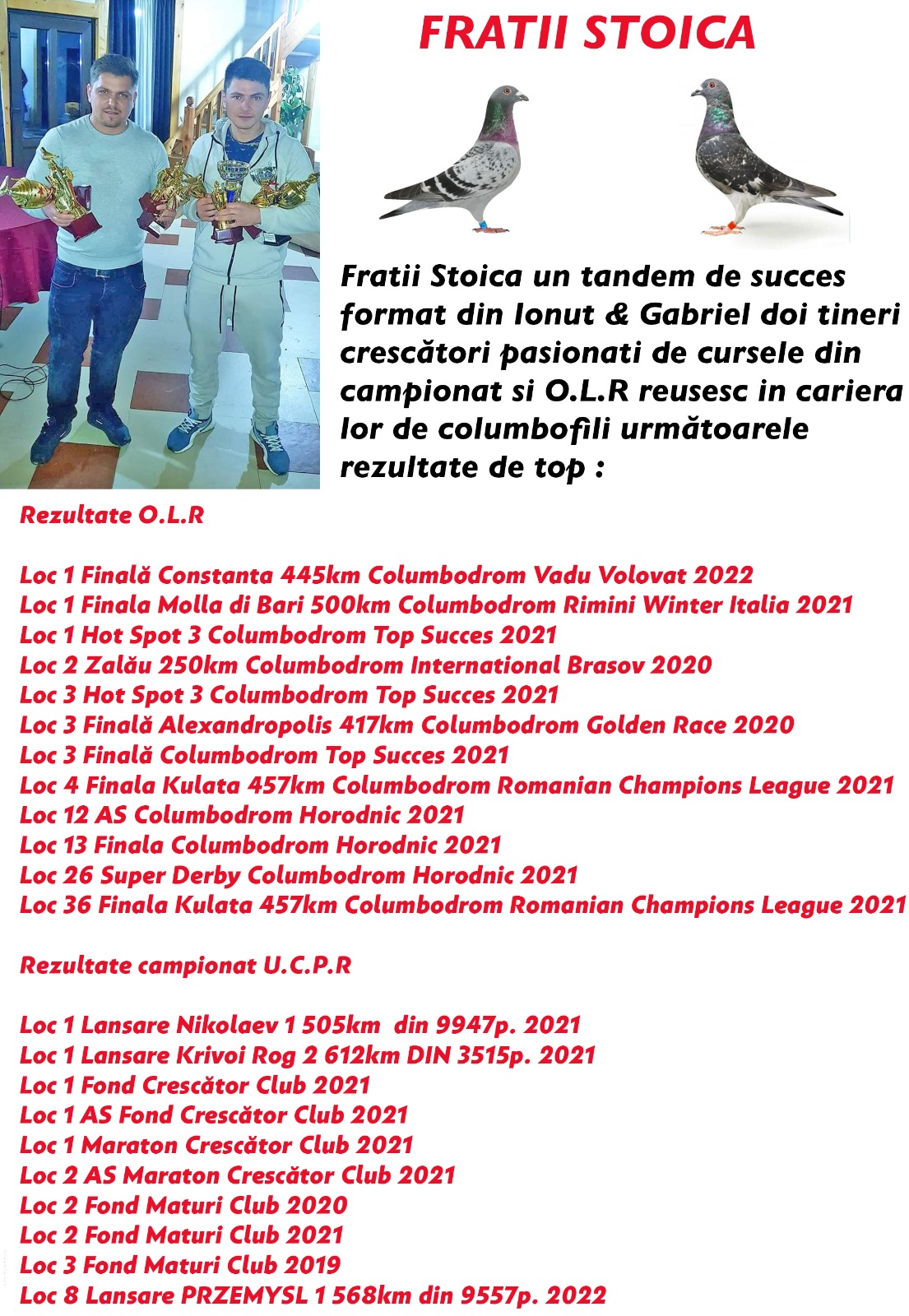 Fratii Stoica un tandem de succes format din lonut & Gabriel doi tineri crescători pasionati de cursele din campionat si O.L.R reusesc in cariera lor de columbofili următoarele rezultate de top:Rezultate O.L.RLoc 1 Finală Constanta 445km Columbodrom Vadu Volovat 2022Loc 1 Finala Molla di Bari 500km Columbodrom Rimini Winter Italia 2021Loc 1 Hot Spot 3 Columbodrom Top Succes 2021Loc 2 Zalău [...]