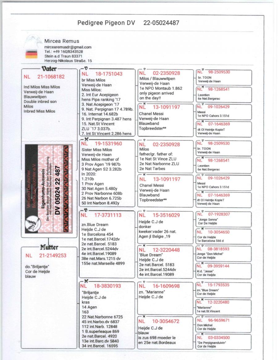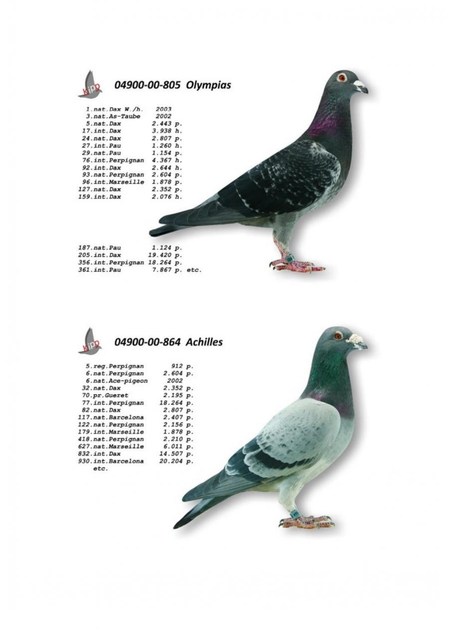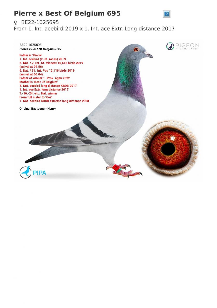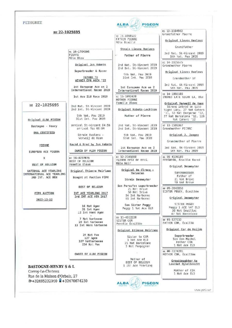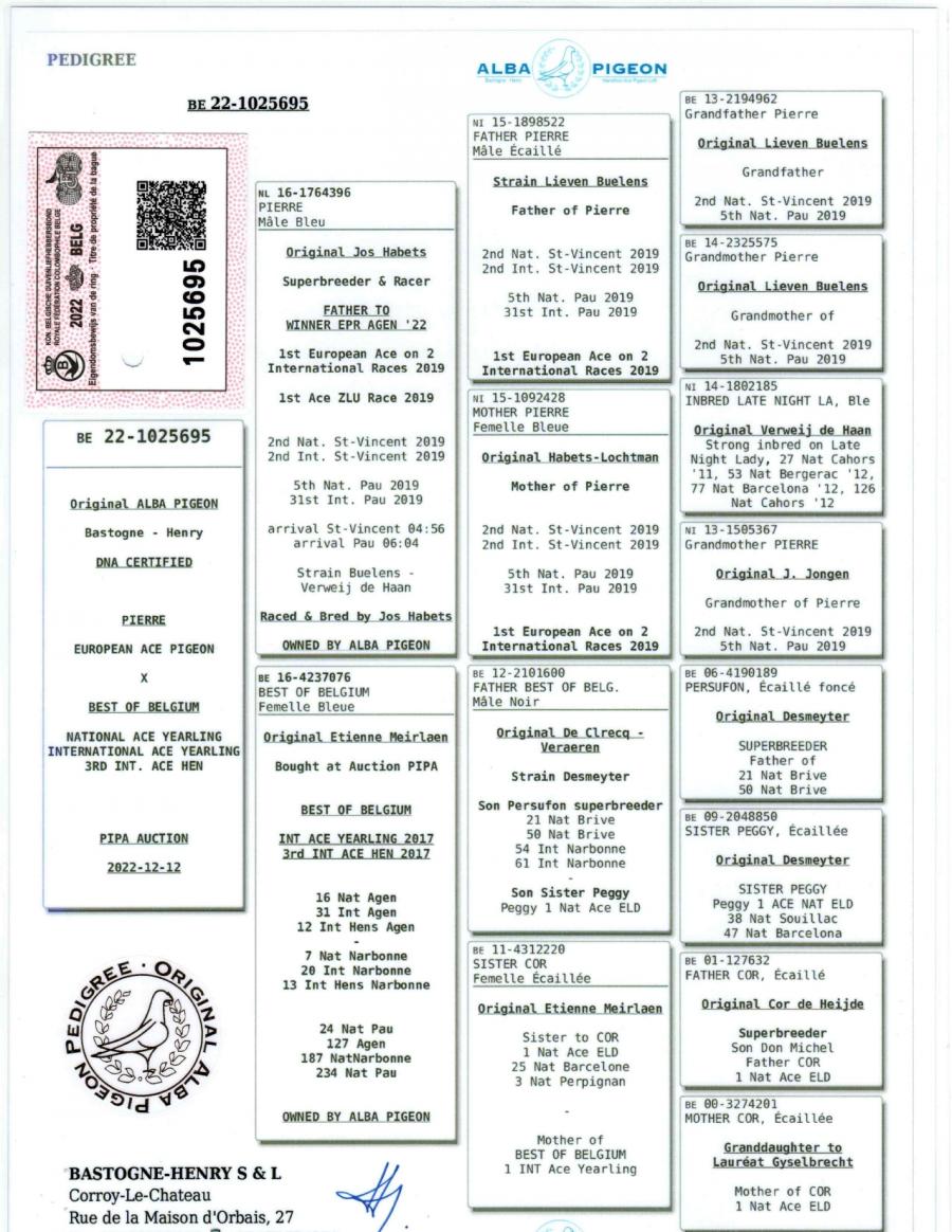 Nepoata PIERRE - SUPER REPRODUCATOR SI ZBURATOR Tata la : WINNER EPR AGEN `22 1st European Ace on 2 International Races 2019 1st ACE Zlu Race 2019 2nd Nat. St. Vicent `19 2nd Int. St. Vicent `19 5 5th Nat. Pau `19