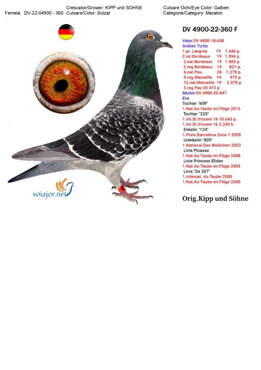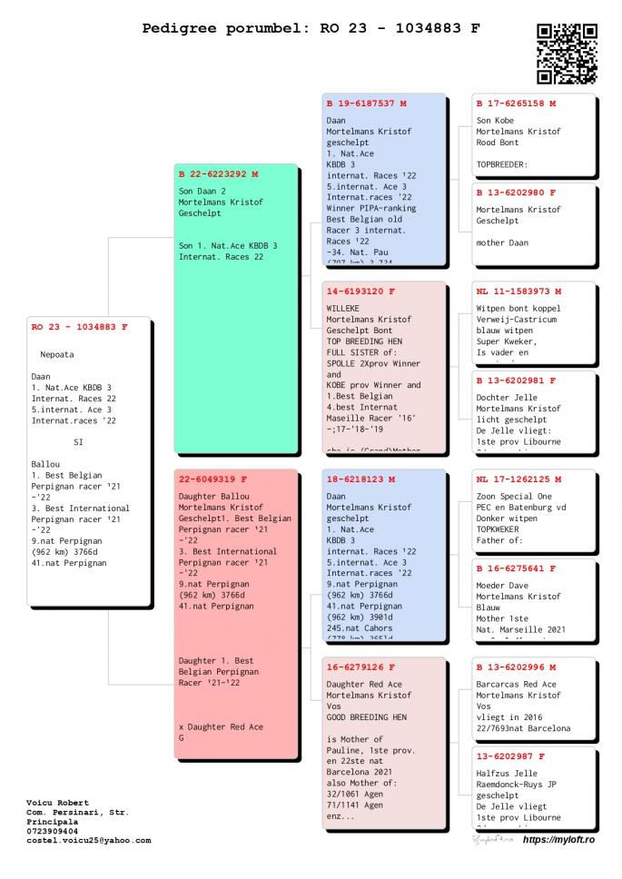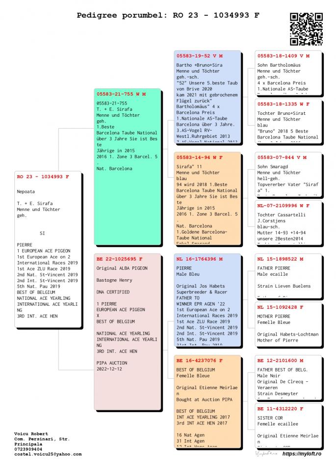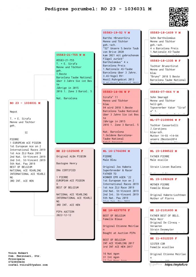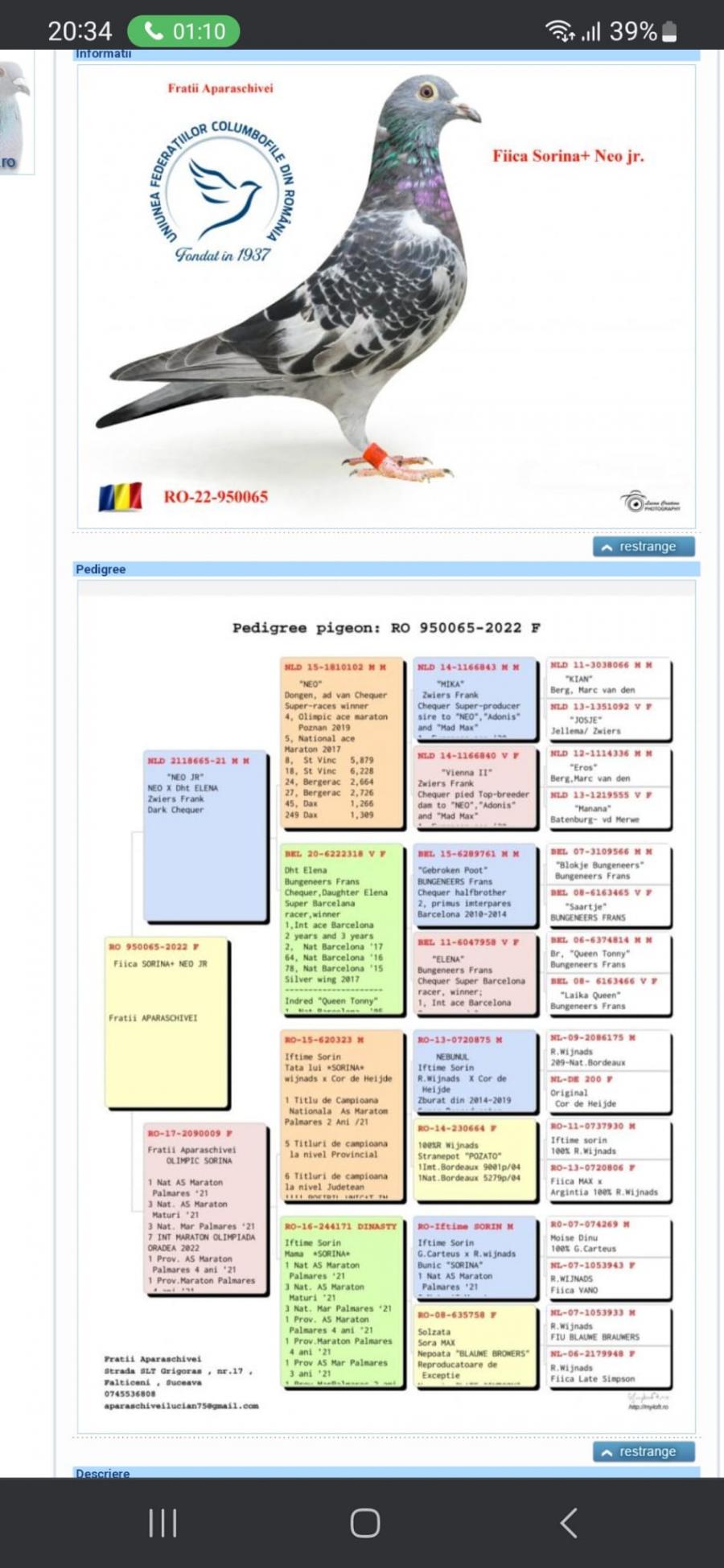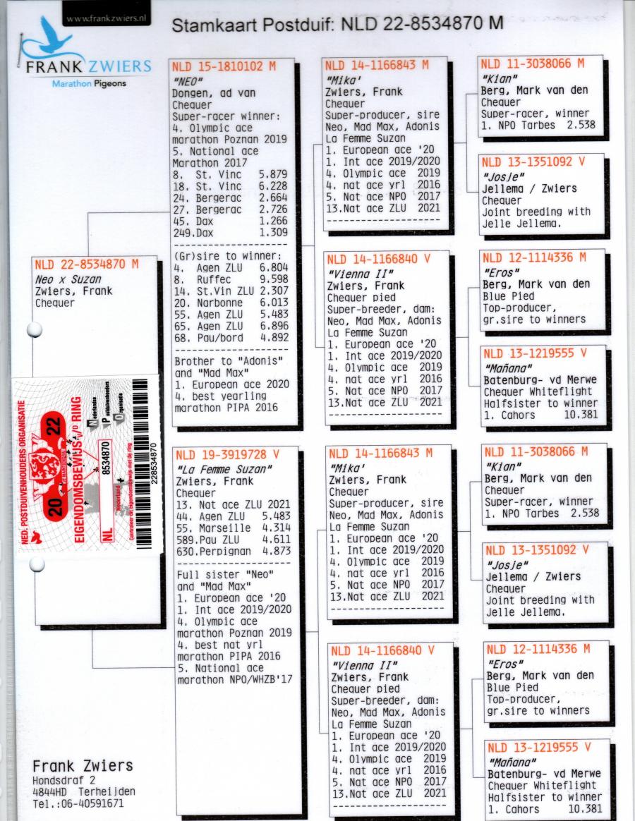 Nepoata PIERRE - SUPER REPRODUCATOR SI ZBURATOR Tata la : WINNER EPR AGEN `22 1st European Ace on 2 International Races 2019 1st ACE Zlu Race 2019 2nd Nat. St. Vicent `19 2nd Int. St. Vicent `19 5 5th Nat. Pau `19