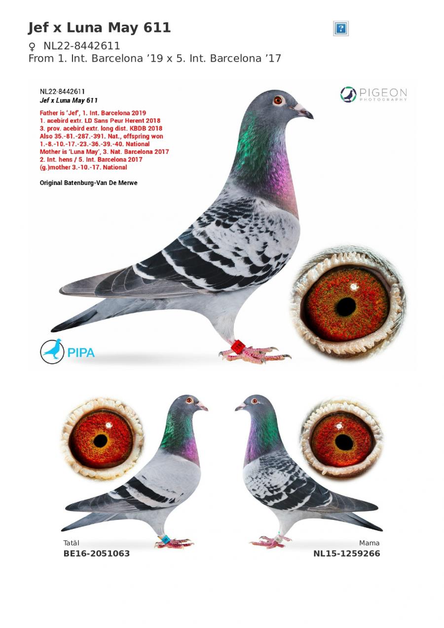 Nepot LUNA-MAY 3 Nationaal 4492p. 5e IntNat. 17094 p. 1270 km Mama la: 88e Nat. Barcelona`20 90e Nat. Agen `20 100e Nat. Perpignan `21 113e Nat. Perpignan `22 170e Nat. Perpignan `22