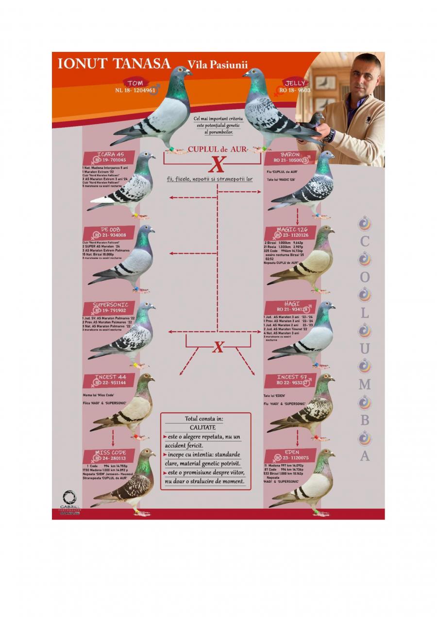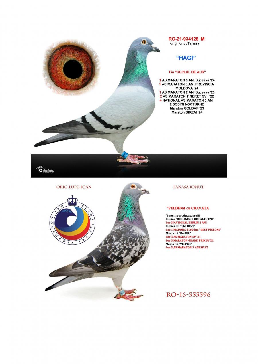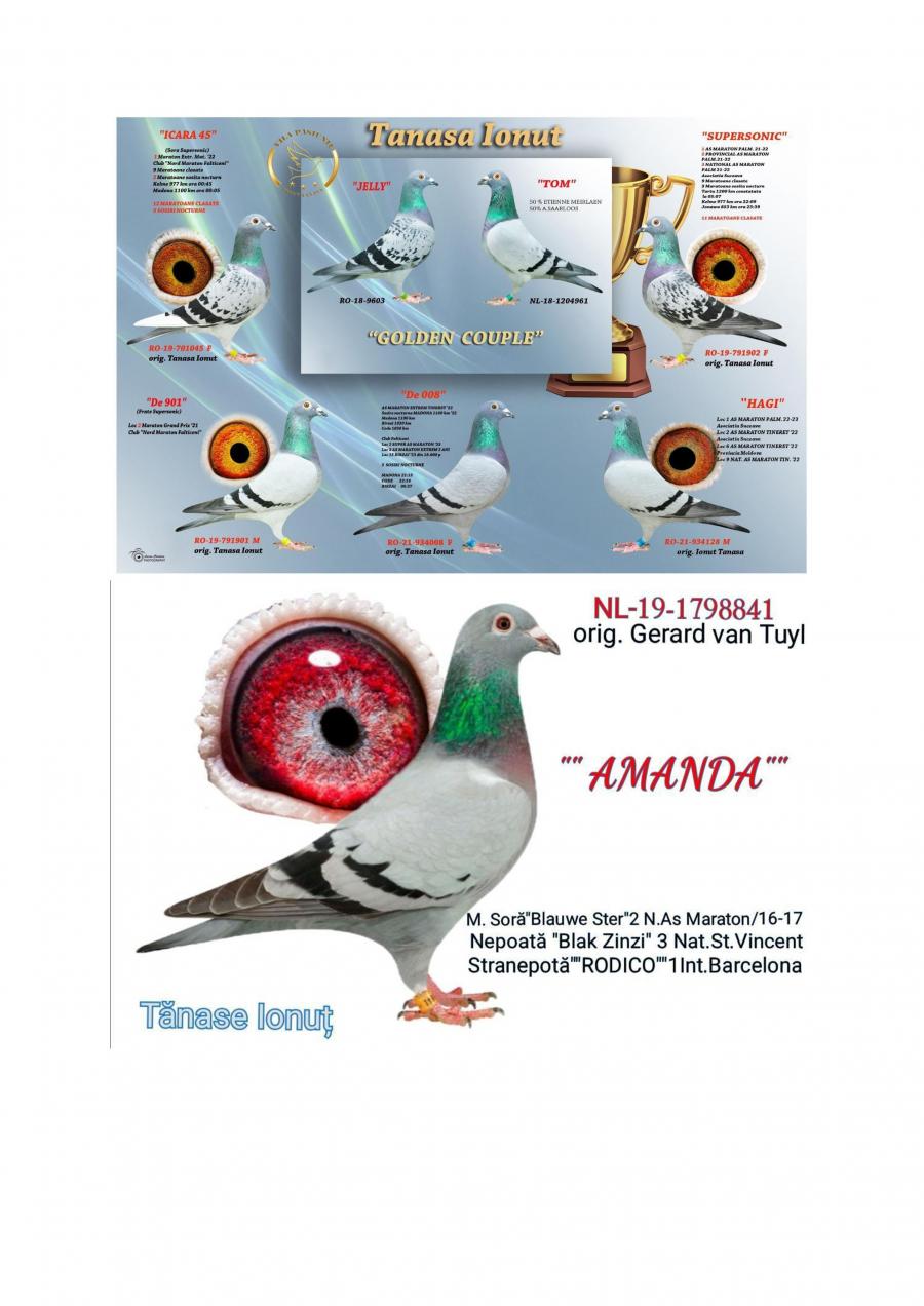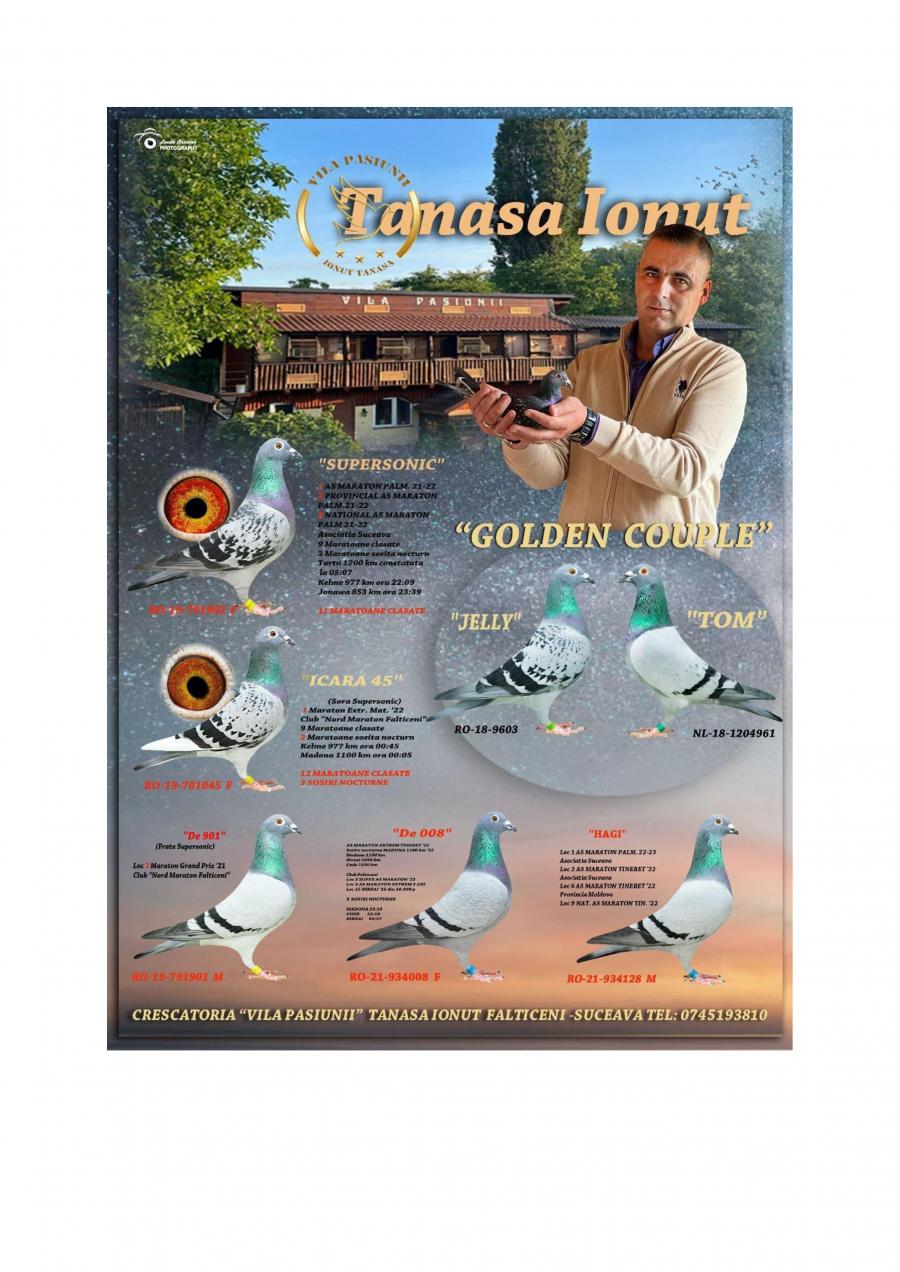 Nepoata ”CUPLU DE AUR”- baza crescătoriei ”VILA PASIUNII” IONUÈš TANASÄ‚ Cuplu care a reprodus campionii: ”SUPERSONIC”: - LOC 1 AS Maraton Palmares 2 ANI AsociaÈ›ia Suceava 21 -22; - LOC 3 AS Maraton Palmares 2 ANI NAÈšIONAL; - 11 Maratoane Clasate; - 3 Maratoane SOSITÄ‚ NOCTURN;