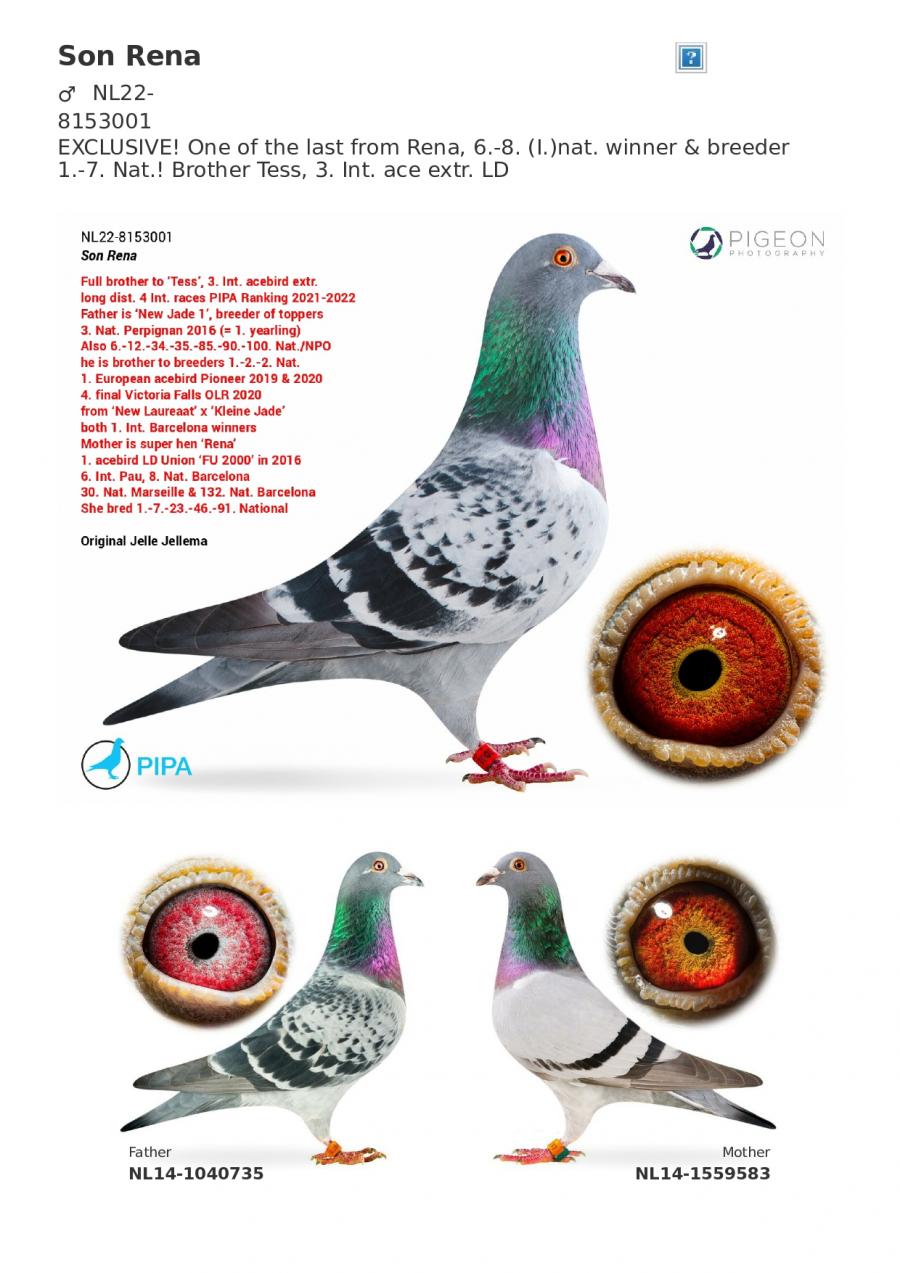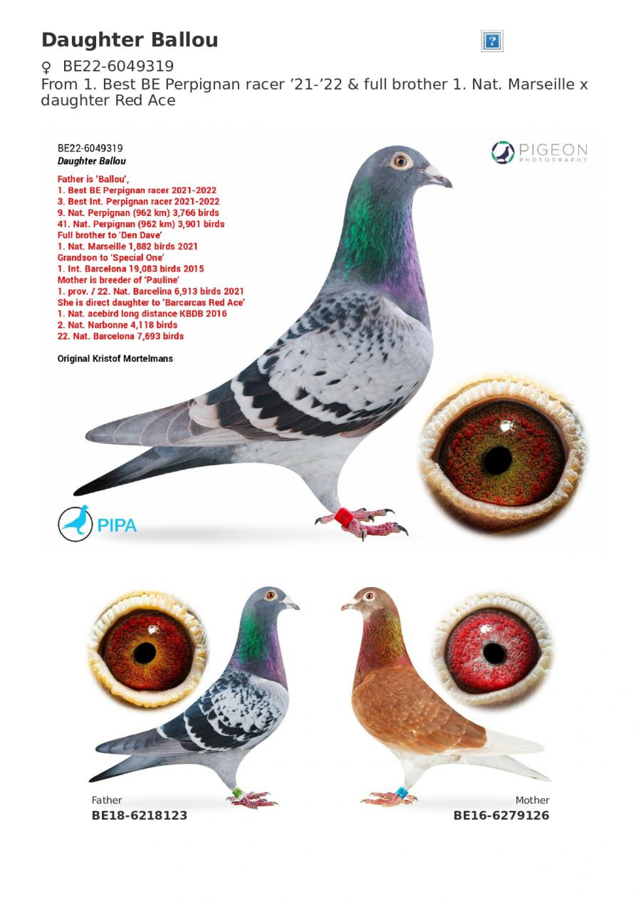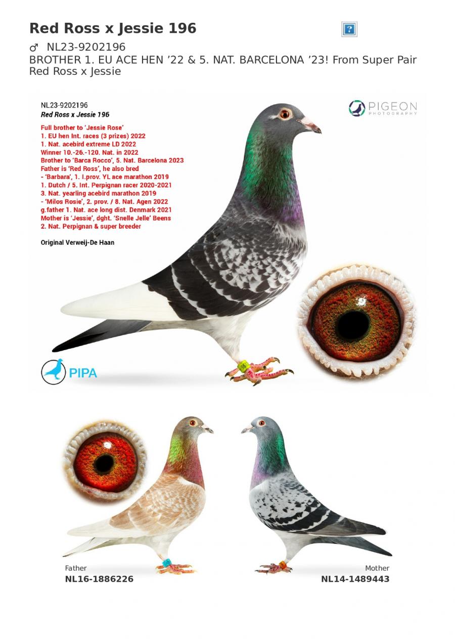 Nepot RED ROSS - SUPER REPRODUCATOR ! Tata la : 1 Europa Ace Hen `22 1 Nat. Acepigeon `22 8 Nat. Agen YL `22 10 Nat. St. Vicent `22 26 Nat. Perpignan `22 35 Nat. Barcelona `22 18 Nat. Agen YL `19