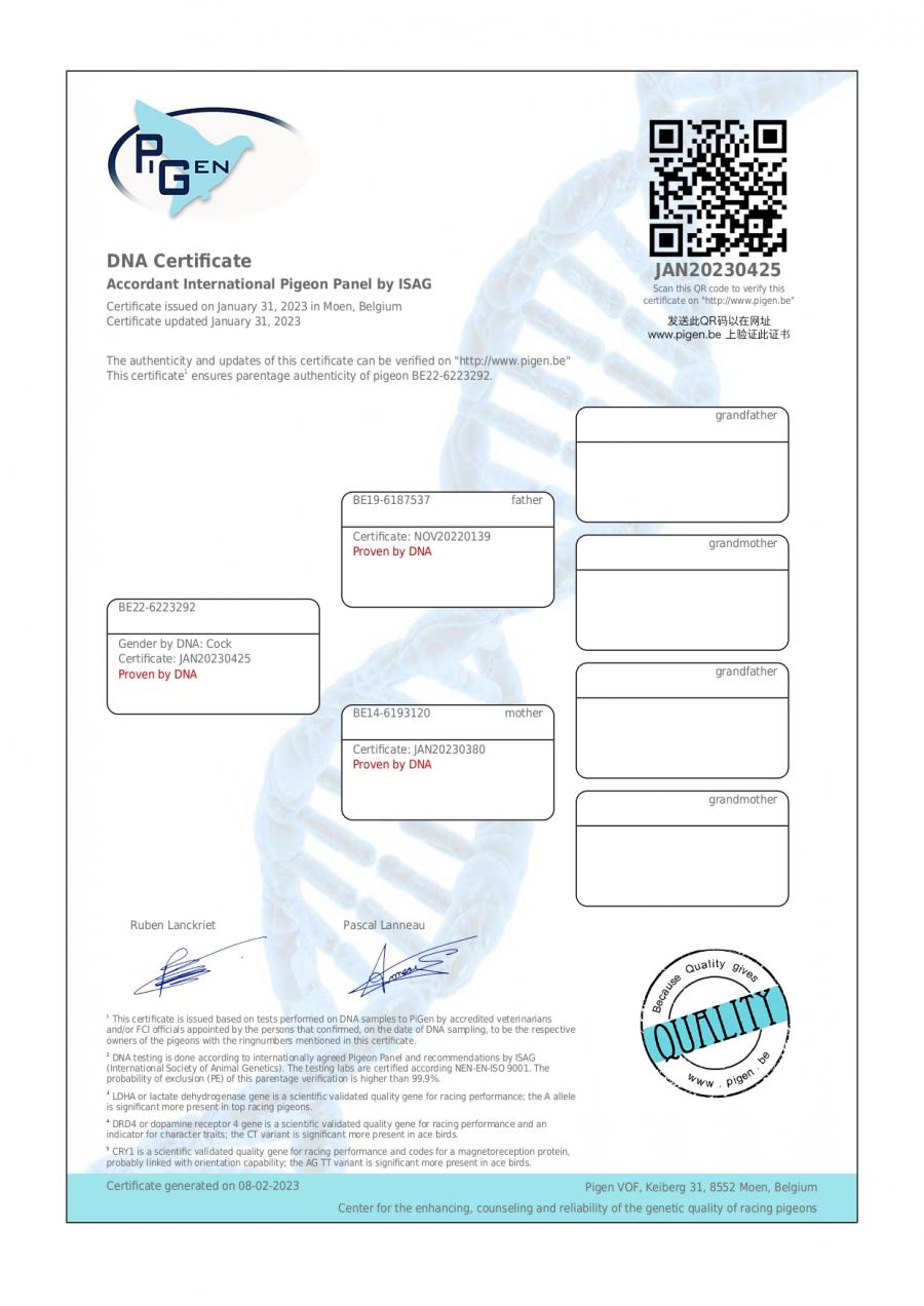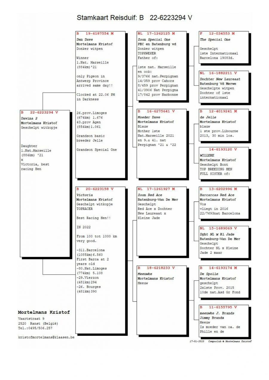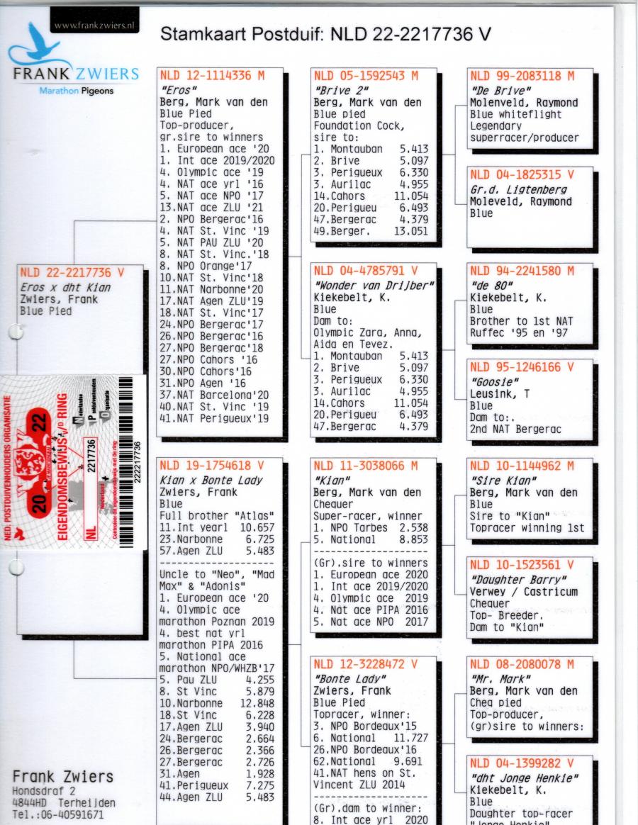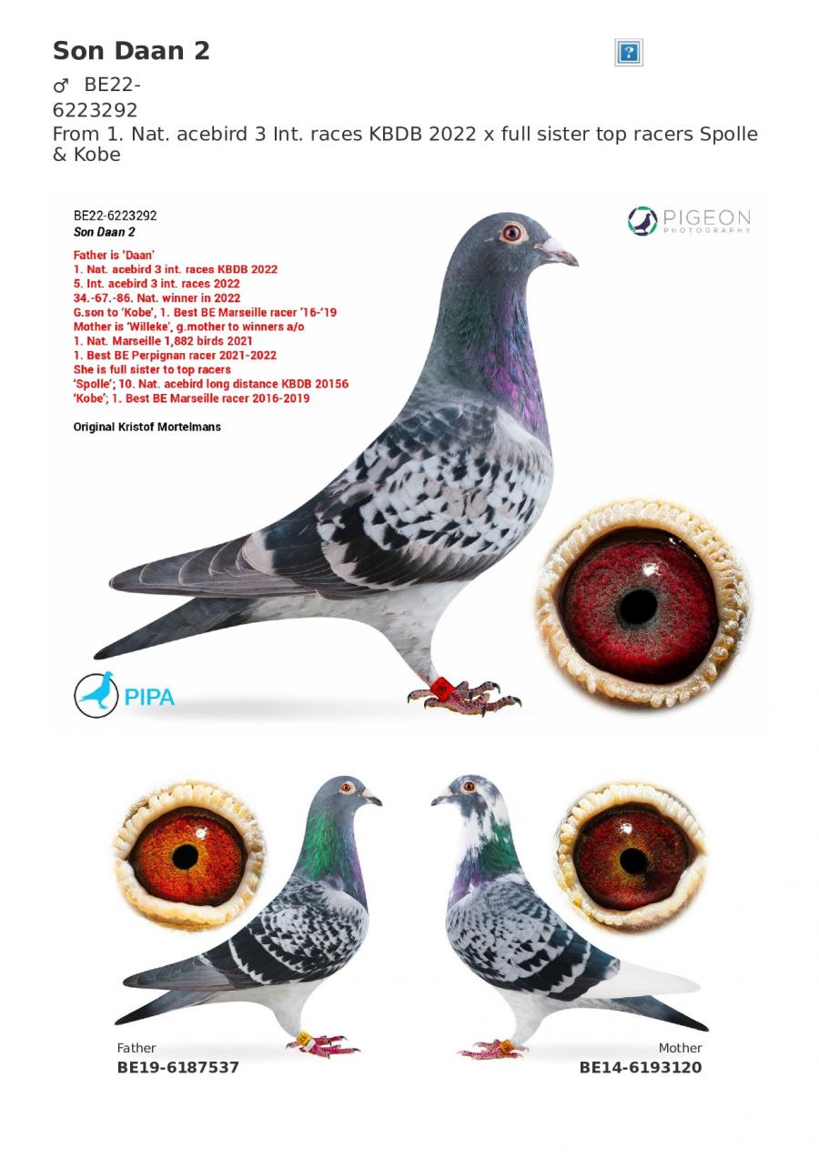 Nepot RED ROSS - SUPER REPRODUCATOR ! Tata la : 1 Europa Ace Hen `22 1 Nat. Acepigeon `22 8 Nat. Agen YL `22 10 Nat. St. Vicent `22 26 Nat. Perpignan `22 35 Nat. Barcelona `22 18 Nat. Agen YL `19