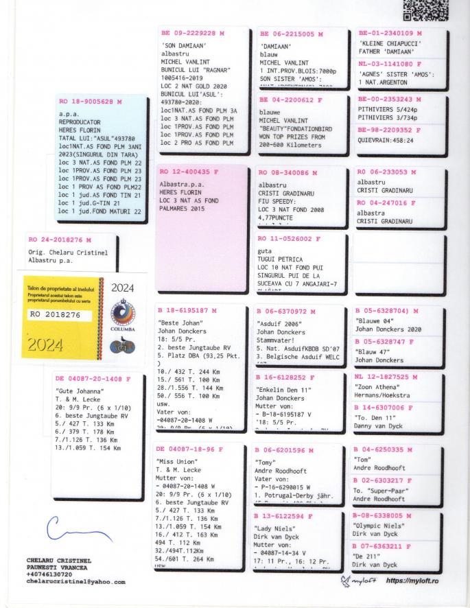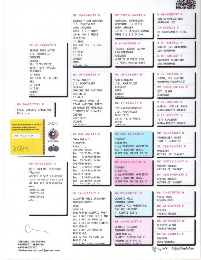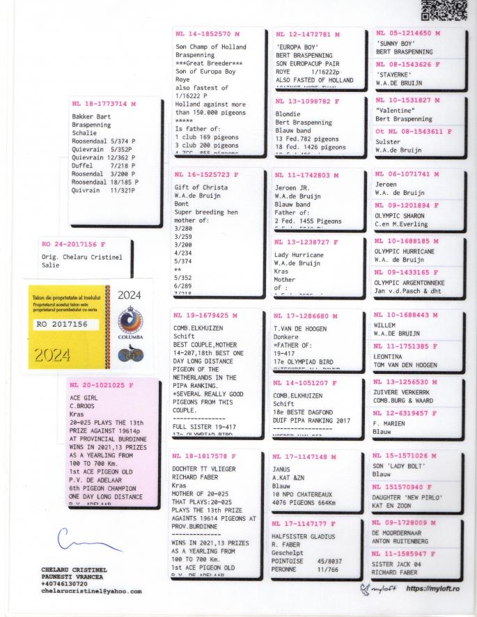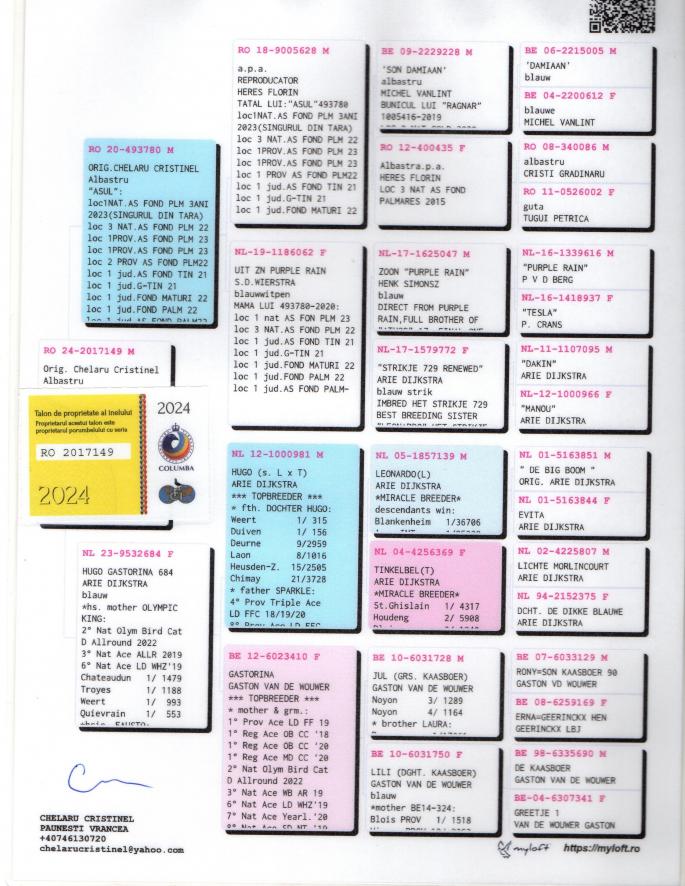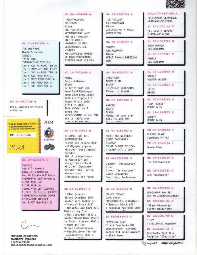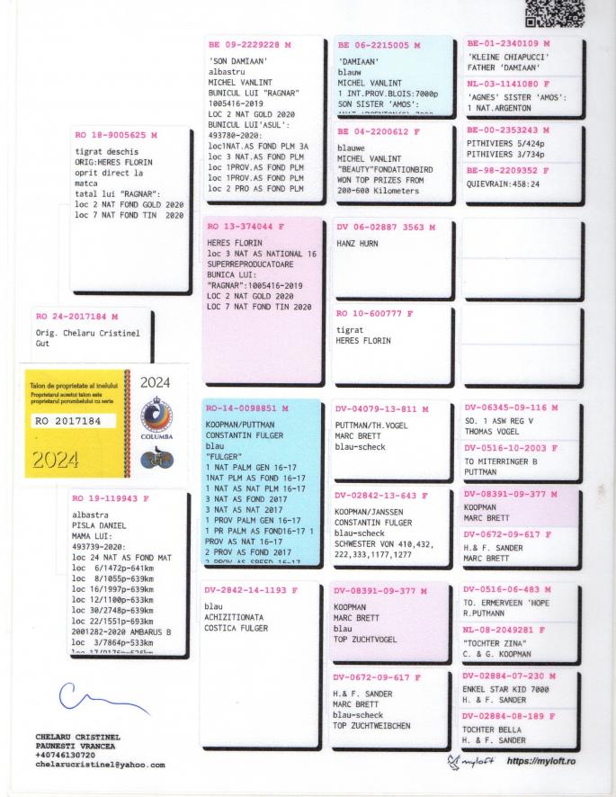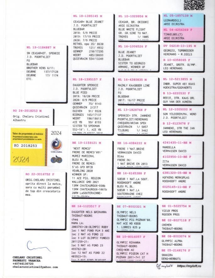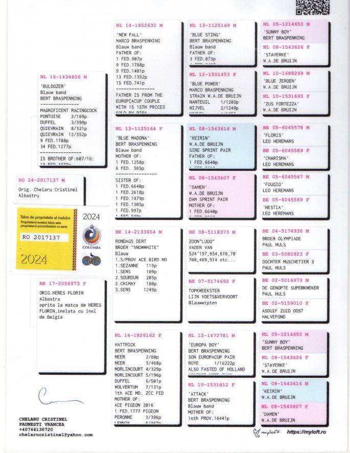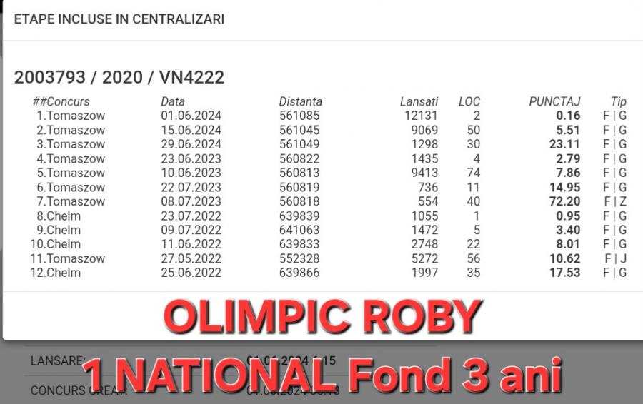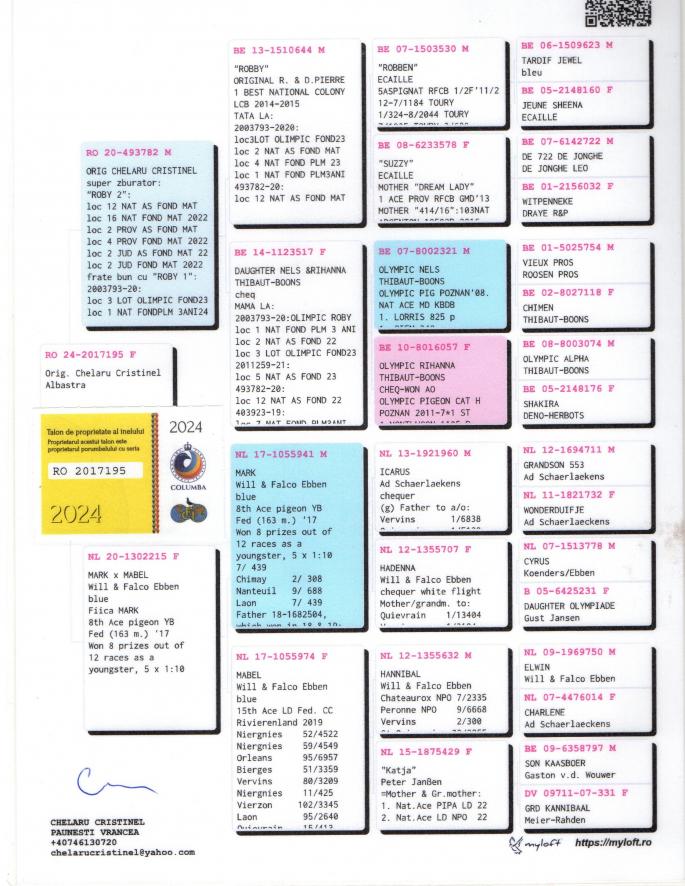 Tata: "ROBY 2": Loc 12 NATIONAL As Fond Maturi 2022 Loc 16 NATIONAL Fond Maturi 2022 Frate “OLIMPIC ROBY”-2003793-20 M Loc 1 NATIONAL Fond Palmares 3 ani 2024 Loc 2 NATIONAL As Fond Maturi 2022 Loc 3 LOT OLIMPIC Fond 2023 Mama : Fiica MARK 8th Ace pigeon YB Fed (163 m.) 17 Won 8 prizes out of 12 races as a youngster, 5 x 1:10 TOP TOP TOP!!! castigator: Kristian2000 |