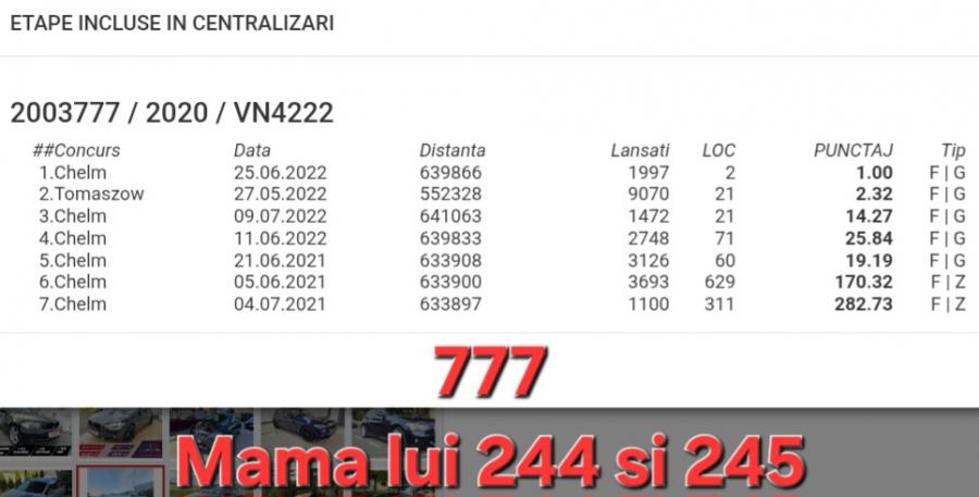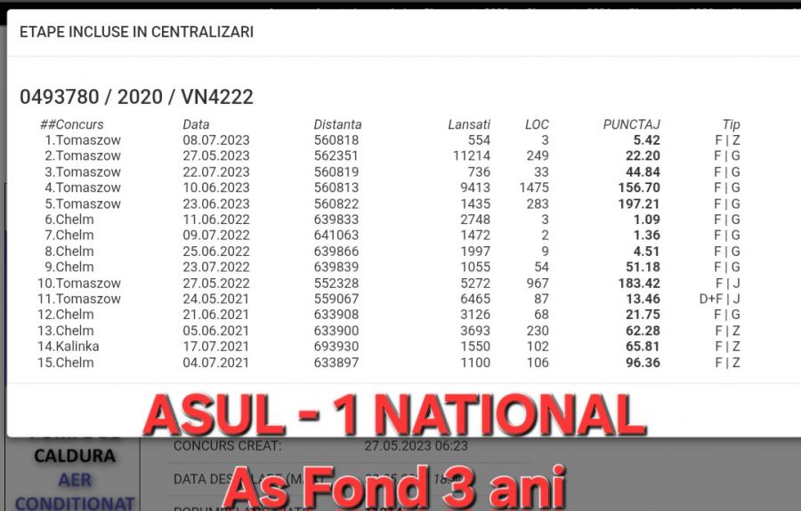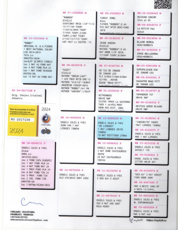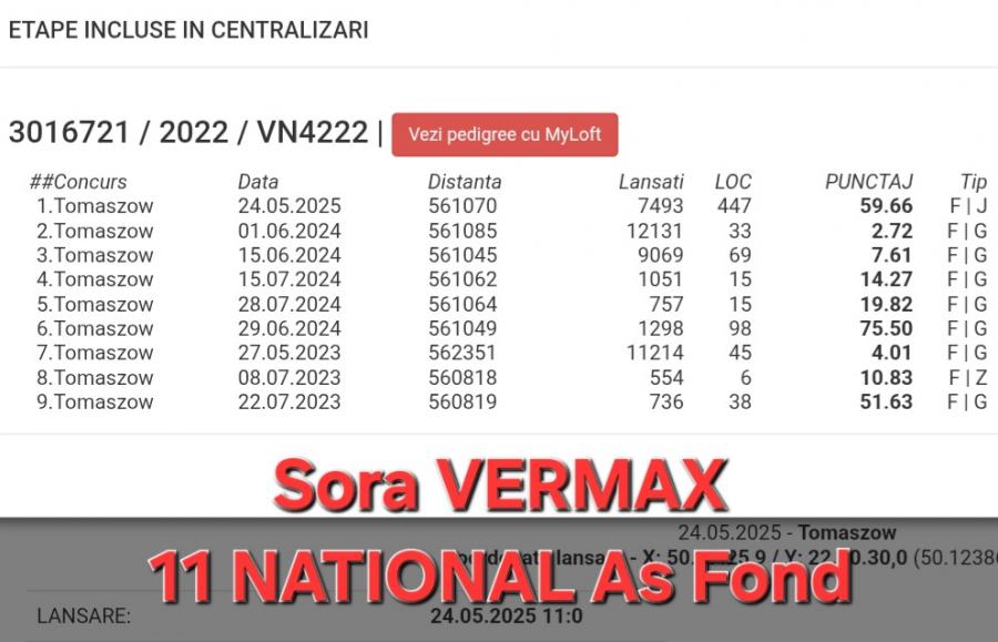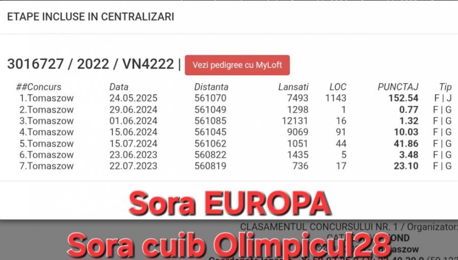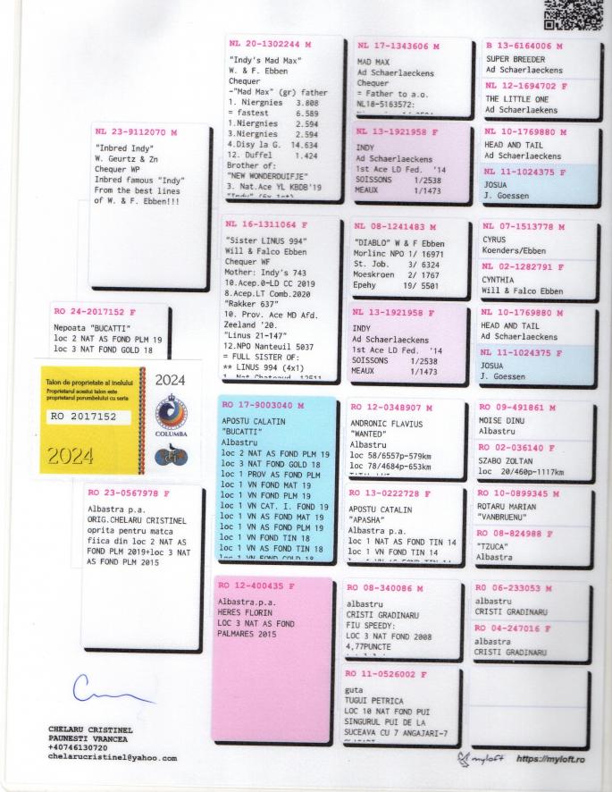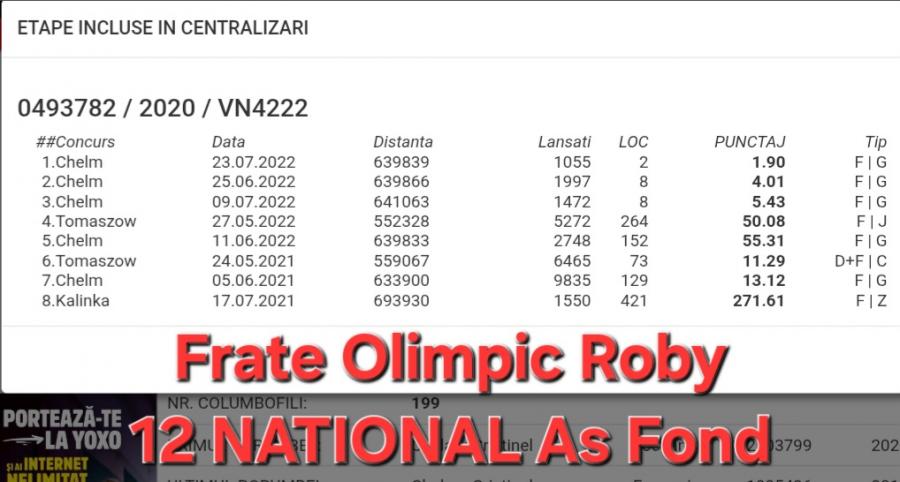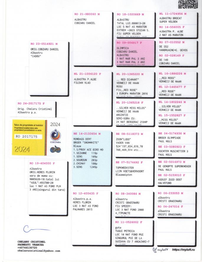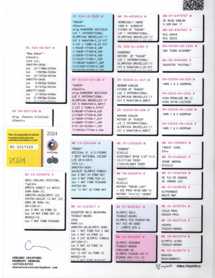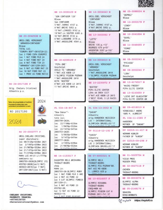 Tata: "ROBY 2": Loc 12 NATIONAL As Fond Maturi 2022 Loc 16 NATIONAL Fond Maturi 2022 Frate “OLIMPIC ROBY”-2003793-20 M Loc 1 NATIONAL Fond Palmares 3 ani 2024 Loc 2 NATIONAL As Fond Maturi 2022 Loc 3 LOT OLIMPIC Fond 2023 Mama : Fiica MARK 8th Ace pigeon YB Fed (163 m.) 17 Won 8 prizes out of 12 races as a youngster, 5 x 1:10 TOP TOP TOP!!! castigator: Kristian2000 |