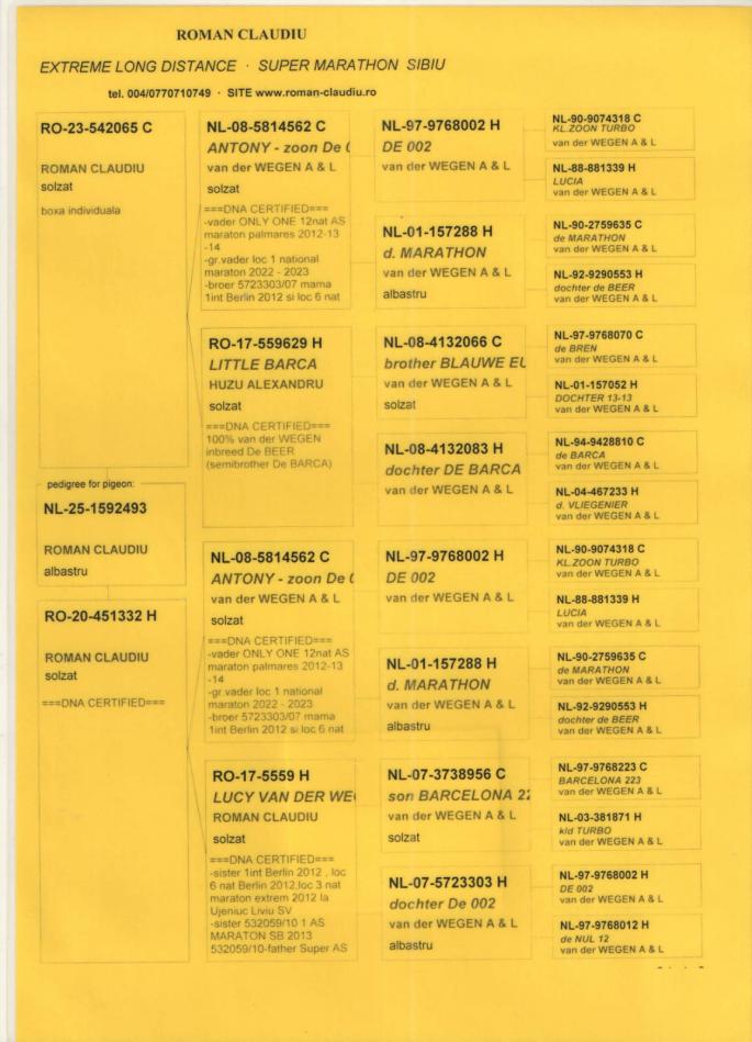 MAMA -100% WEGEN Fiica NL08-5814562 originala WEGEN SUPERBREEDER Bunic 1 National Maraton Palmares 2022-2023 oferta curenta: MATEESCU ADRIAN |