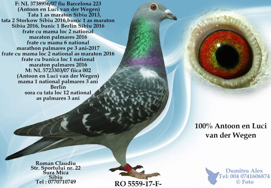 MAMA 100% WEGEN din NL 15-1809459 original Antoon en Luci van der WEGEN (zoon WITPEN BARCELONA) x NL 16-1624729 original Antoon en Luci van der WEGEN oferta curenta: Ionut.porumbel |
