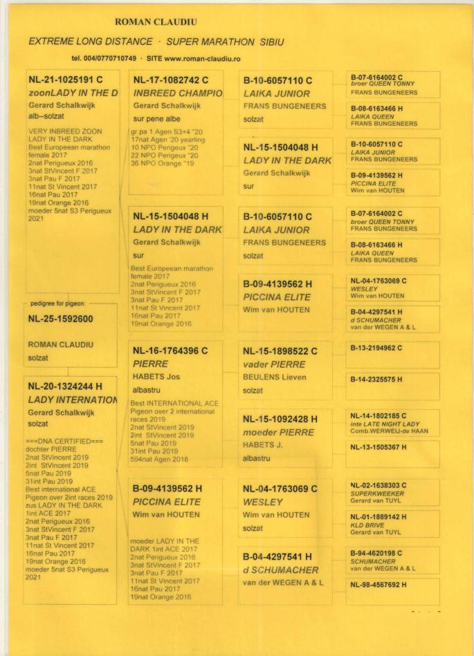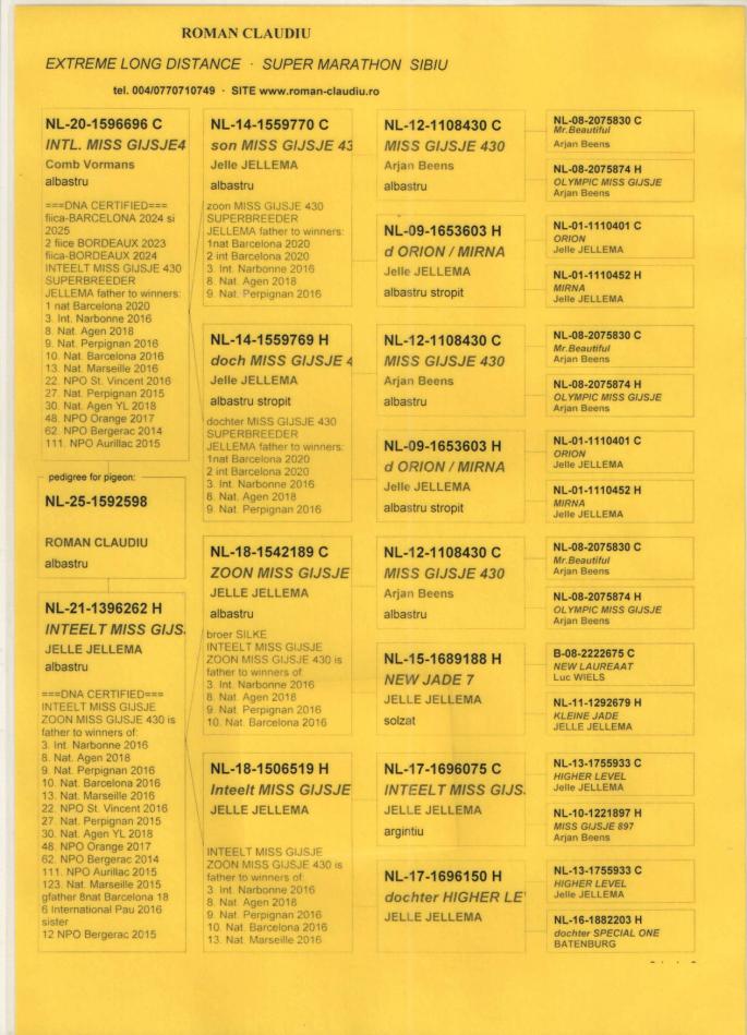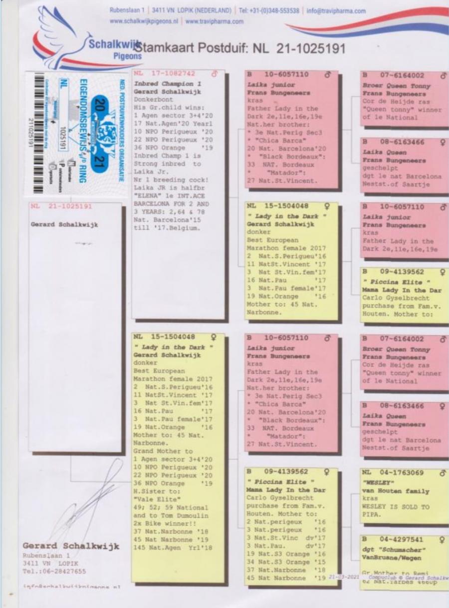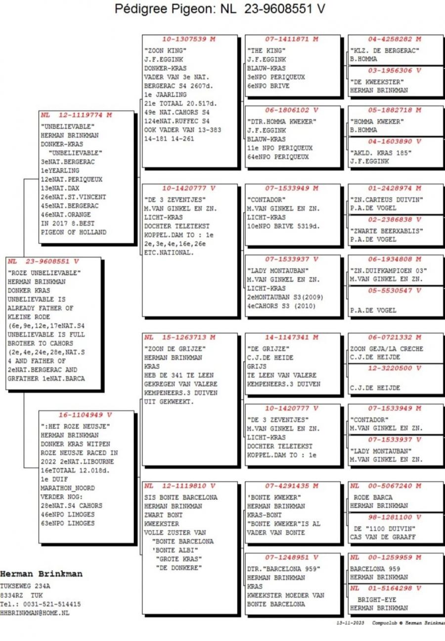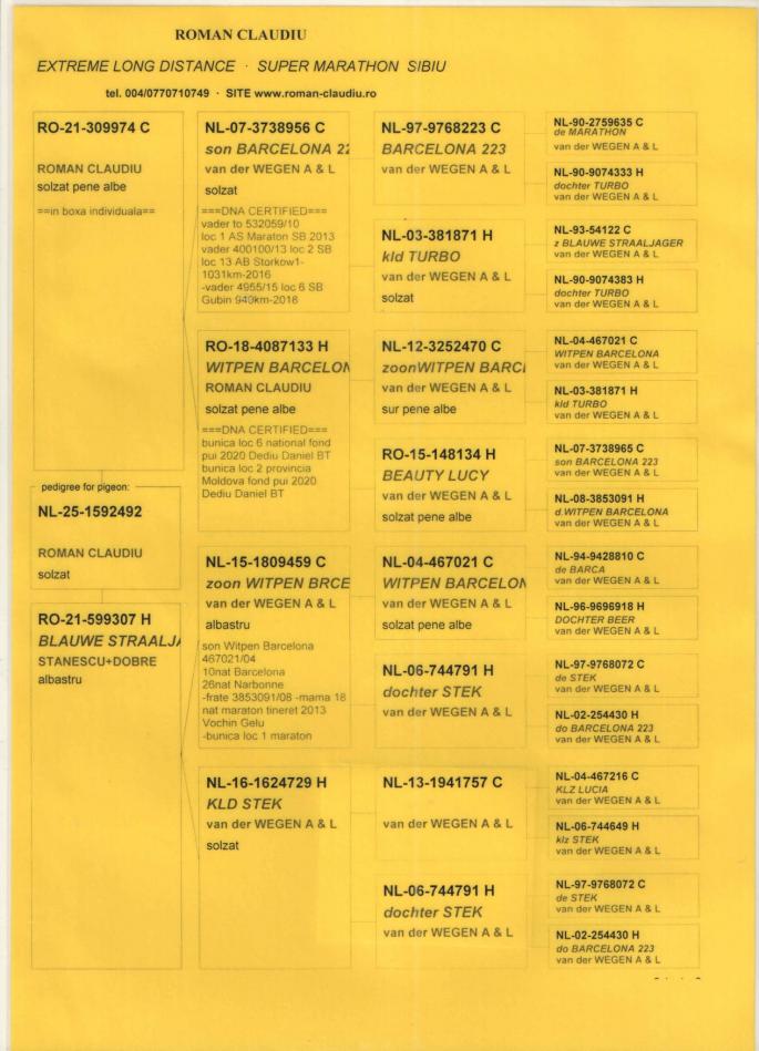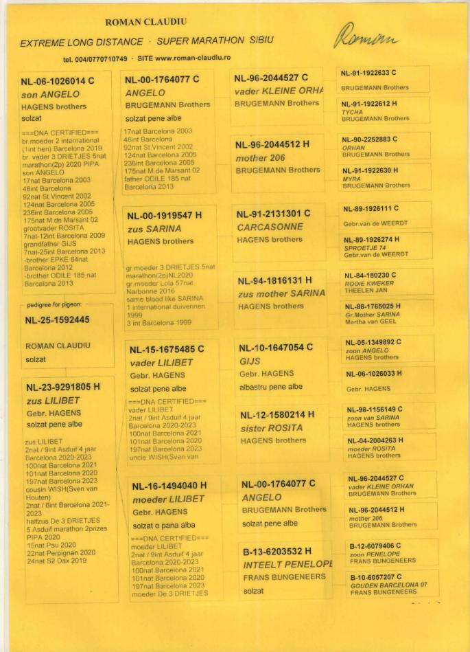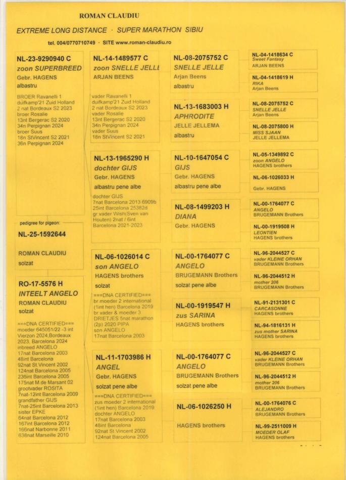 TATA NL 06-1026014 original Gebr.HAGENS (fiu ANGELO x sora SARINA)bunic 3 international VIERZON 2024, BARCELONA 2024.ANGELO e bunic 2 international BARCELONA 2019, 5 national marathon 2020 PIPA(3 DRIETJES), 7 national BARCELONA 2009(ROSITA), 7 national BARCELONA 2013(GIJS), 2 national BARCELONA 2020-2023(LILIBET), vader EPKE, ODILE......