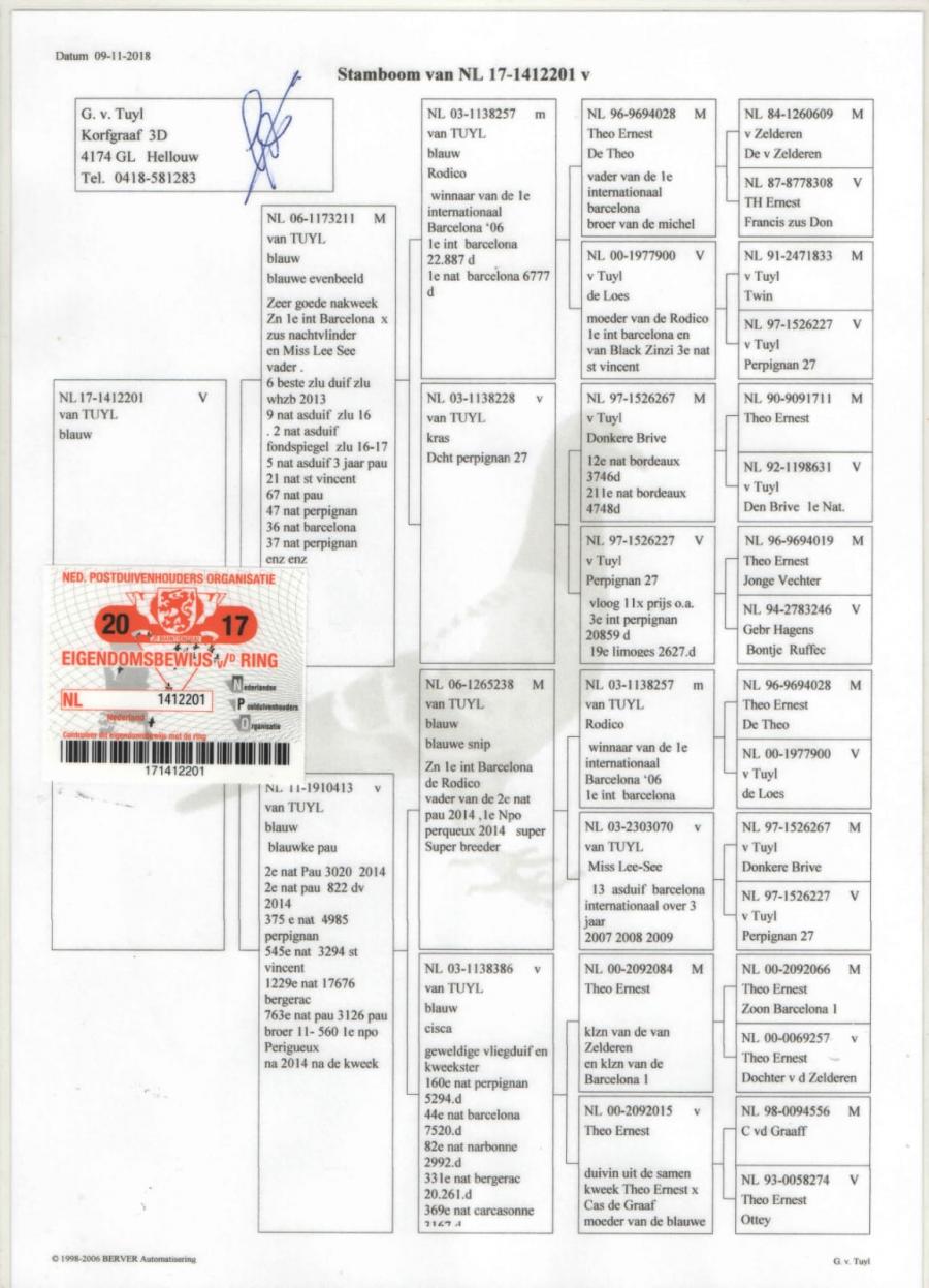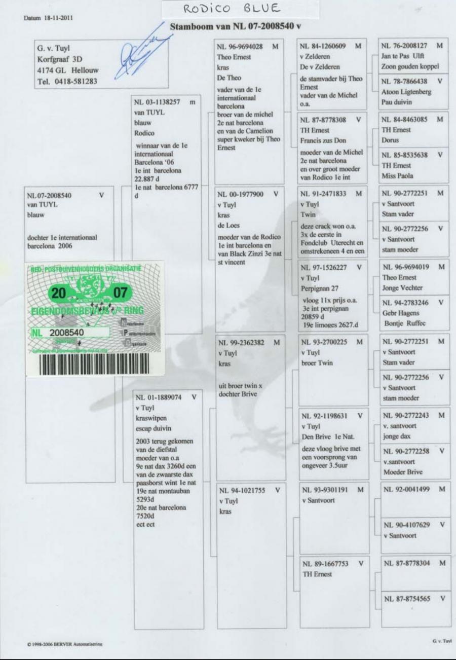 MAMA - 100% Gerard van TUYL, din NL17-1412253 original Gerard van TUYL (fiu BLAUWE EVENBELD si frate BLAUWE STER) x NL 17-1412201 original Gerard van TUYL(fiica BLAUWE EVENBELD) oferta curenta: Iionut |