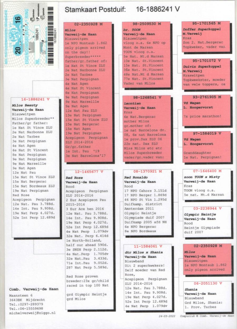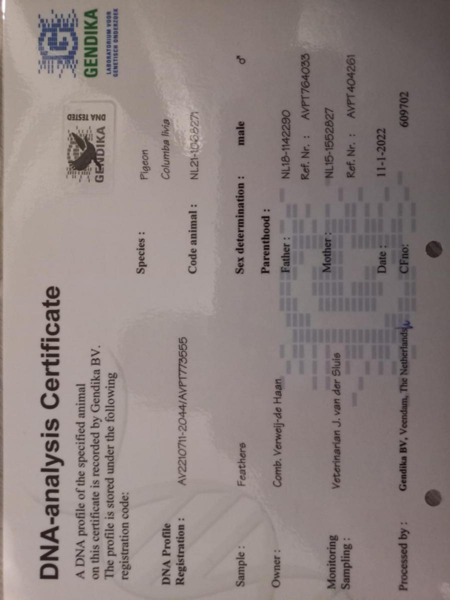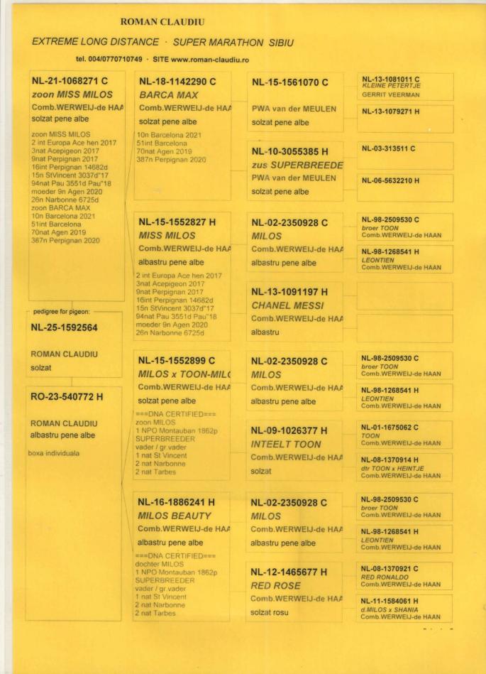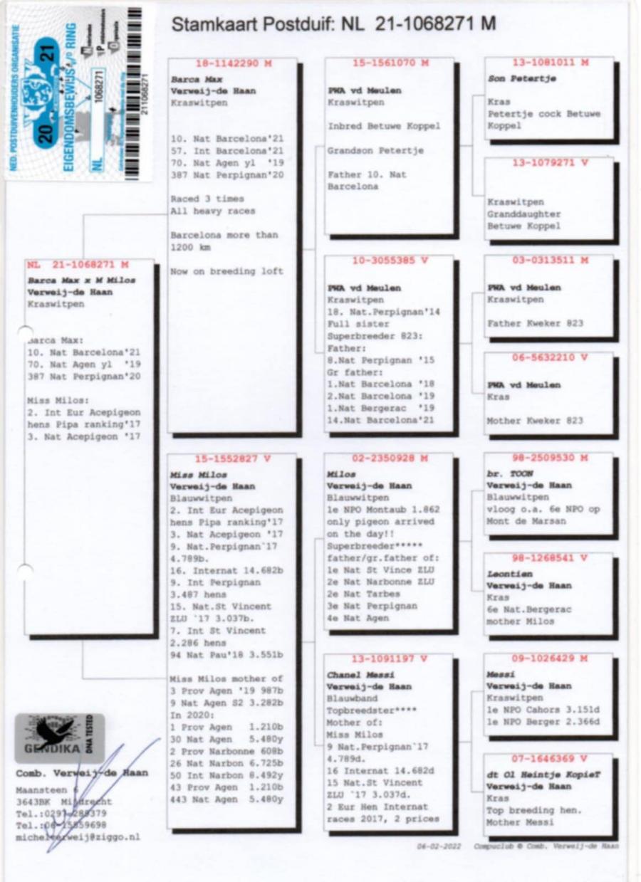 MAMA 100% Comb.WERWEIJ de HAAN din NL 15-1552899 original Comb.WERWEIJ de HAAN (fiu MILOS x INTEELT TOON) x NL 16-1886241 original Comb.WERWEIJ de HAAN (fiica MILOS x RED ROSE)