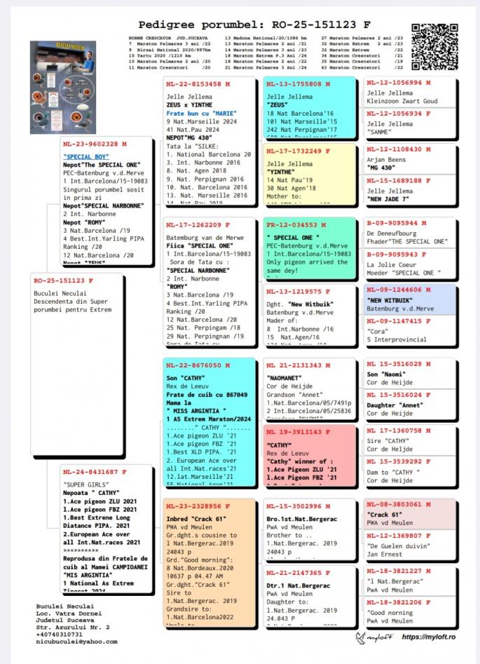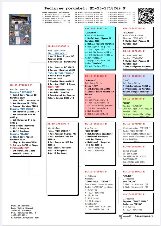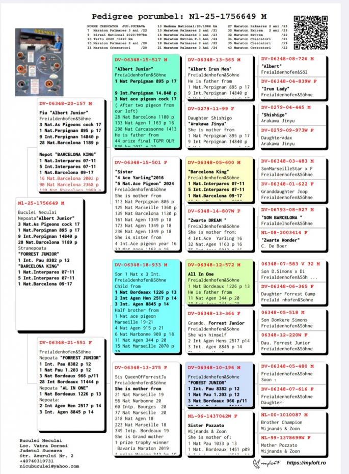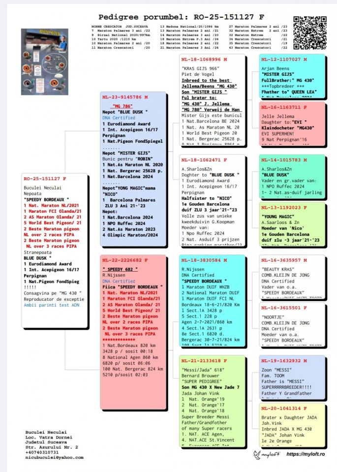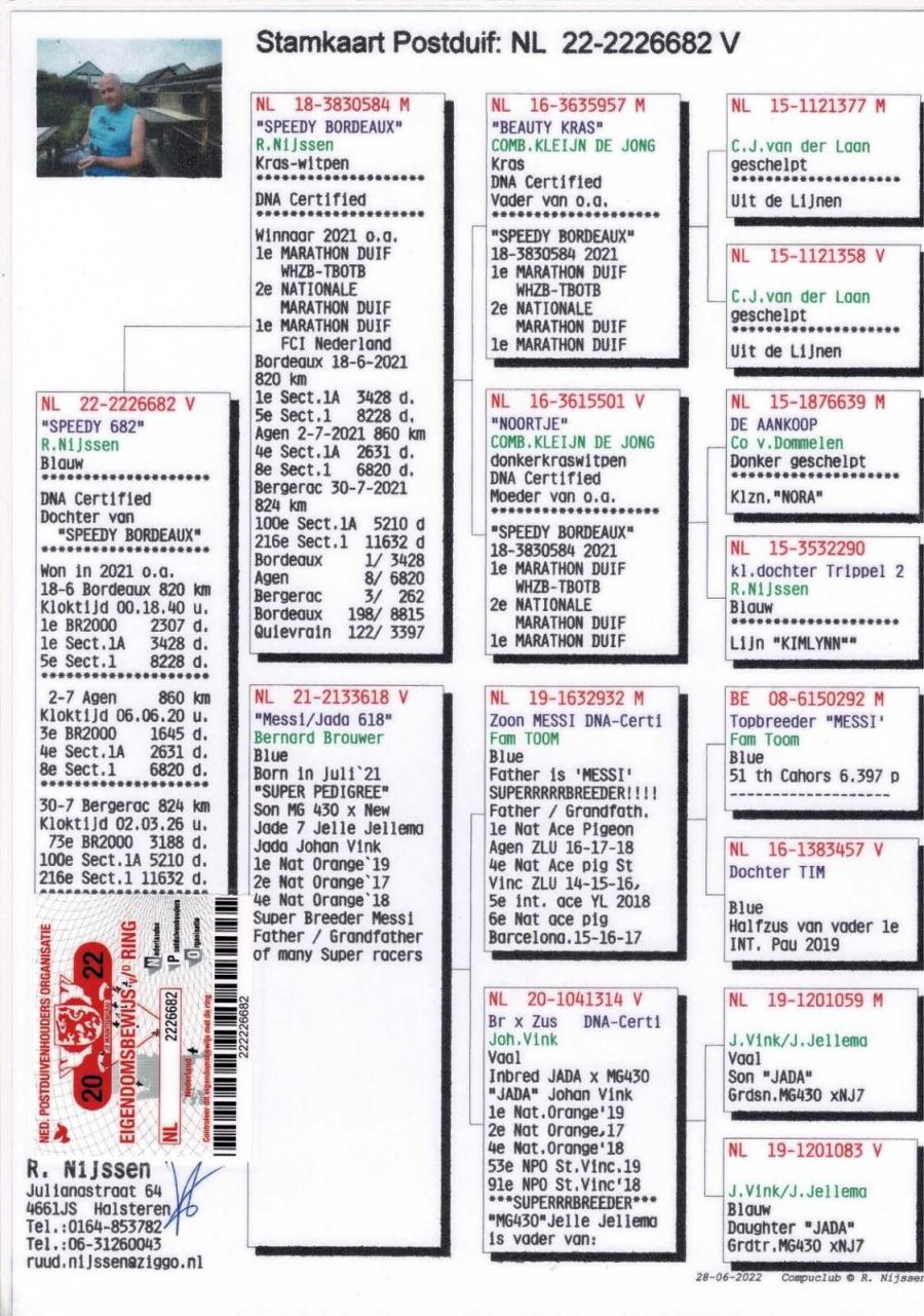 Nepoata SPEEDY BORDEAUX 1 Nat. Maraton NL `21 1 Maraton FCI Olanda `21 2 AS Maraton Olanda `21 5 World Best Pigeon `21 2 Beste Maraton Pigeon NL Over 2 races Pipa 2 Beste Maraton Pigeon NL 3 races Pipa
