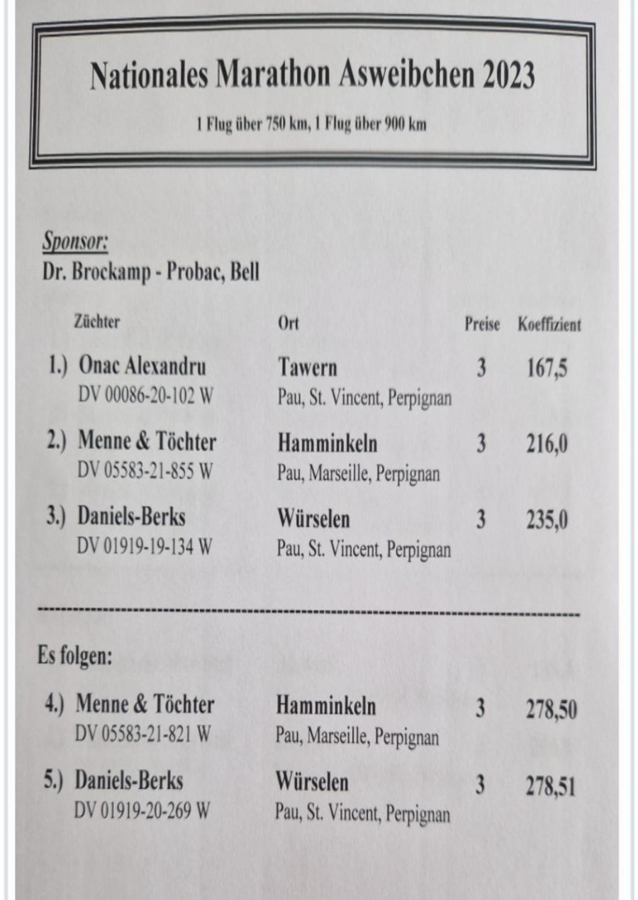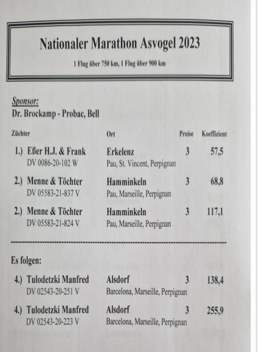 Nepot PAULI - Menne und Tochter 3 Nat. AS Maraton Palmares 2022-2023 7 AS Vogel Der Int. Fluge 321 9 AS Maraton 2022