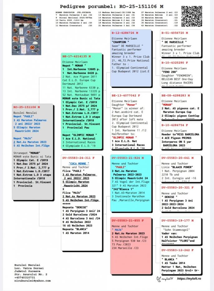 Mama este Fiica Zwart Roosje - 7 Nat. Narbonne 5042 p. Nepoata Skyfall - 2 Nat. Maraton 2014 9 Nat. Perpignan 2014 12 Nat. Marseille 2014 Bunica este stranepoata Rodico - 1 Int. Barcelona 22,887 p. 1186 km & reproducator de exceptie oferta curenta: Cotto |