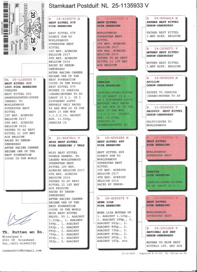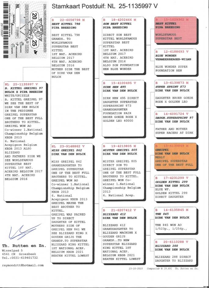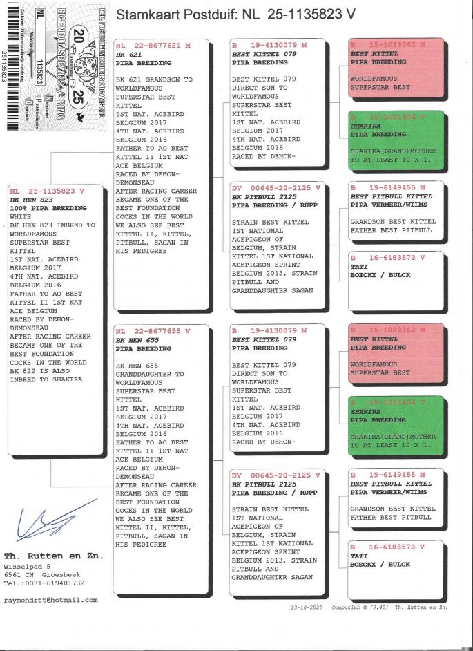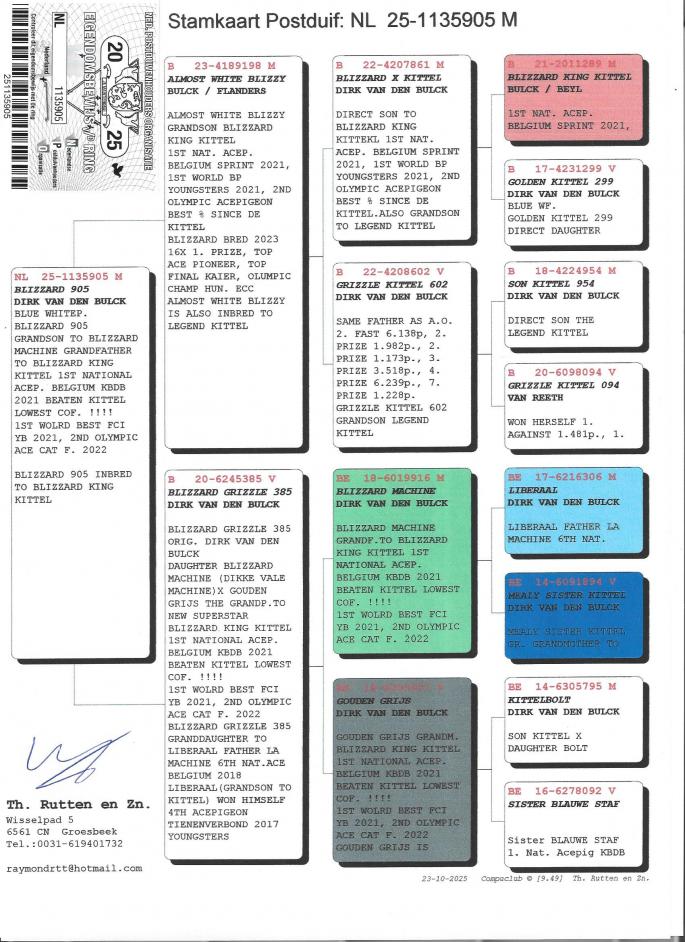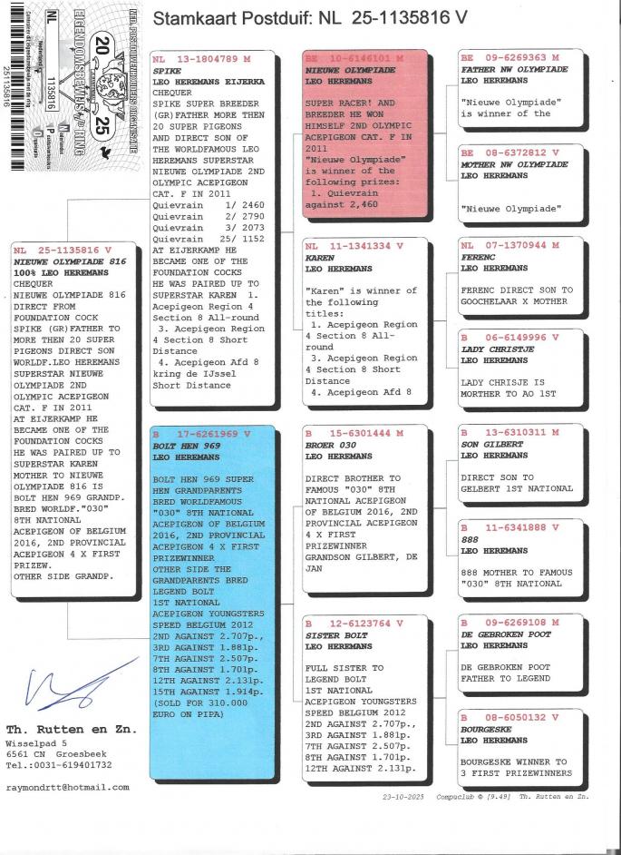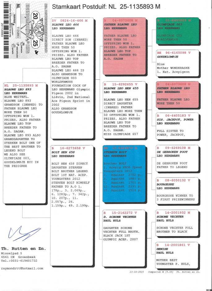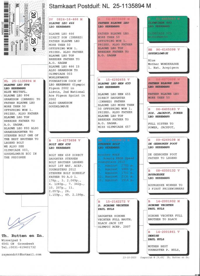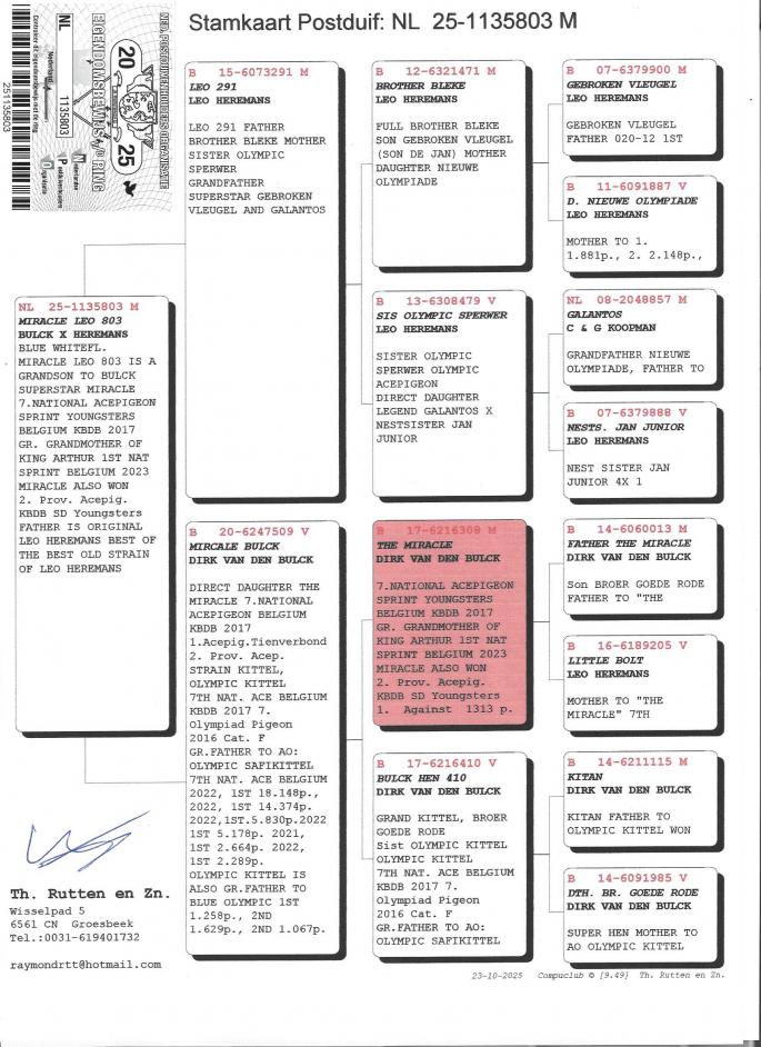 Tatal este original Leo Heremans, stranepot Niewe Olympiade 2 Olimpic Cat F Poznan 2011 1. Quievrain 2460 p. 2. Quievrain 2790 p. 3. Quievrain 2073 p. Niewe Olympiade este bunic si strabunic la 1 Nat. As Demifond Portugalia 2016 1. Tullamore 20315 p. 1. Chalons 20306 p. Mama este 100% Dirk van den Bulck, fiica The Miracle 7 Nat. As Porumbel Viteza Pui The Miracle este strabunica lui King Arthur 1 Nat. Viteza Belgia 2023