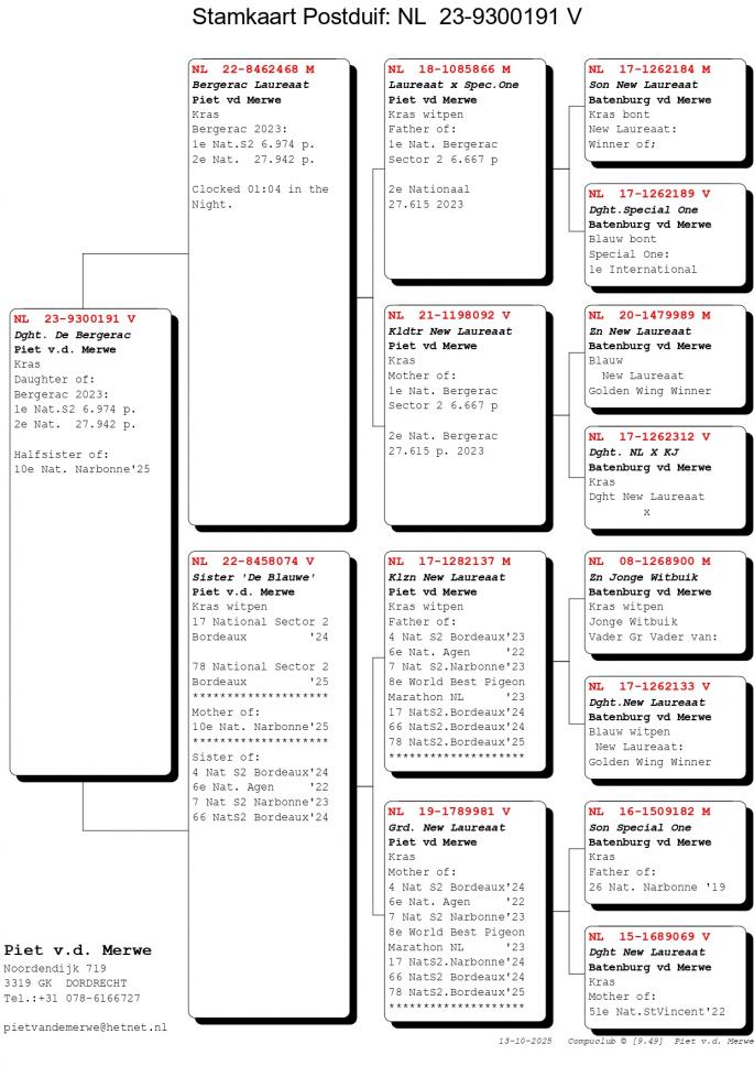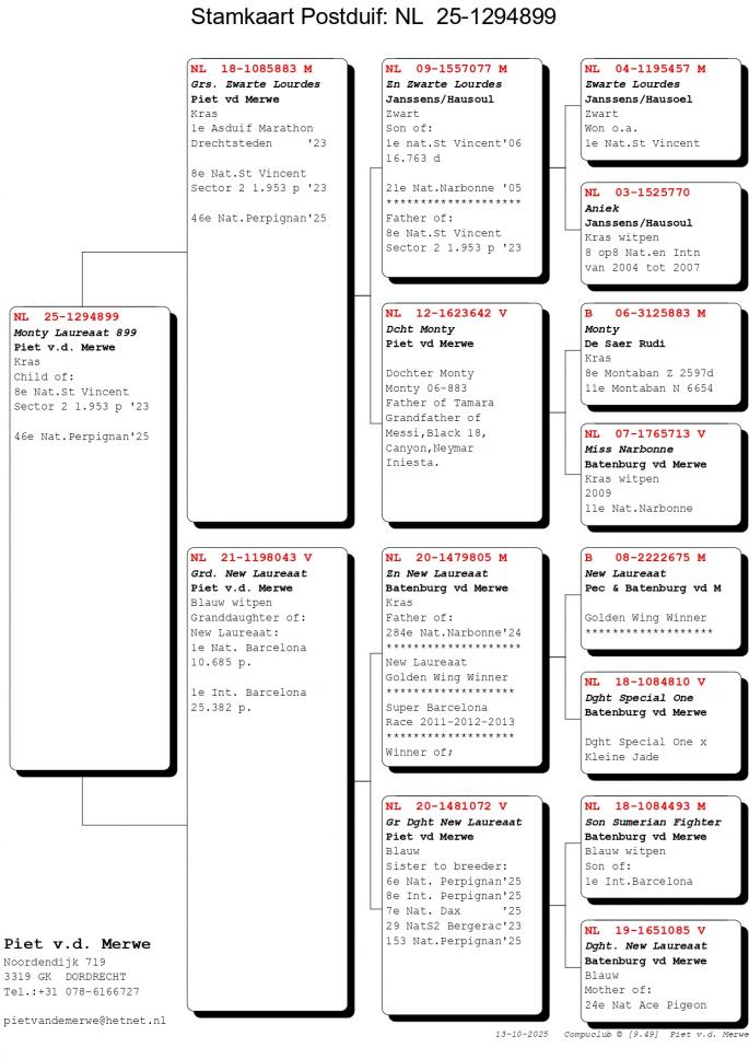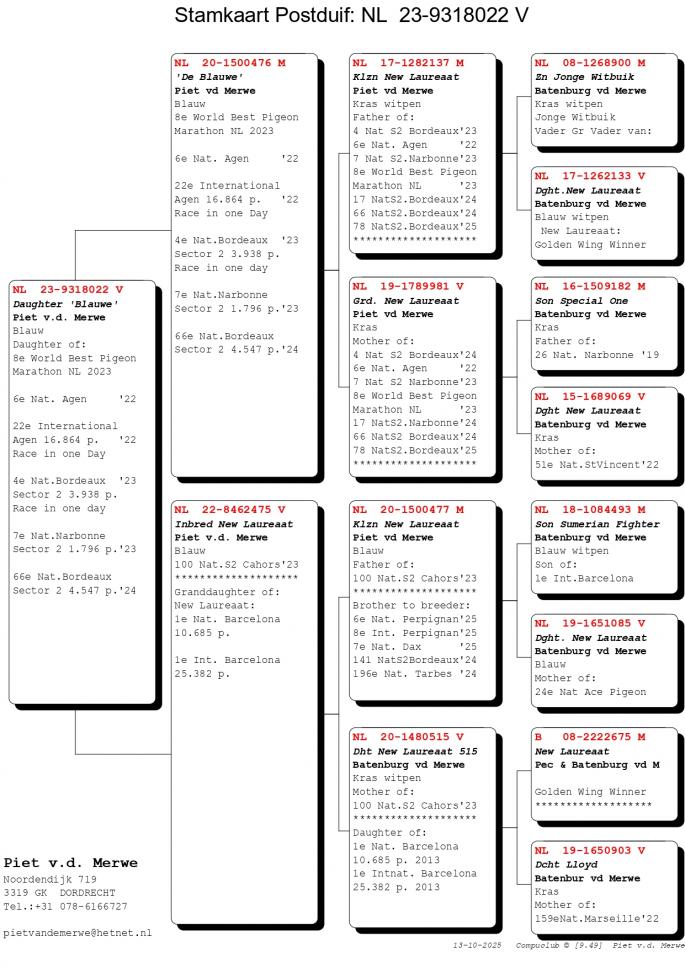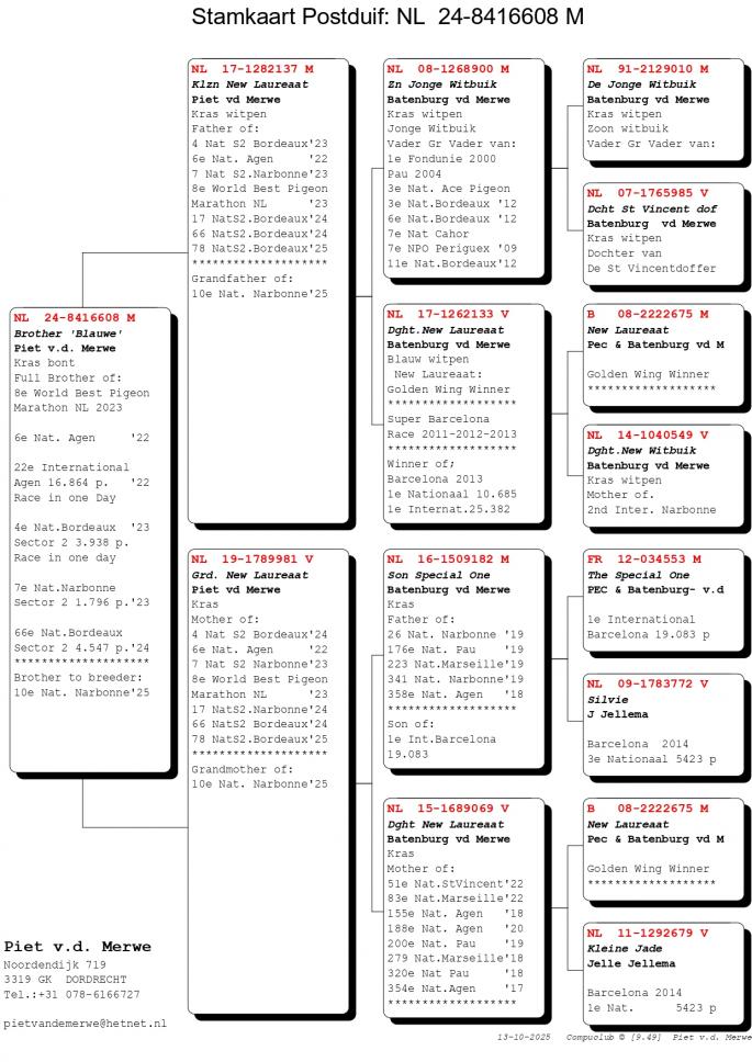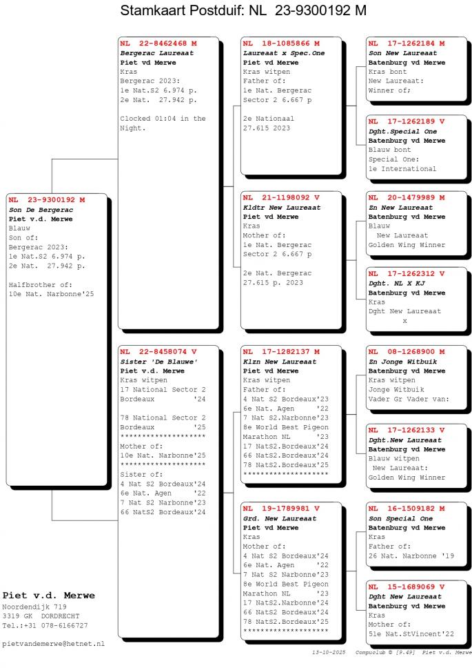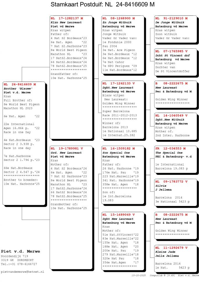 Pentru cei care il cunosc mai putin sau deloc pe Piet van de Merwe, acesta este tatal Anitei, sotia celebrului Hugo Batemburg (Batemburg van de Merwe). In urma cu cativa ani a concurat doar la etapele de 100-700 km. A luat decizia de a trece la maratoanele NPO, cele cu lansare intarziata. Avand in spate pe celebrul lui ginere, Hugo Batemburg, a fost doar un pas pana cand in volierele lui Piet au poposit fii si fiice din cei mai celebri porumbei ai momentului: New Laureeat, New Remy, Special One si desigur, Jonge Witbuik un reproducator fenomenal. Un alt porumbel exponential a fost achizitionat de catre Piet si anume celebrul Etterbac al lui Vrosch-Meijers - 1 Int. Barcelona 2005-2007! Rezultatele lui Piet nu au intarziat sa apara, astfel in 2019 a avut un sezon de succes, cu rezultate de varf la etapele NPO.