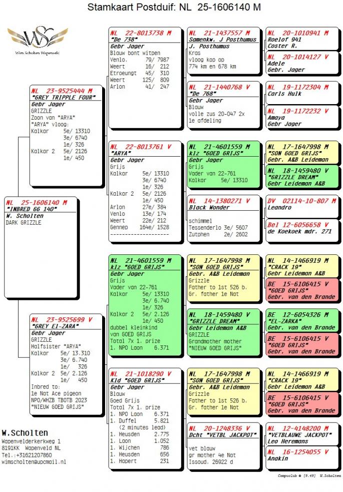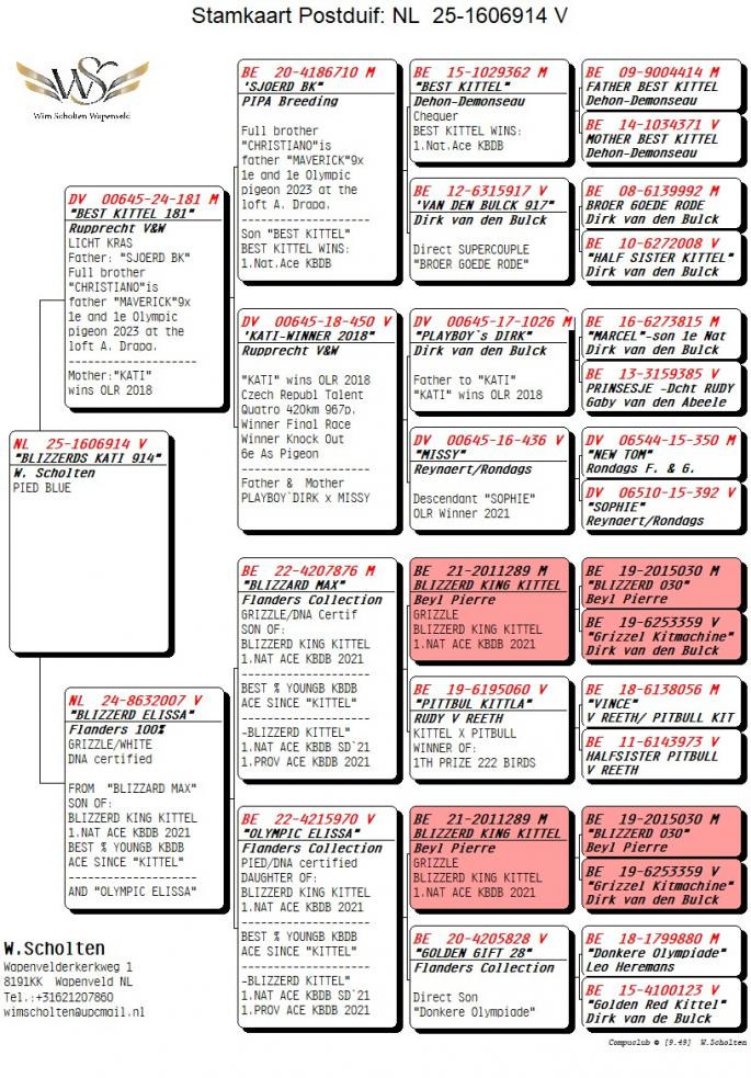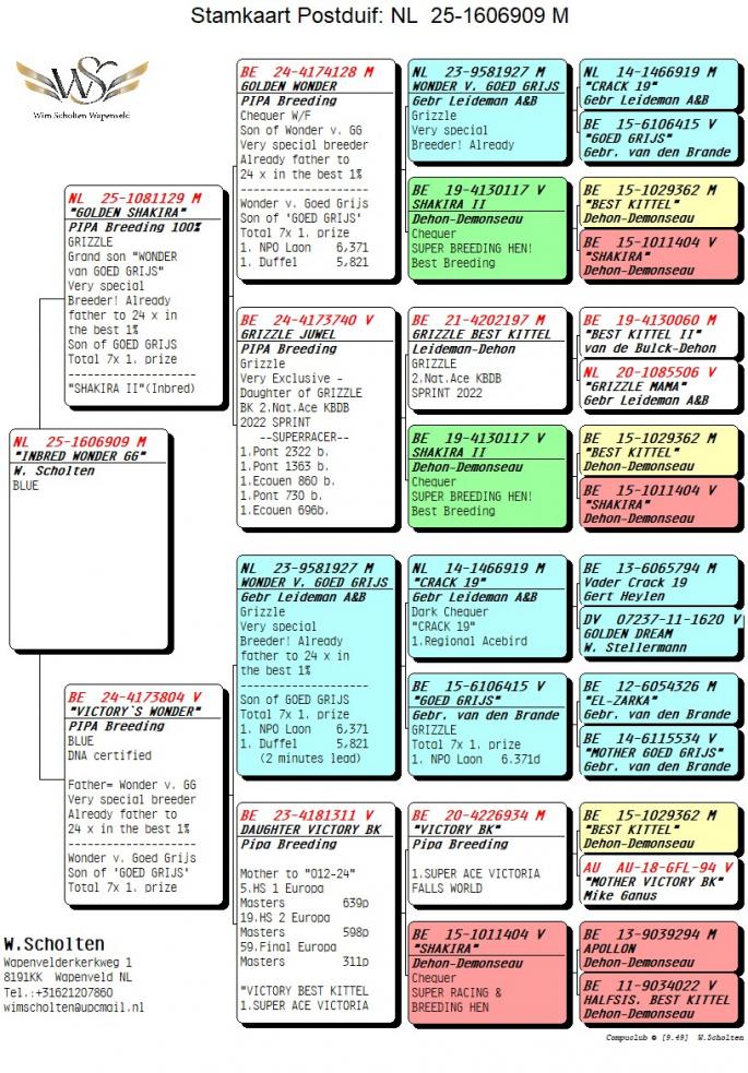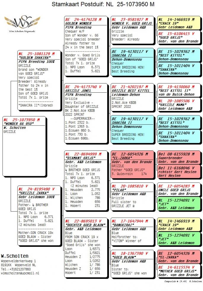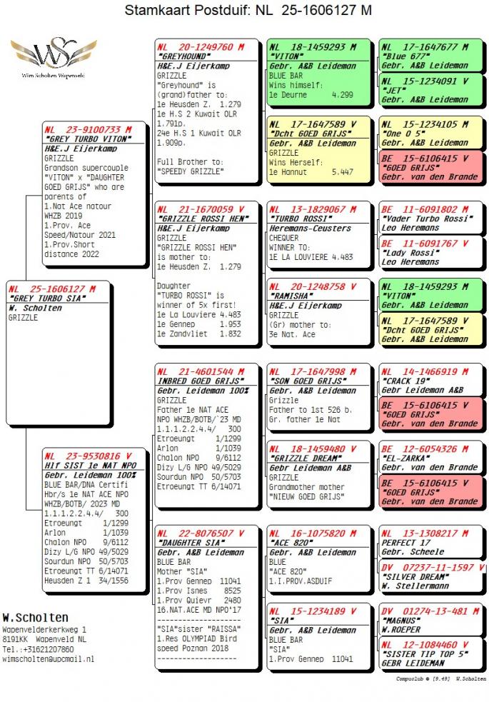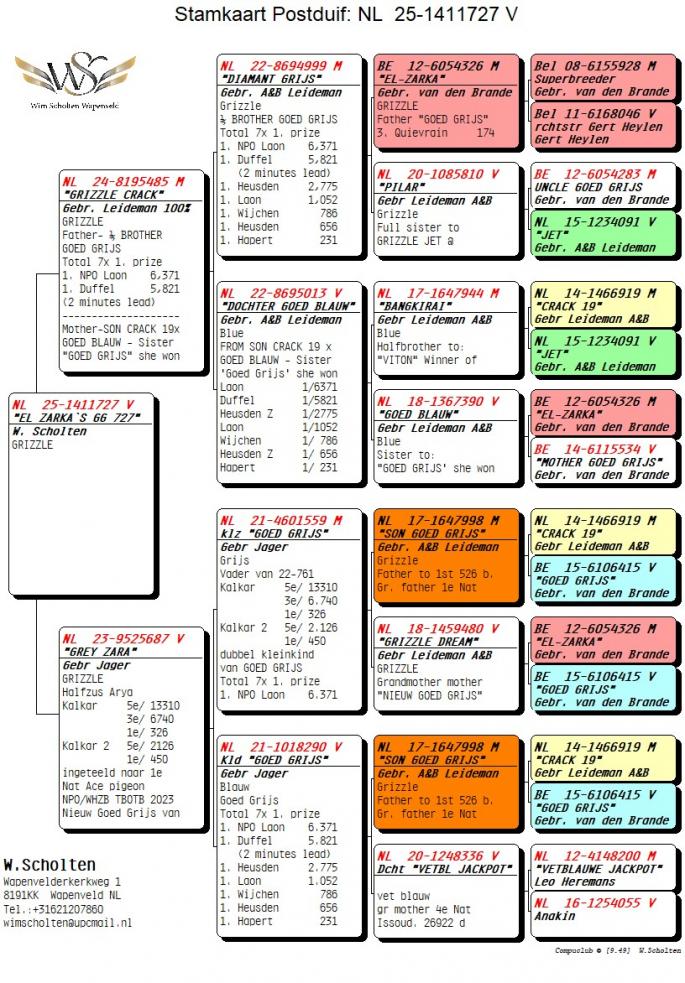 Tatal este consangvin pe Viton 1 Deurn 4299 p. De 3 x Goede Grijs in pedigree 1. NPO Laon 6,371 p 1. Duffel 5,821 b. 1. Heusden Zolder 2,775 p 1. Laon 1,052 p 1. Wijchen 786 p 1. Heusden-Zolder 656 p 1. Hapert 231 p oferta curenta: SW2019 |