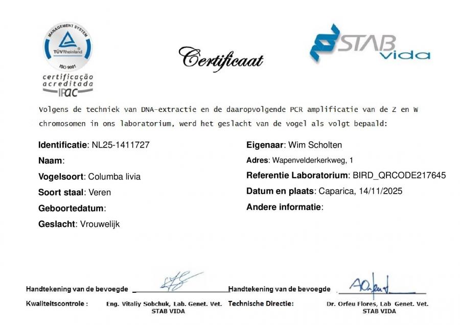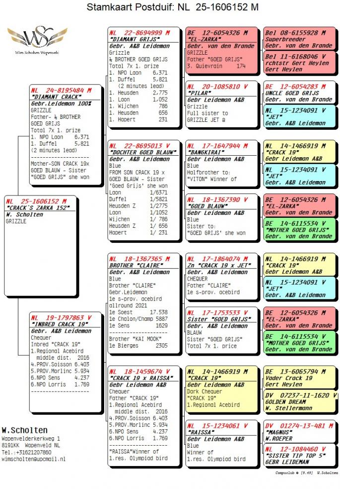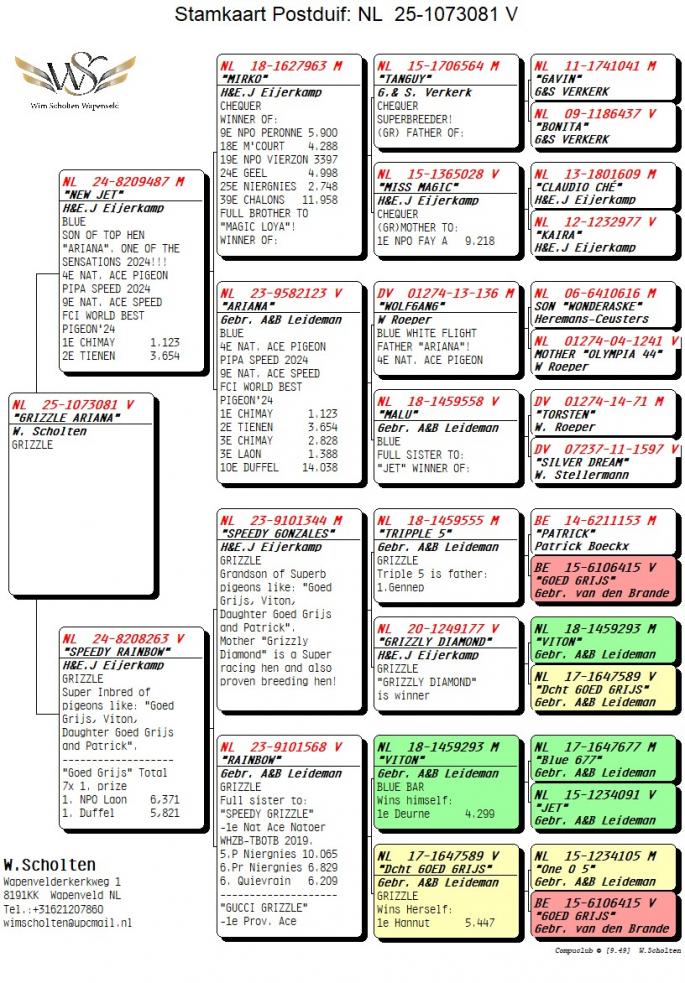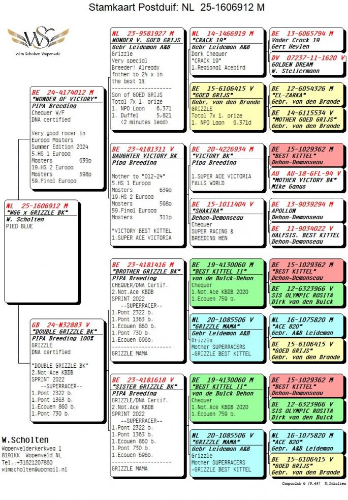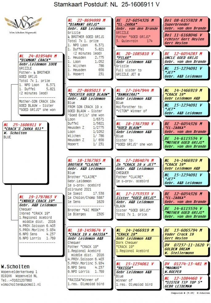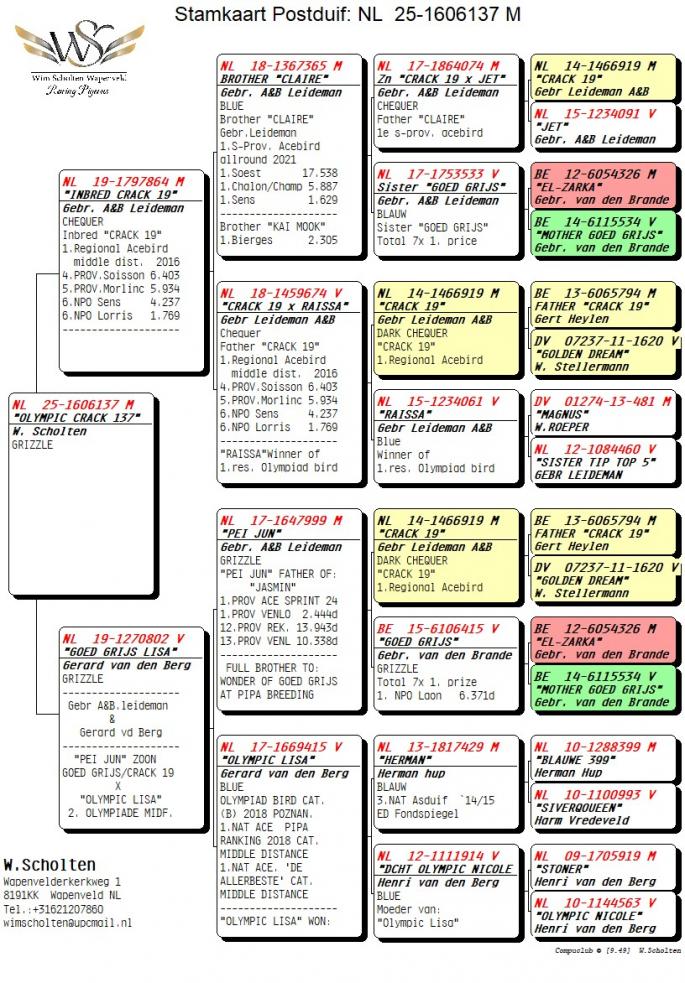 Tatal este consangvin pe Viton 1 Deurn 4299 p. De 3 x Goede Grijs in pedigree 1. NPO Laon 6,371 p 1. Duffel 5,821 b. 1. Heusden Zolder 2,775 p 1. Laon 1,052 p 1. Wijchen 786 p 1. Heusden-Zolder 656 p 1. Hapert 231 p oferta curenta: SW2019 |