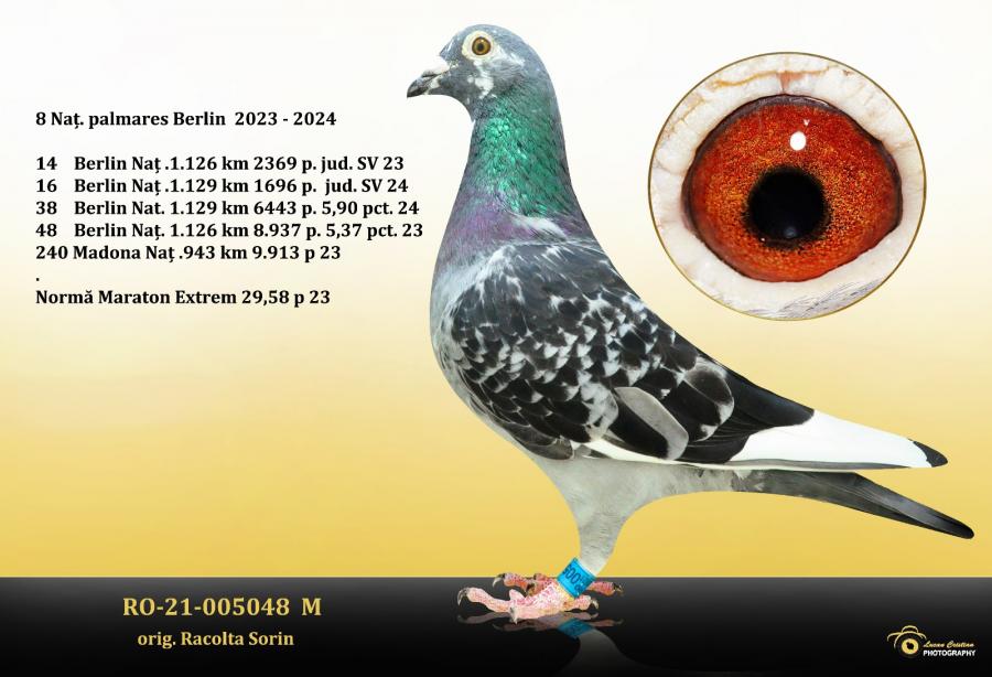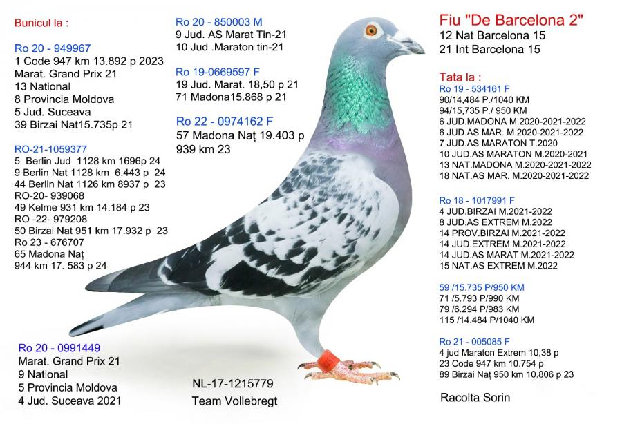 Unul din numele importante la concursurile de maraton din Judetul Suceava, probabil judetul cu cea mai puternica concurenta din Romania, este Racolta Sorin. Un crescator care a inceput sa concureze de nu foarte multi ani, dar, este pe prima pagina a clasamentelor etapelor de maraton extrem la care concureaza. Si-a creat o matca valoroasa prin achizitionarea de porumbei atat de la crescatori din strainatate cat si din Romania. Vollebrecht-ul si Veldena sunt doua piese de rezistenta in compartimentul acestuia de reproductie.