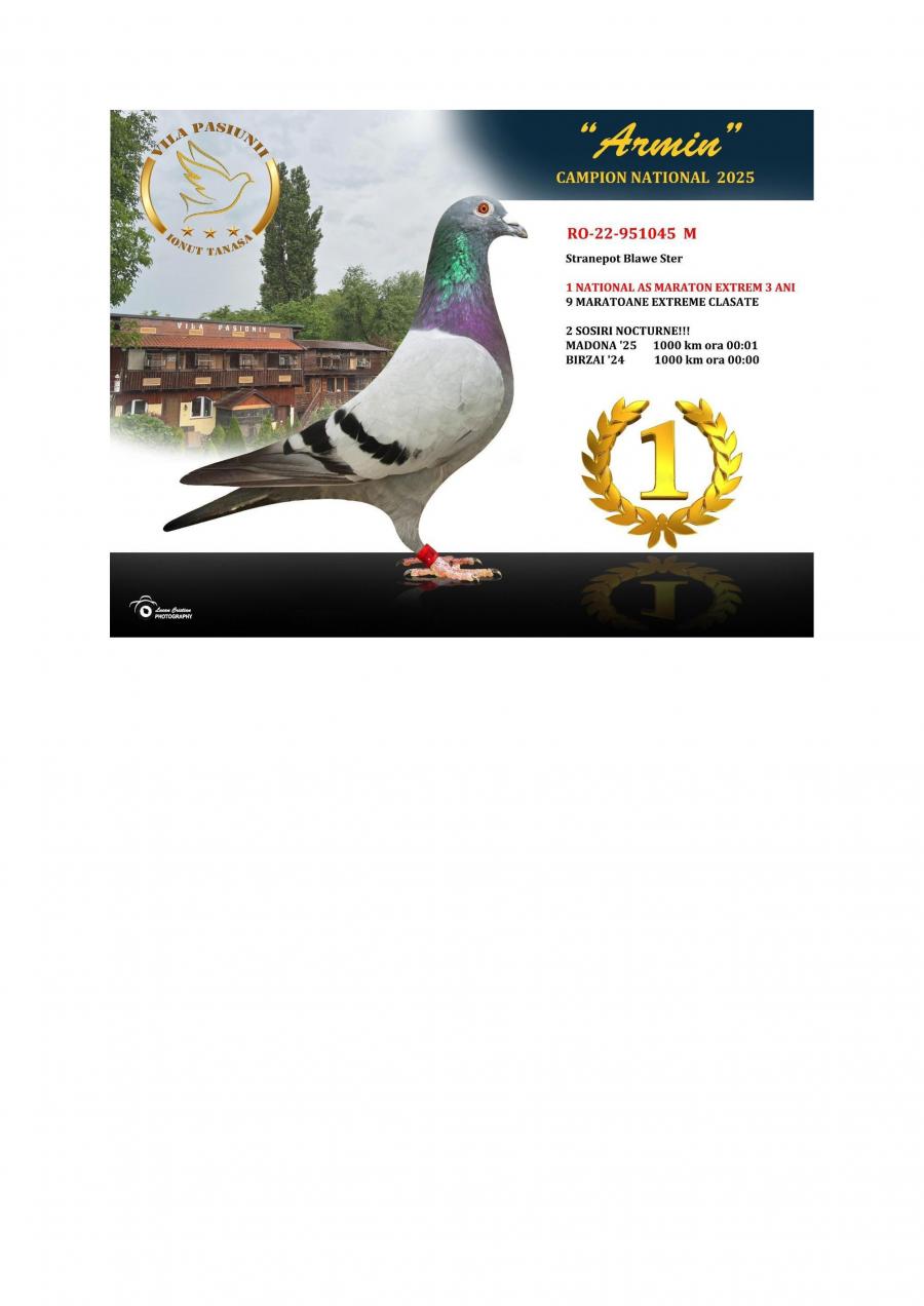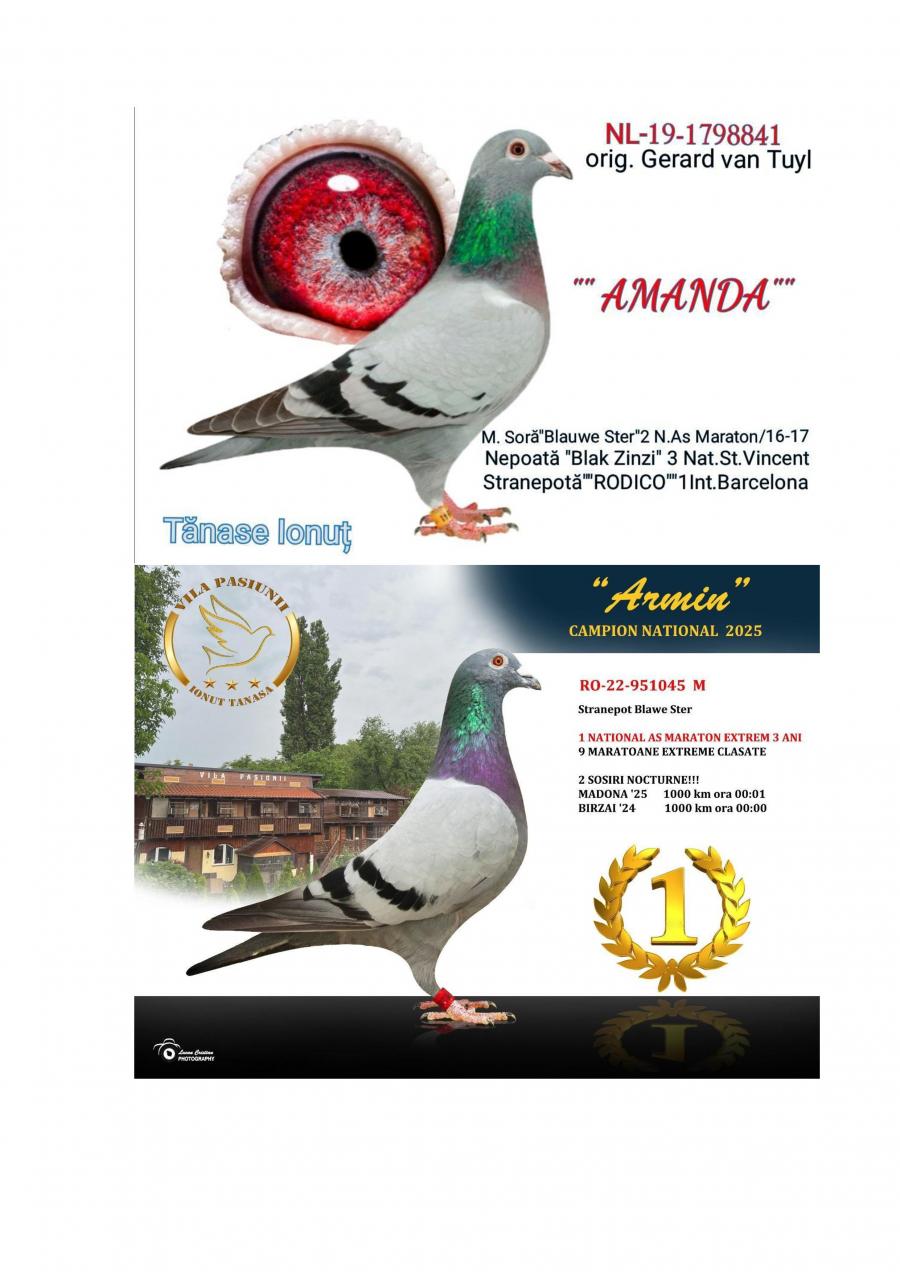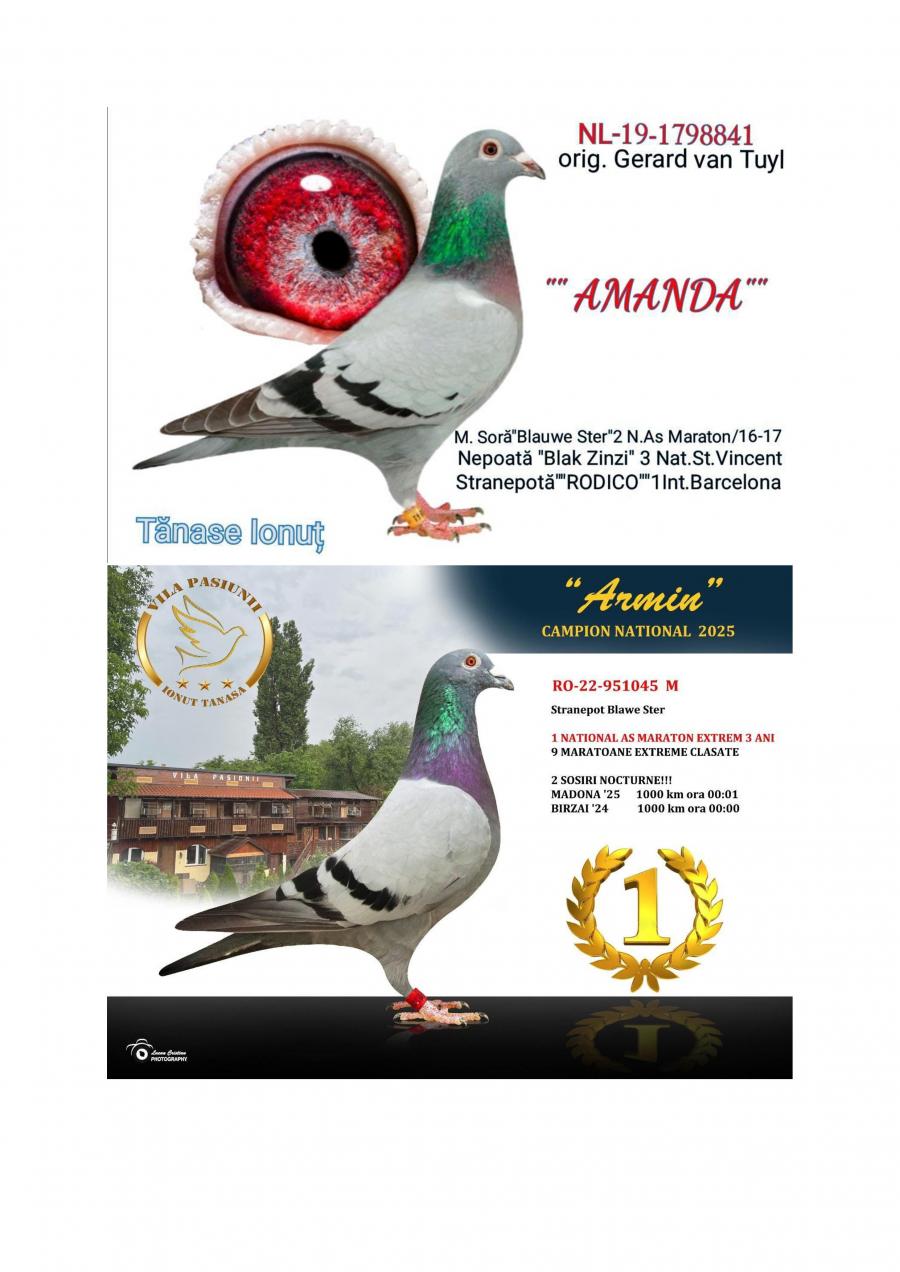 Nepoata ”AMANDA” mama ”ARMIN” SUPER REPRODUCATOARE MAMA lui ”ARMIN”: - LOC 1 NAČIONAL AS EXTREM 3 ANI -LOC 2 AS EXTREM MARATON 2 ANI Asoc. Suceava 23 – 24 -LOC 7 NAČIONAL AsociaČia Suceava 23 – 24 Sosire nocturna BIRZAI 24 la ora 00:00 Sosire nocturna MADONA 25 la ora 00:01 Nepoata ”HAGI” - LOC 1 AS Maraton Palm. 3 ANI Asoc. Suceava 22 - 24; - LOC 1 AS Maraton Palm. 2 ANI Asoc. Suceava 22 - 23; - LOC 1 AS Maraton 3 ANI PROVINCIAL MOLDOVA 22 - 24; - LOC 4 National AS Maraton 3 ANI; - 11 Maratoane Clasate; - 3 SOSIRI NOCTURNE la Maraton: - GOLDAP 23 - BIRZAI 24 - MADONA 25. Nepoata ”CUPLU DE AUR” baza crescÄtoriei ”VILA PASIUNII” IONUT TANASA Cuplu care a reprodus campionii: ”HAGI” ”SUPERSONIC” ”ICARA 45” Consangvina pe ”CUPLU DE AUR”