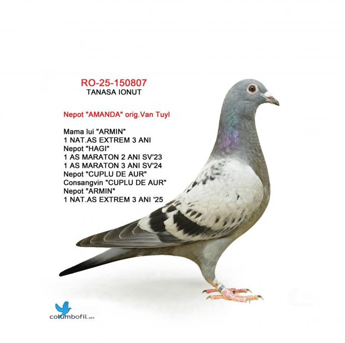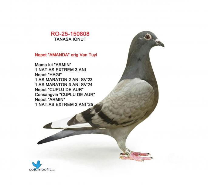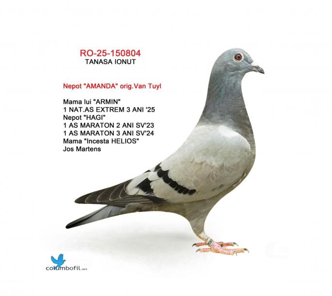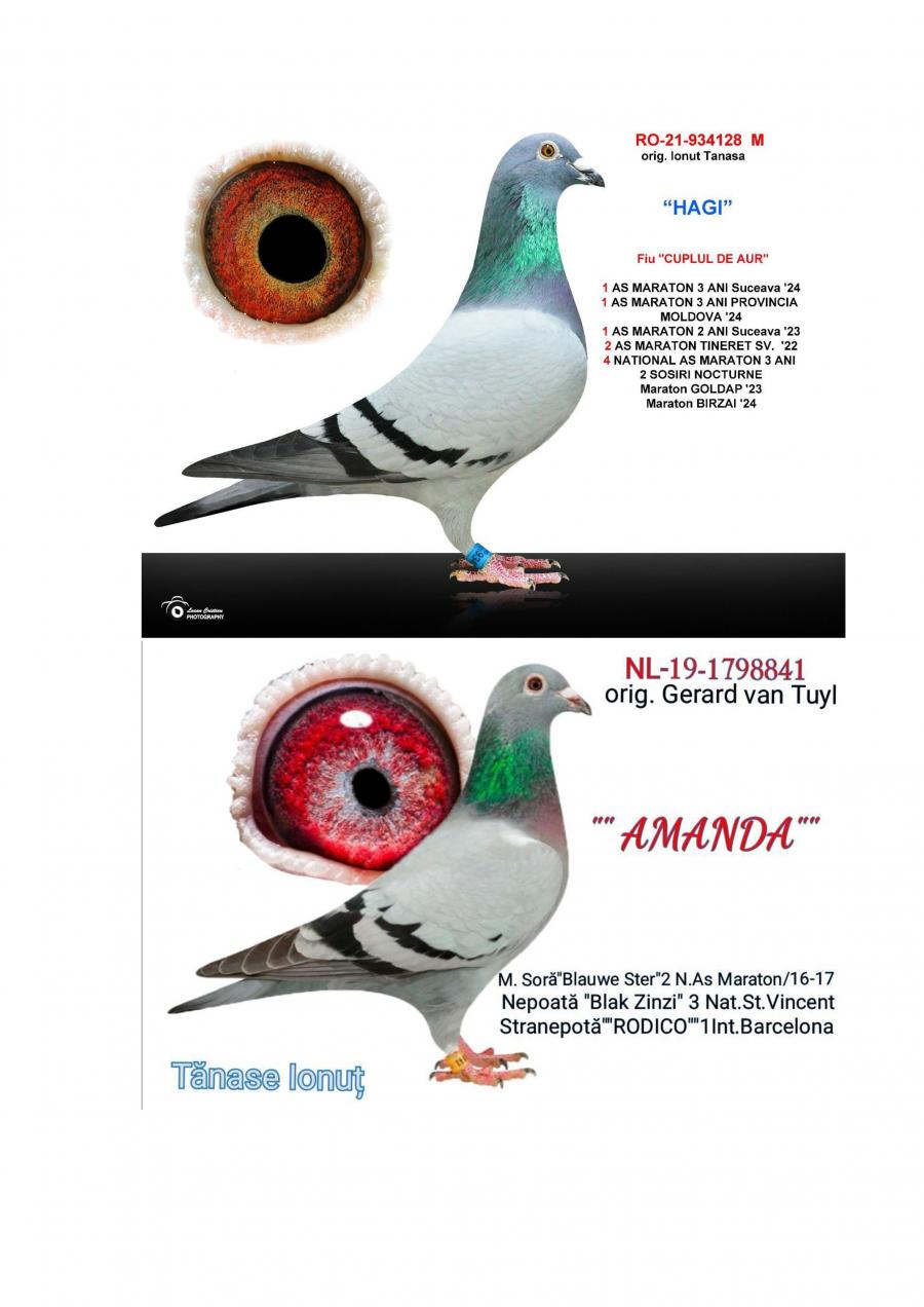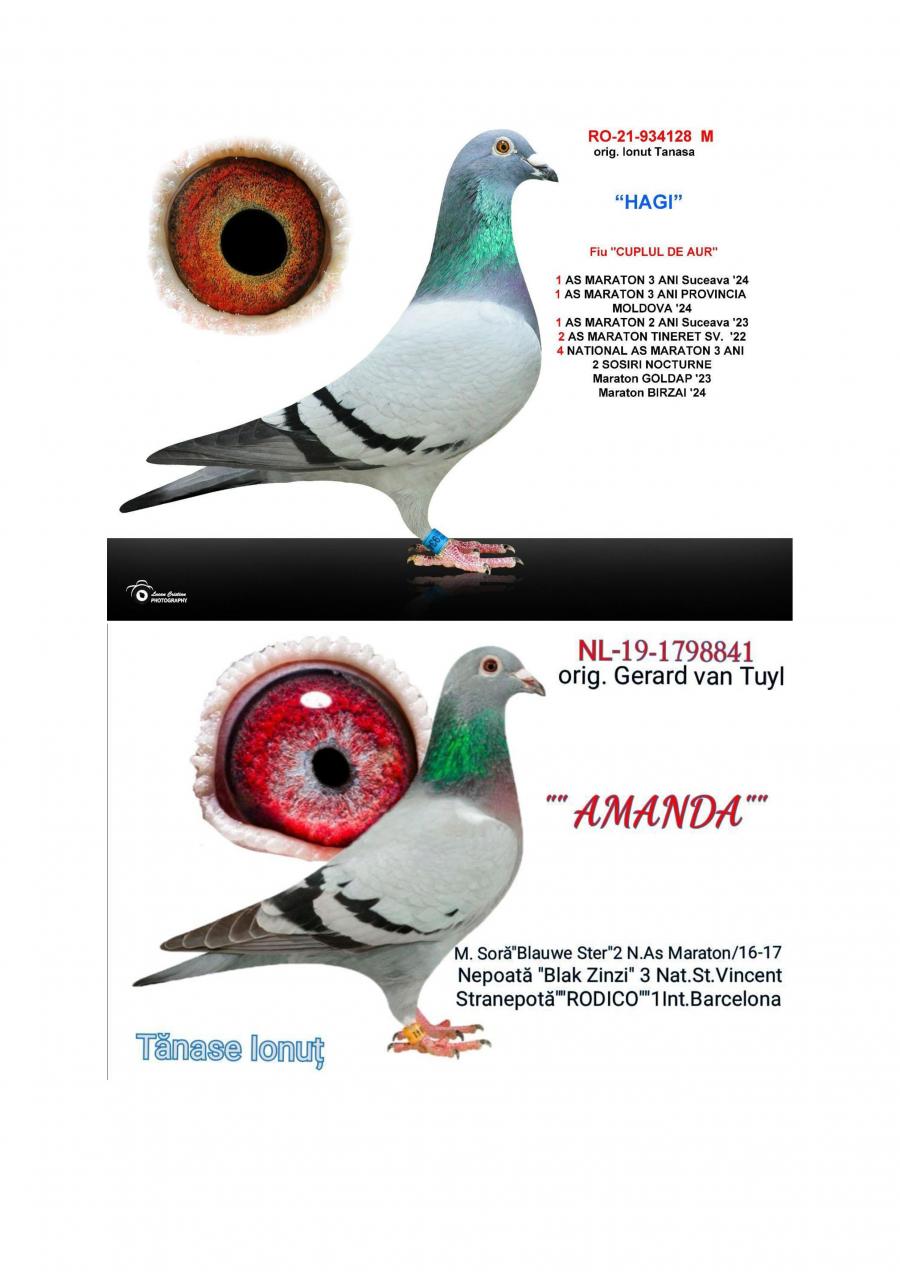 Nepoata ”AMANDA” mama ”ARMIN” SUPER REPRODUCATOARE MAMA lui ”ARMIN”: - LOC 1 NAČIONAL AS EXTREM 3 ANI -LOC 2 AS EXTREM MARATON 2 ANI Asoc. Suceava 23 – 24 -LOC 7 NAČIONAL AsociaČia Suceava 23 – 24 Sosire nocturna BIRZAI 24 la ora 00:00 Sosire nocturna MADONA 25 la ora 00:01 Nepoata ”HAGI” - LOC 1 AS Maraton Palm. 3 ANI Asoc. Suceava 22 - 24; - LOC 1 AS Maraton Palm. 2 ANI Asoc. Suceava 22 - 23; - LOC 1 AS Maraton 3 ANI PROVINCIAL MOLDOVA 22 - 24; - LOC 4 National AS Maraton 3 ANI; - 11 Maratoane Clasate; - 3 SOSIRI NOCTURNE la Maraton: - GOLDAP 23 - BIRZAI 24 - MADONA 25. Nepoata ”CUPLU DE AUR” baza crescÄtoriei ”VILA PASIUNII” IONUT TANASA Cuplu care a reprodus campionii: ”HAGI” ”SUPERSONIC” ”ICARA 45” Consangvina pe ”CUPLU DE AUR”