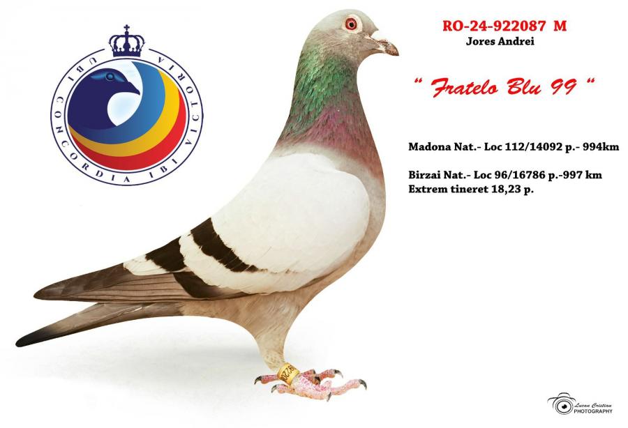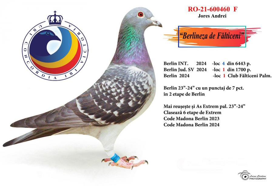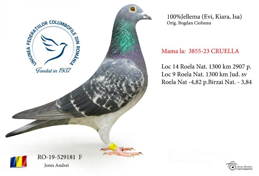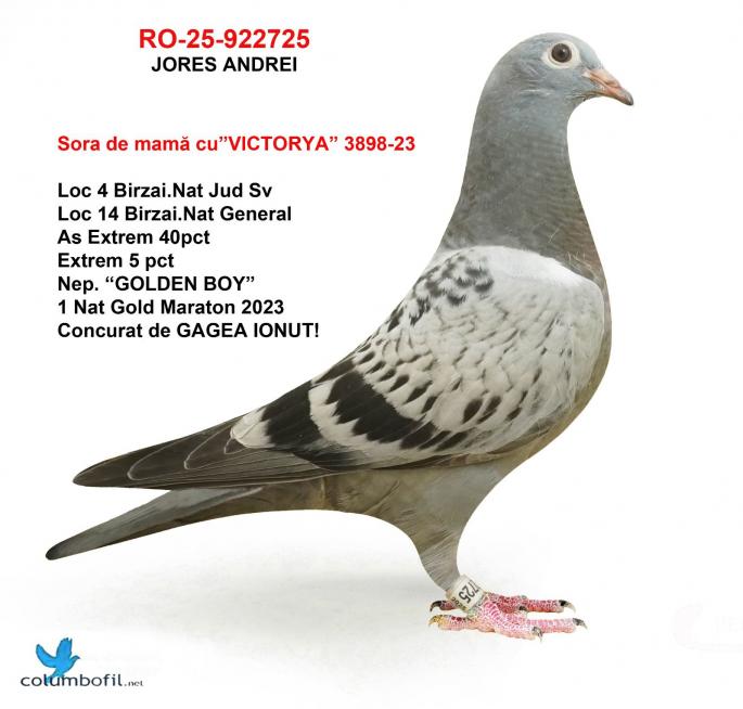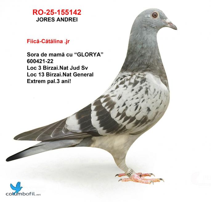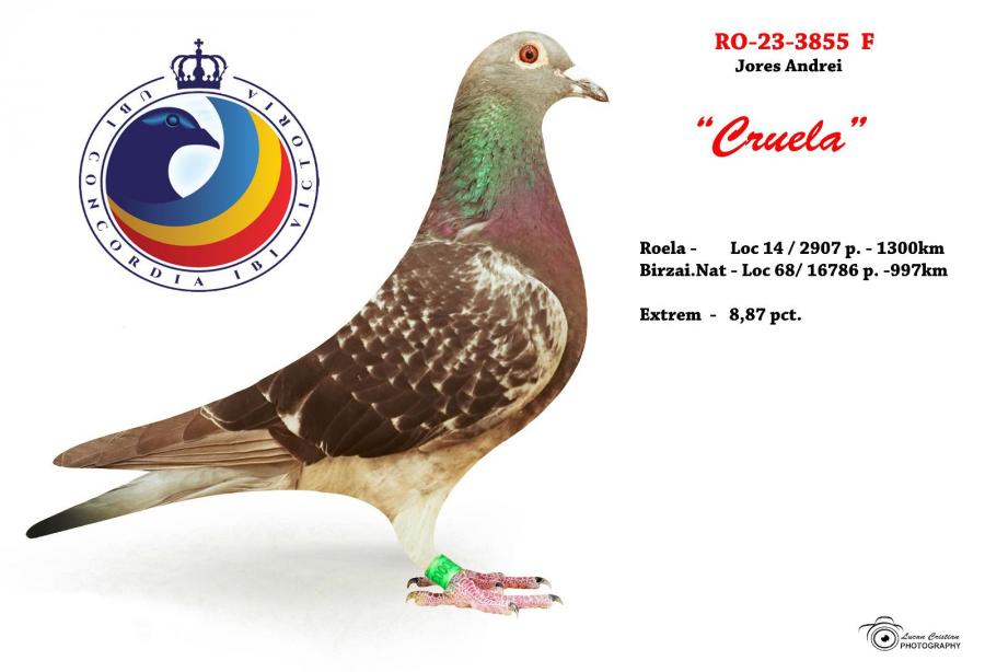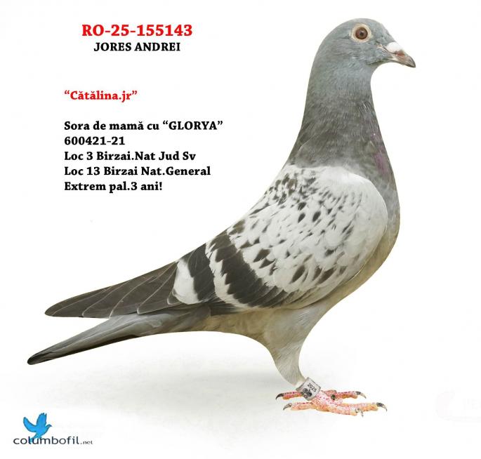Fiu din "Catalina jr" una din cele mai bune reproducatoare in crescatoria Jores Andrei Mama lui 600421-21 sosire nocturna la Code și Birzai - prima sosita la etapa de Birzai 2025 loc 3 Jud. SV Loc 13 General Mama lui 3803-23 incheie as maraton Jonava, Seta, Kaunas cu sosiri in primi 200 pe lansare la toate 3 maratoane