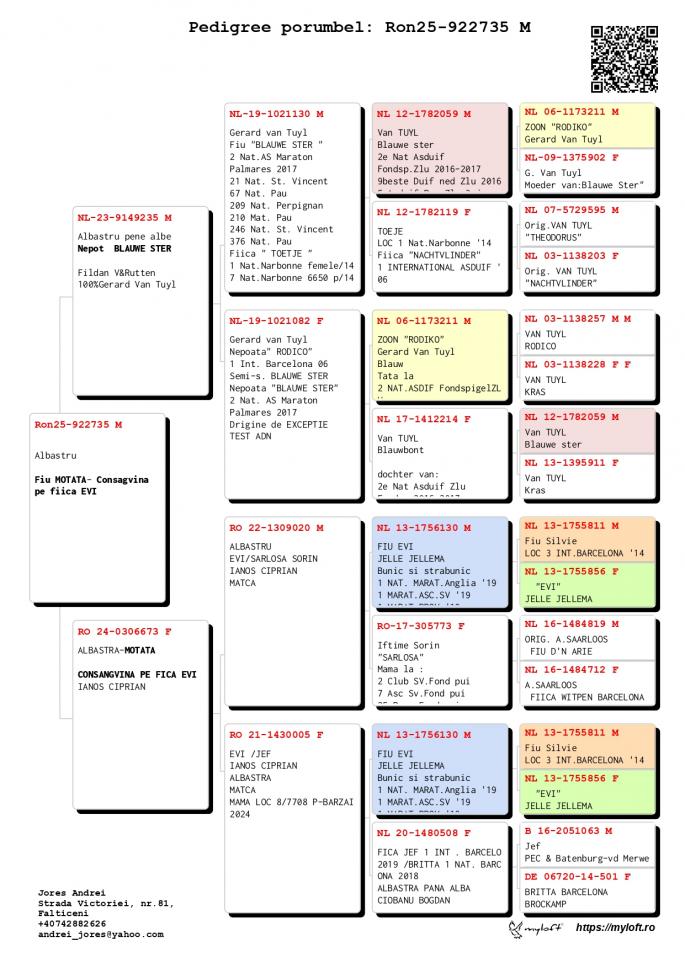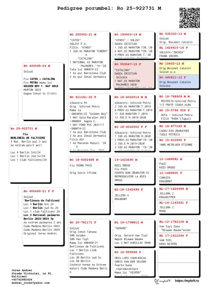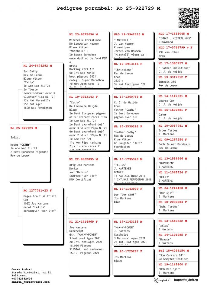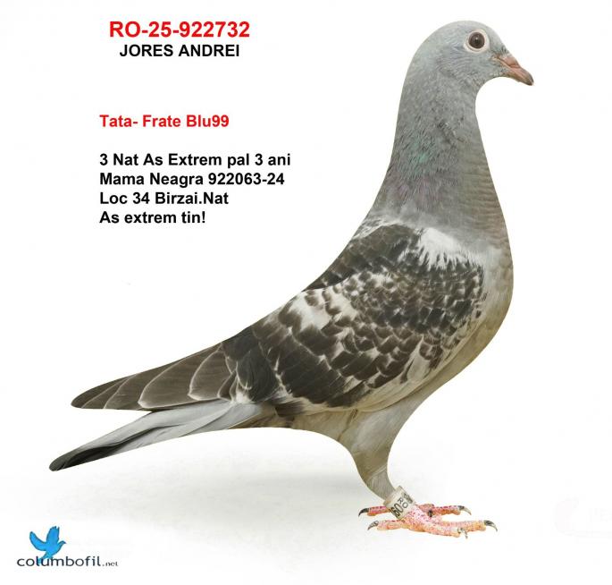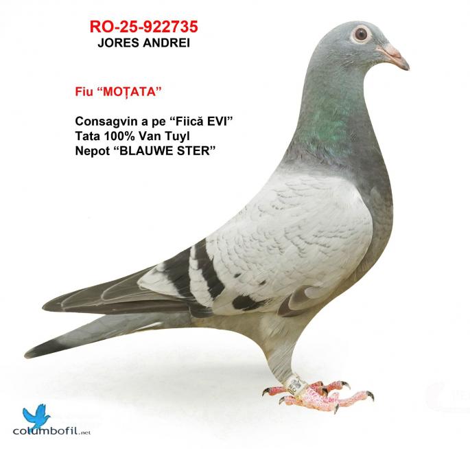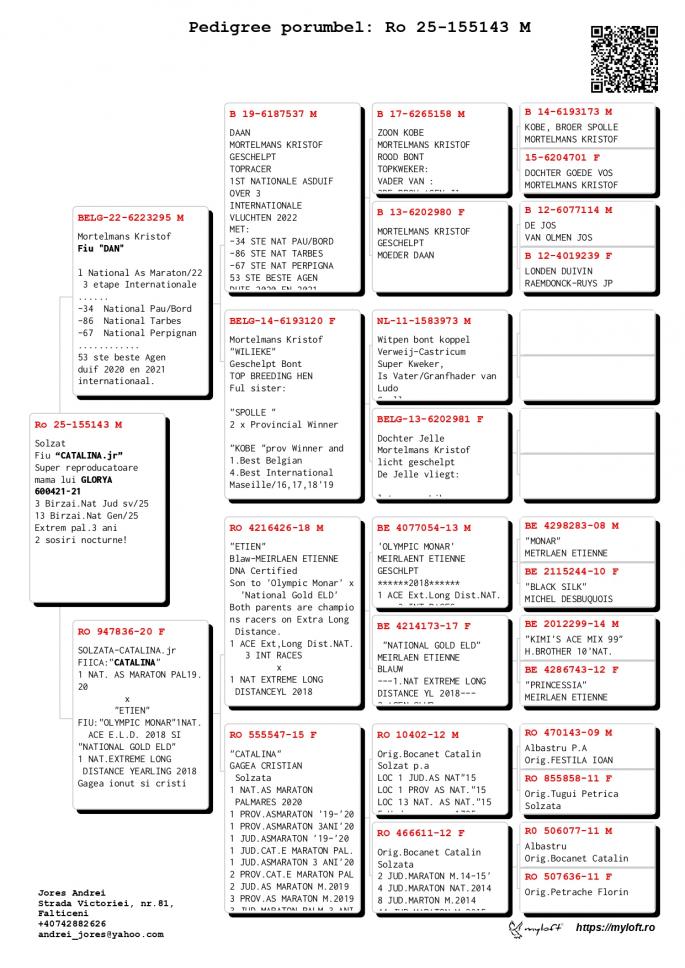 Fiu din "Catalina jr" una din cele mai bune reproducatoare in crescatoria Jores Andrei Mama lui 600421-21 sosire nocturna la Code și Birzai - prima sosita la etapa de Birzai 2025 loc 3 Jud. SV Loc 13 General Mama lui 3803-23 incheie as maraton Jonava, Seta, Kaunas cu sosiri in primi 200 pe lansare la toate 3 maratoane