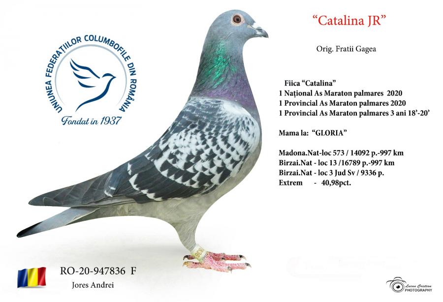 Fiica din "Catalina jr" una din cele mai bune reproducatoare in crescatoria Jores Andrei Mama lui 600421-21 sosire nocturna la Code și Birzai - prima sosita la etapa de Birzai 2025 loc 3 Jud. SV Loc 13 General Mama lui 3803-23 incheie as maraton Jonava, Seta, Kaunas cu sosiri in primi 200 pe lansare la toate 3 maratoane