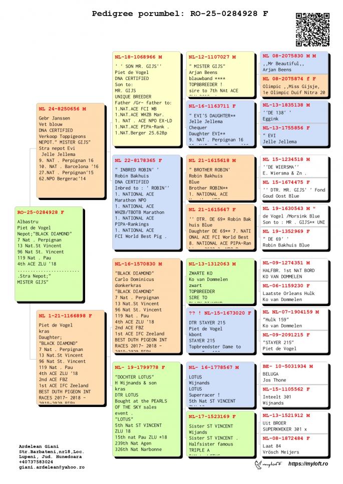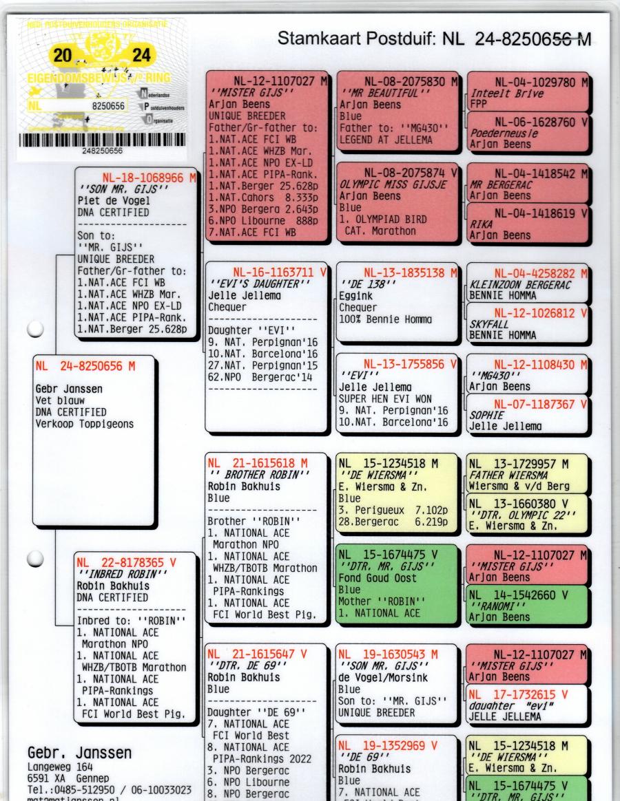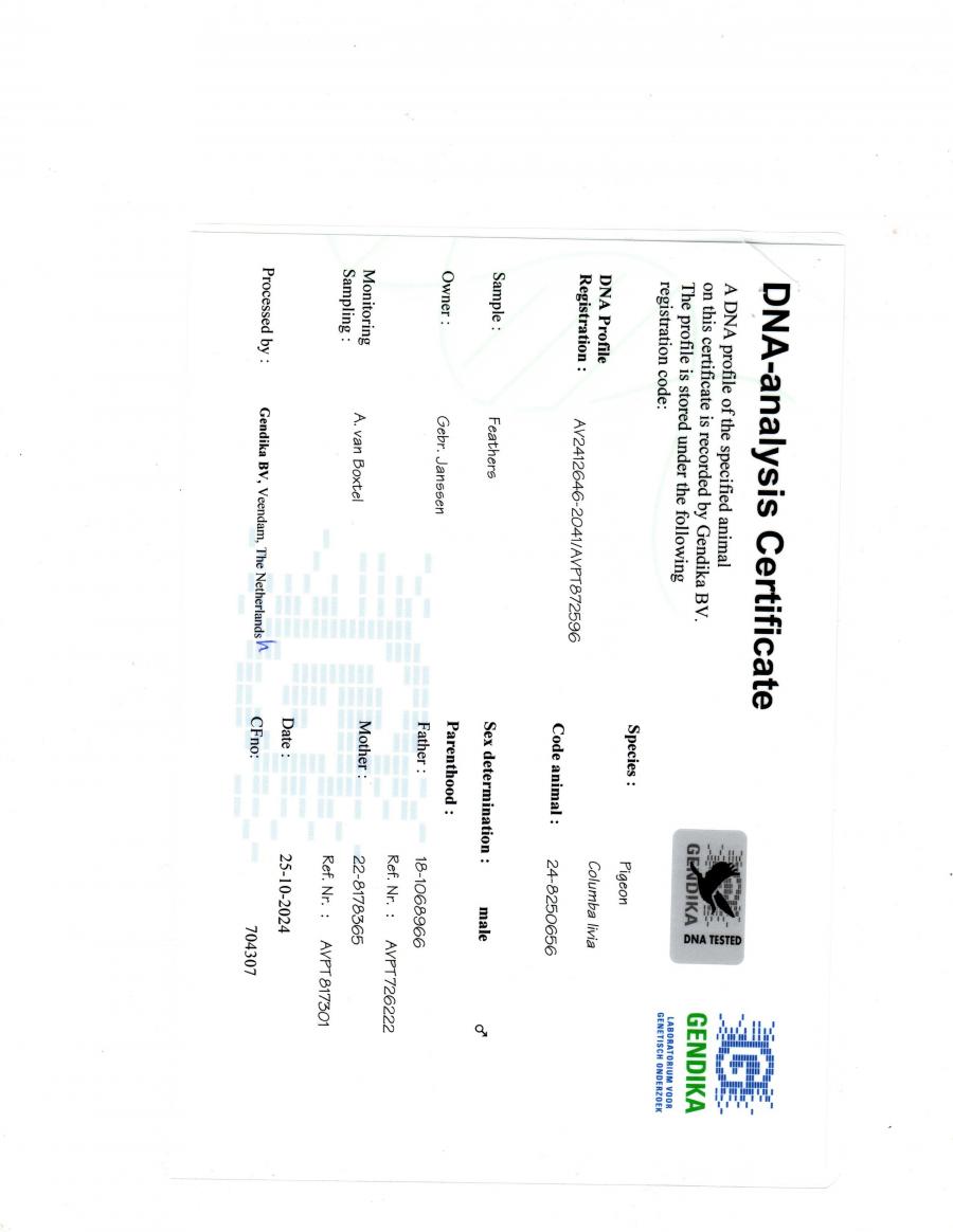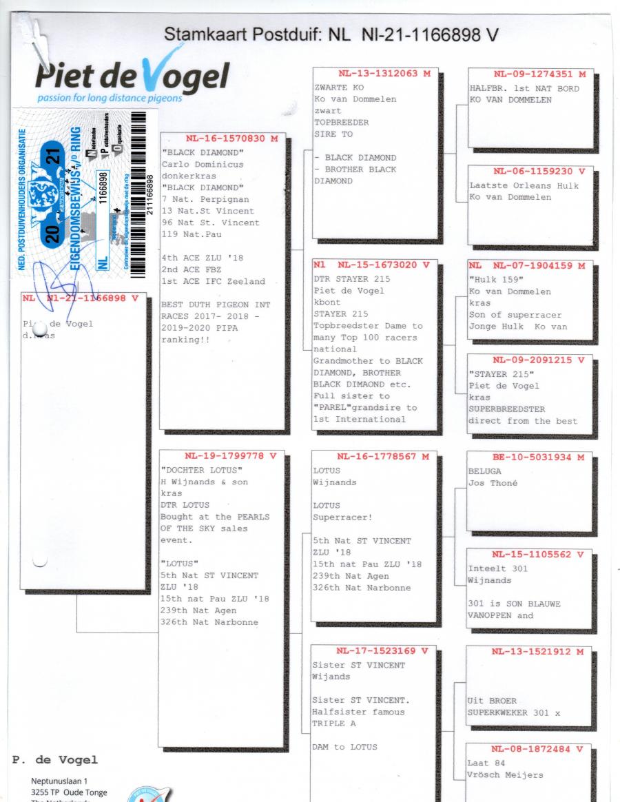 Mama este fiica BLACK DIAMOND - Carlo Dominicus 7 Nat. Perpignan 13 Nat. St. Vicent 96 Nat. St. Vicent 119 Nat. Pau 4th ZLU `18 2nd ACE FBZ 1St Ace IFC Zeeland Best Duth Pigeon INT Races 2017-2018