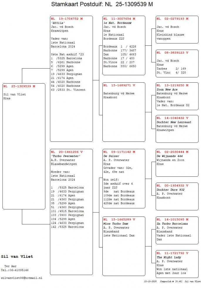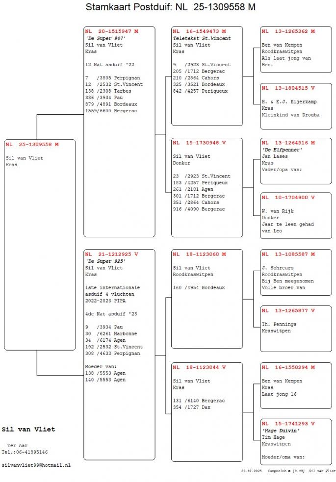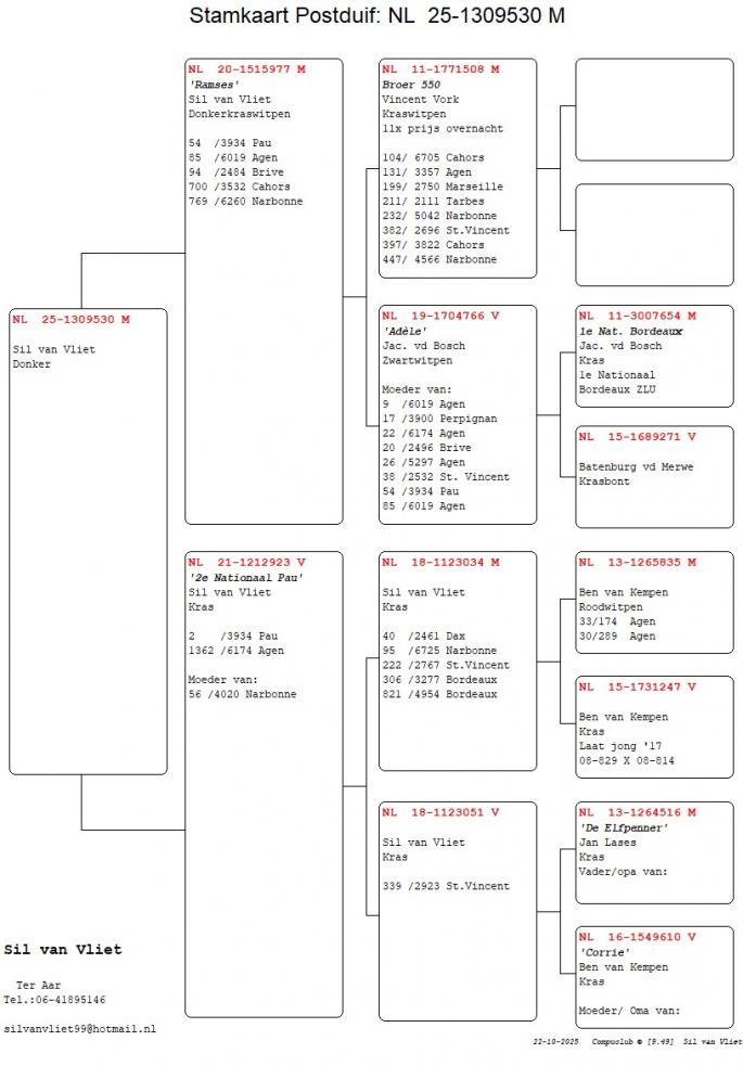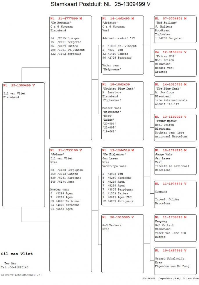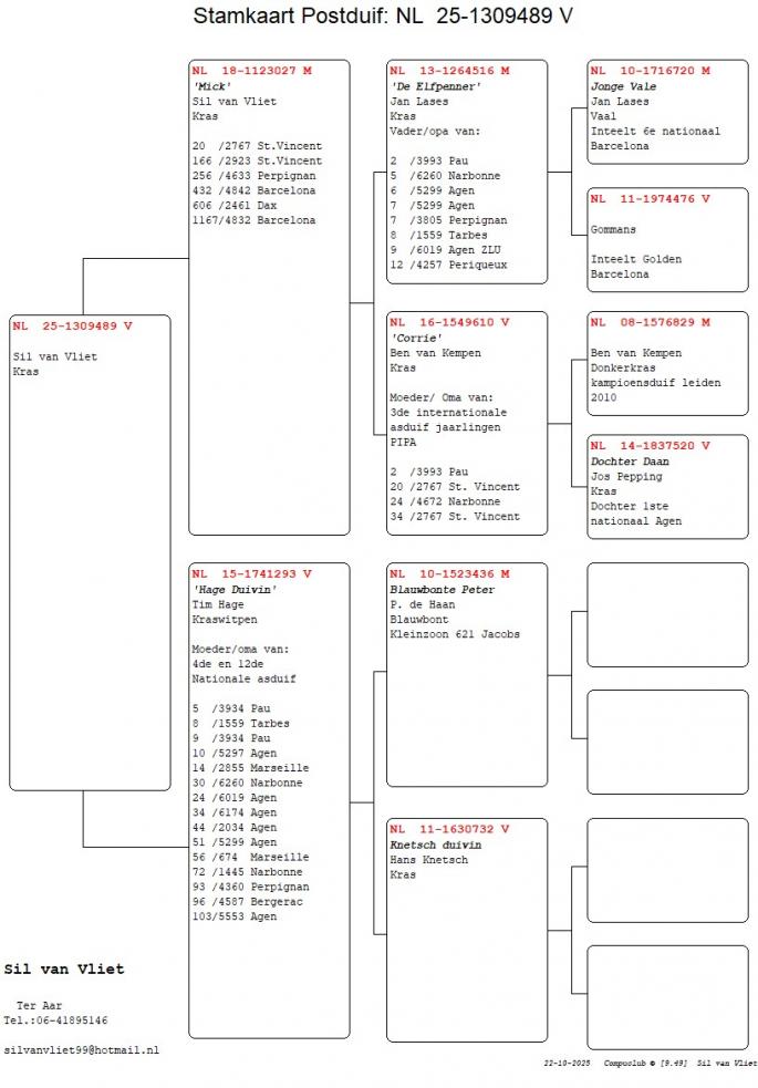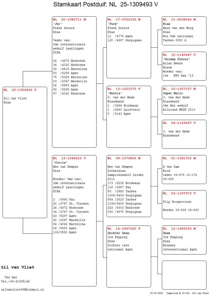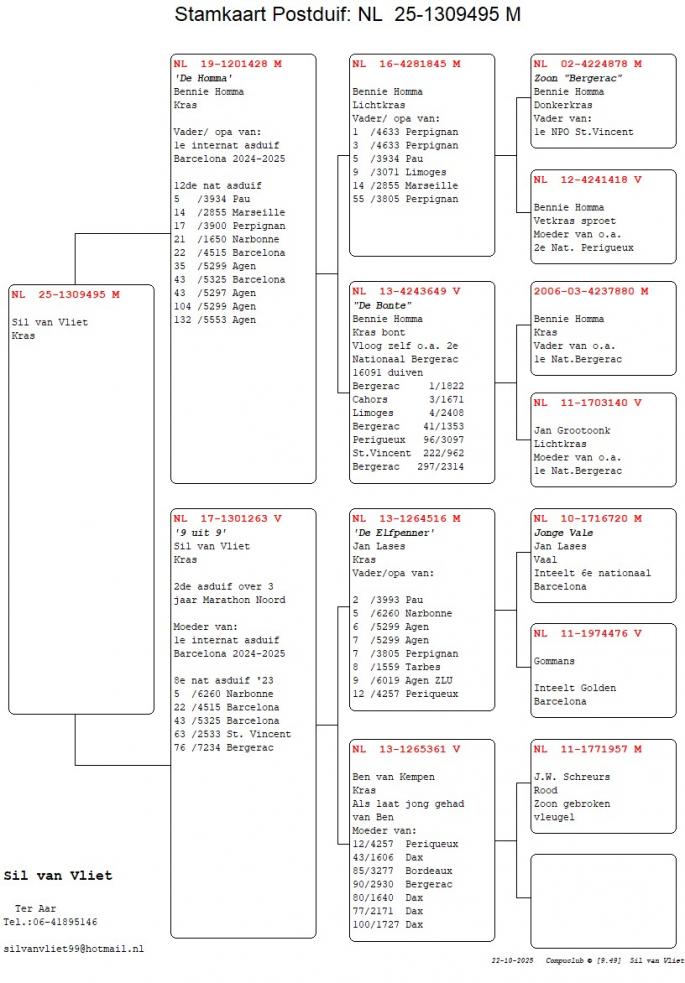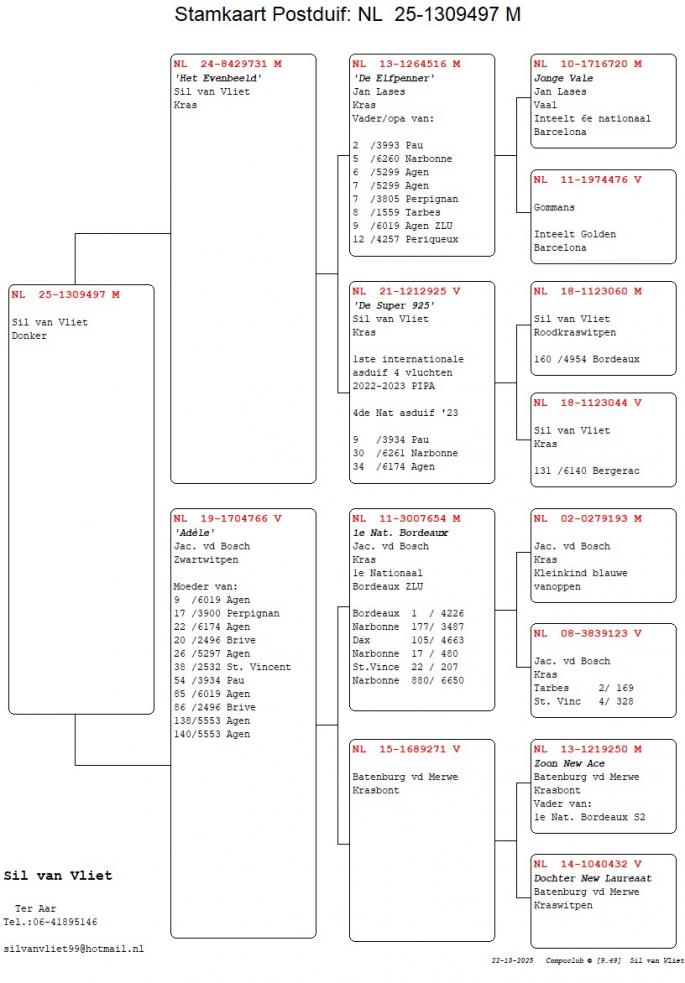 Sil van Vliet, tanarul columbofil din Ter Aar, Olanda, este unul dintre cele mai promitatoare nume ale curselor de mare distanta din Europa. Cu rezultate impresionante obtinute in competitii precum Barcelona ZLU si Perpignan, Sil si-a consolidat rapid reputatia de crescator cu pasari extrem de rezistente, inteligente si constant performante.
