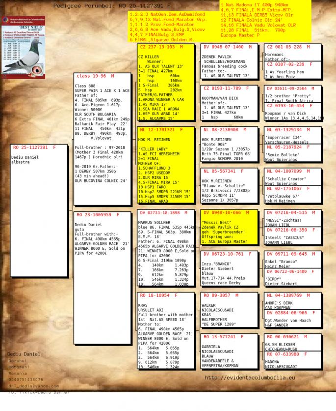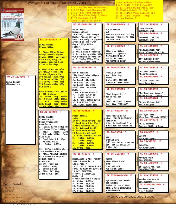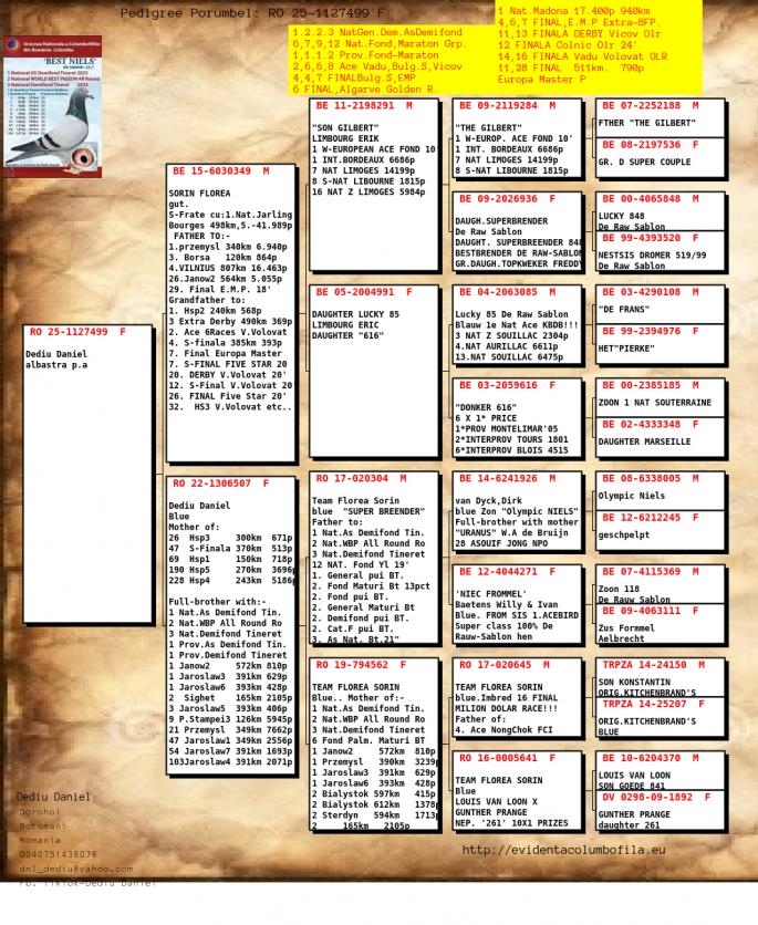 Fiica BE 15-6030349 M Semi-frate cu 1 Nat. Yarling Tata la: 1 / 6940 p. Prezmyls 340 km 3 / 864 p. Borsa 120 km 4 / 16463 p. Vilnius 807 kmn 26 / 5055 p. Janow2 564 km 29 Final EMP 2018 Bunicul la: 1 Hsp2 240 km 568 p. 3 Extra Derby 490 km 369 p. 2 Ace 6 etape V. Volovat 4 Semifinala 385 km 393 p. 7 Final Europa Master 7 S-Final Five Star 2020 20 Derby V. volovat `20