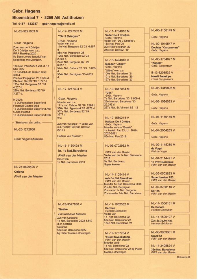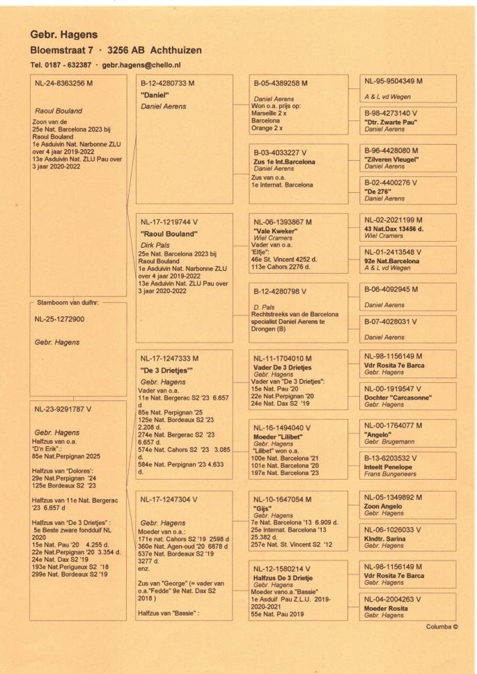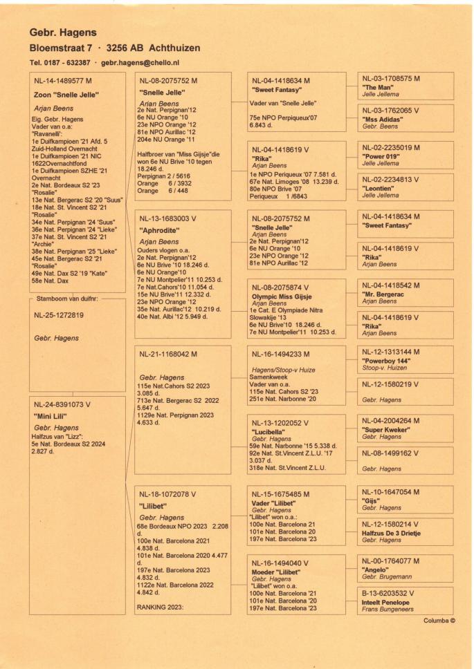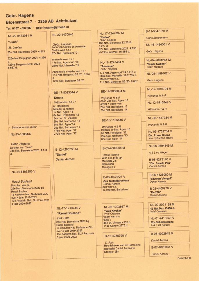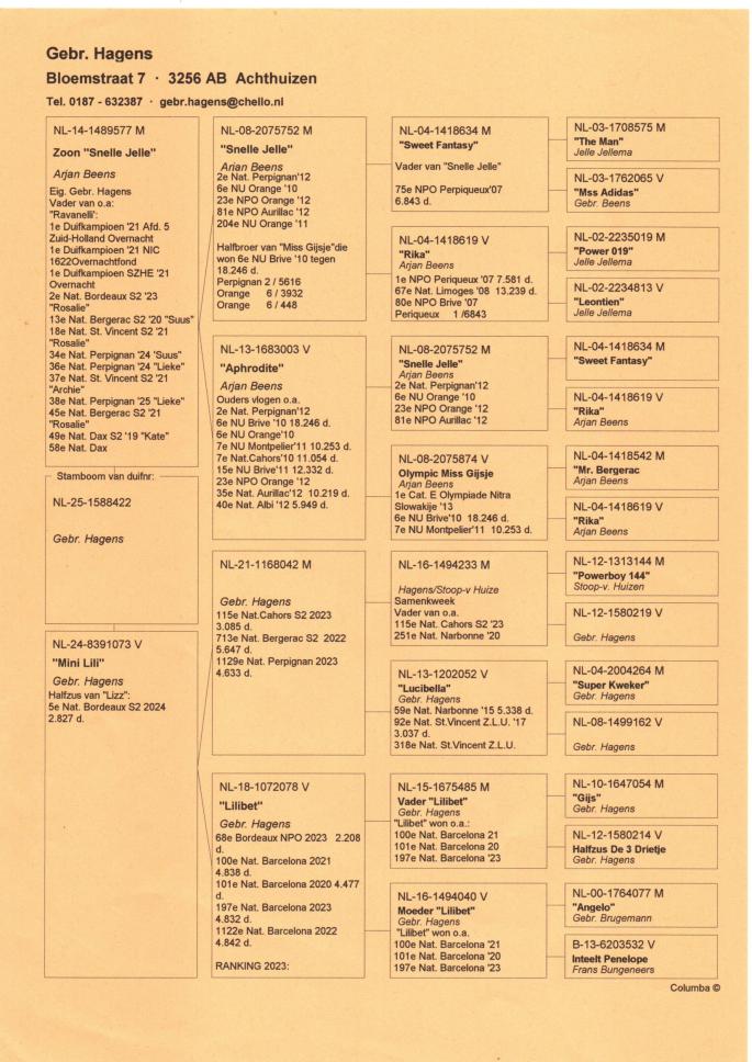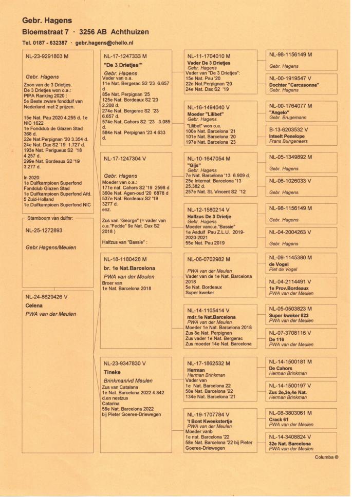 Din partea tatalui linia lui “Carcasonne”, “Vader Sonja”, “Lucinda”, “Rooie Kweker”, “Kweker 42”.