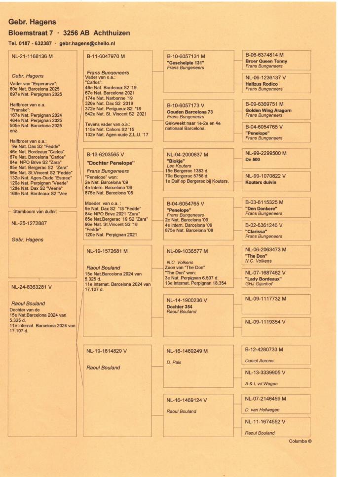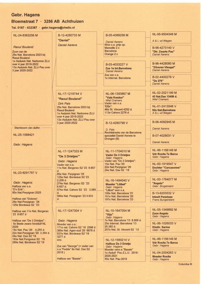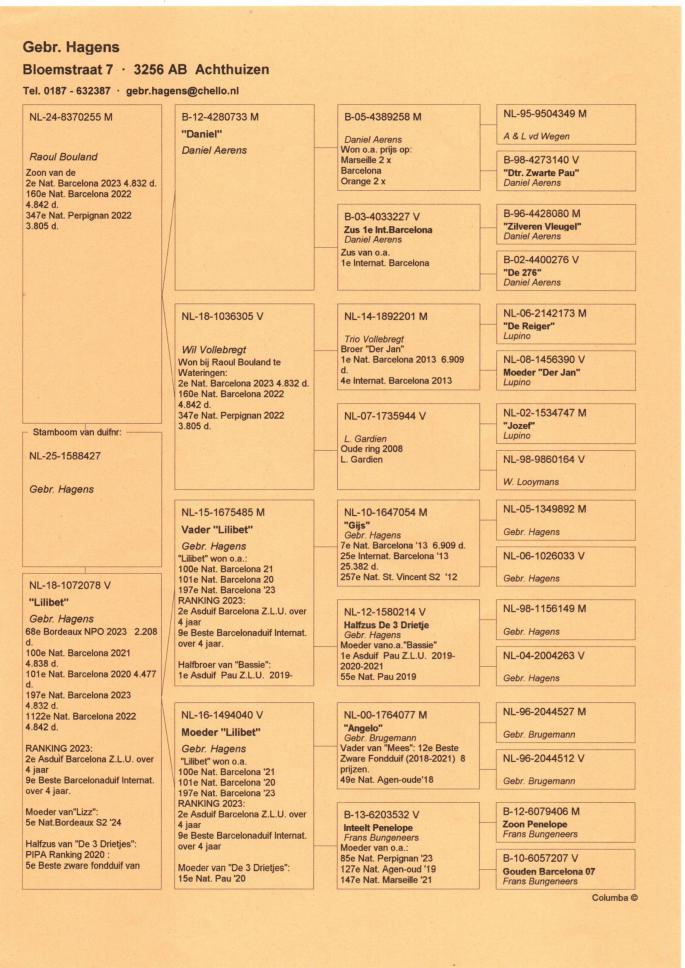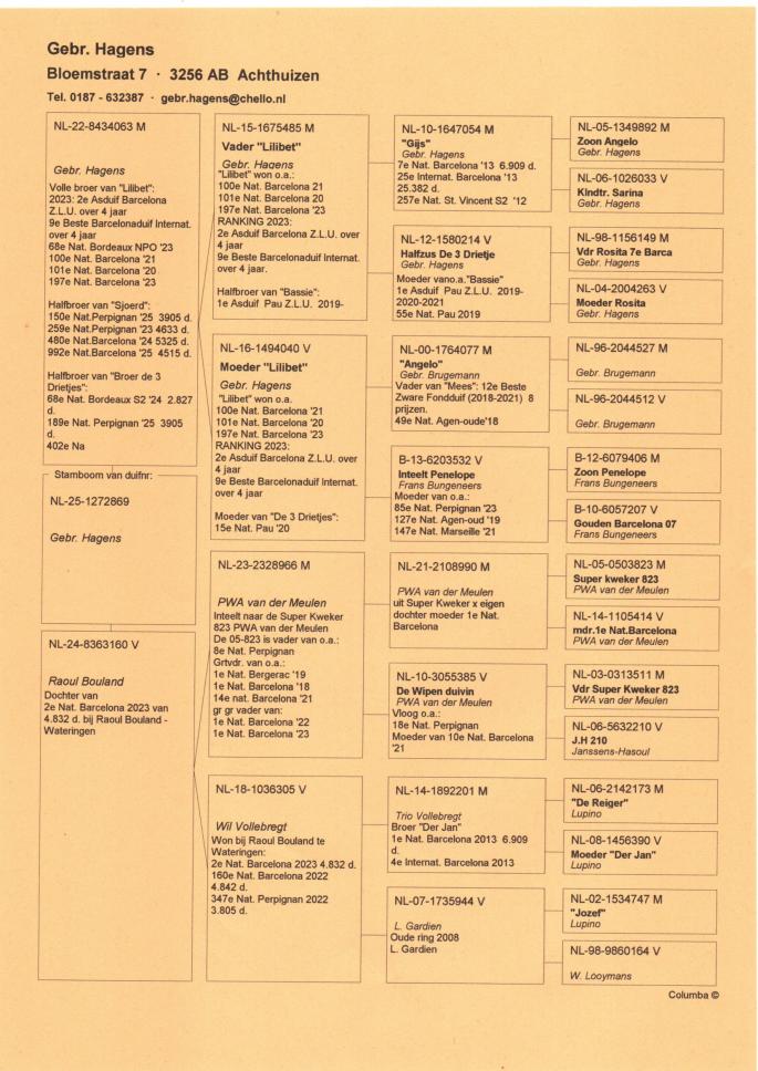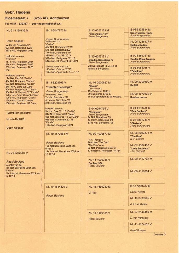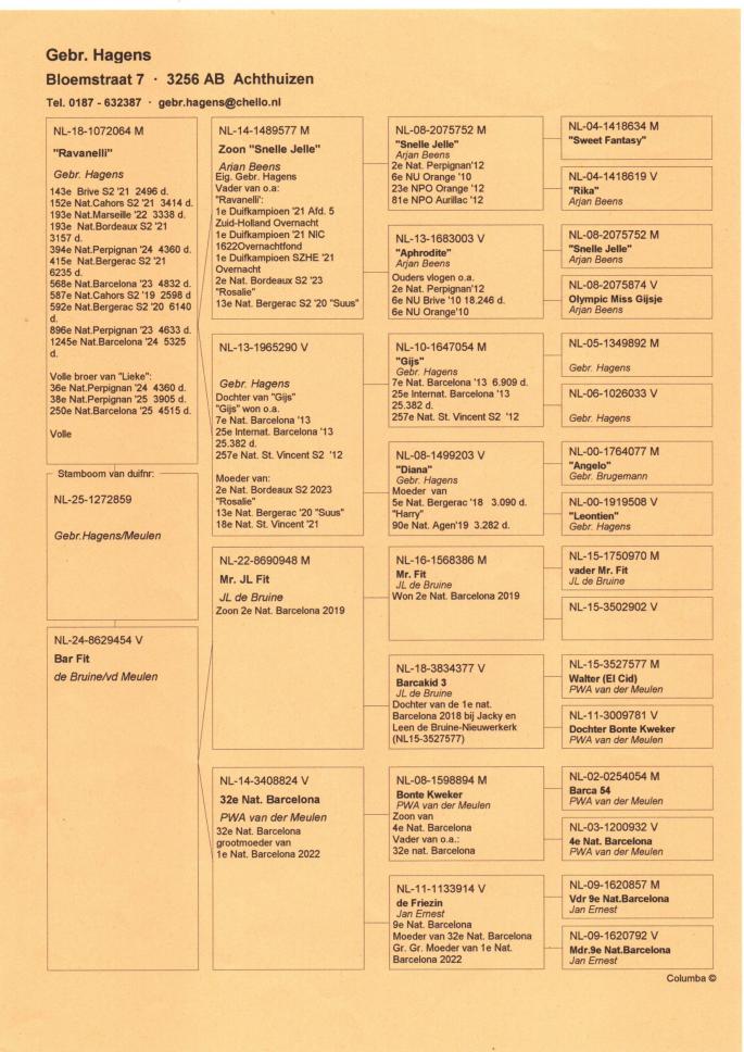 Din partea tatalui linia lui “Carcasonne”, “Vader Sonja”, “Lucinda”, “Rooie Kweker”, “Kweker 42”.