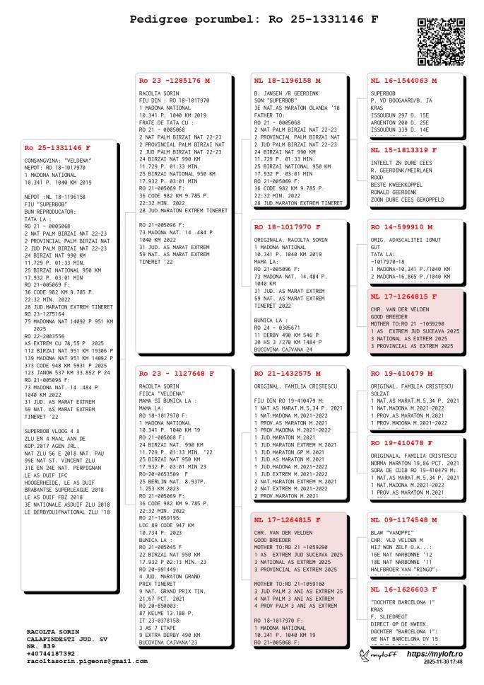 Nepot NL 17-1264815 F- VELDENA Super Reproducatoare ! Mama la RO 21-1059290 1 AS Extrem Jud. Suceava 2025 3 National AS Extrem 2025 3 Provincial AS Extrem 2025 Mama la RO 21-1059160 3 Jud. Palm. 3 ani AS Extrem 2025 4 Nat. Palmares 3 ani AS Extrem 4 Prov. Palm. 3 ani AS Extrem RO 18-1017970 F 1 Madona National 10341 p. 1040 km `19 RO 21-5068 2 Nat. Palm. Birzai Nat. `22-`23 2 Prov. Palm. Birzai Nat. 2 Jud. Palm. Birzai Nat. `22-`23 24 Birzai Nat. 990 km - 11729 p. 25 Birzai Nat. 950 km 17932 p. RO 21-5069 F 36 Code 982 km 9785 p.22:32 Min 2022 28 Jud. Maraton Extrem Tineret RO 20-653589 F 25 Berlin Nat. 8937 p. 1253 km 2023 RO 21-1059195 89 Code 947 km 10734 p. 2023 Bunica la: RO 21-5045 F 22 Birzai Nat. 950 km 17932 p. 02:13 mIn `23 RO 20-991449 4 Jud. Maraton Grand Prix Tineret 9 Nat. Grand Prix