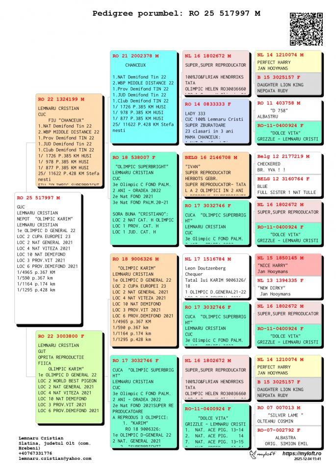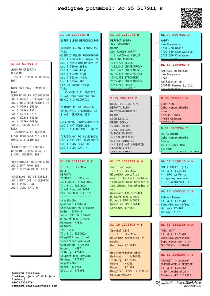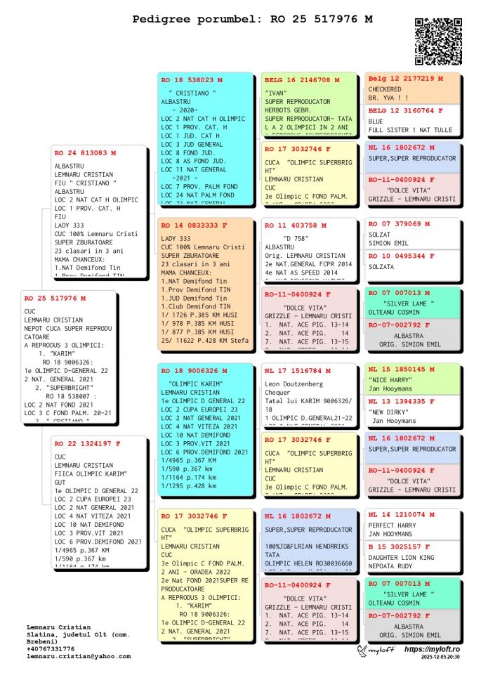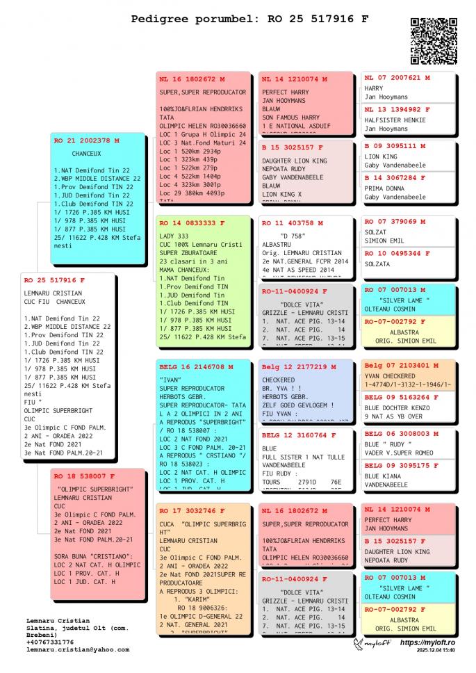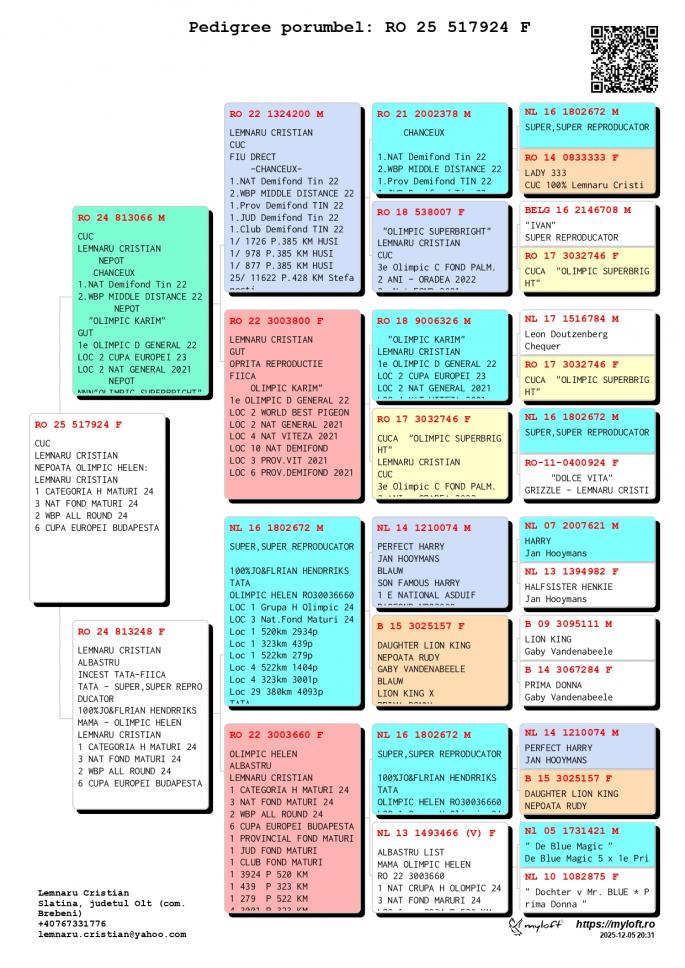 Fiica NL 16-1802672 M - SUPER REPRODUCATORUL-Jo & Florian Hendriks - Unul dintre cei mai buni reproducatori din Europa ! Tatal mai multor porumbei Olimpici din Romania ! Tata la OLIMPIC HELEN Loc 1 Grupa H. Olimpic 2024 Loc 3 Nat. Fond Maturi 2024 1 / 2934 p. 520 km 1 / 439 p. 323 km 1 / 279 p. 522 km 4 / 1404 p. 522 km 4 / 3001 p. 323 km CHANCEAUX 1 Nat. Demifond Tineret 2022 2 WBP Demifond 2022 1 Prov. Demifond Tineret 2022 1 Jud. Demifond Tineret 2022 1 Club Demifond Tineret 2022 1 / 1726 p. 385 km 1 / 978 p. 385 km 1 / 877 p. 385 km 25 / 11622 p. 425 km OLIMPIC KARIM Loc 1 Olimpic D. General 21-22 Loc 2 Cupa Europei 2023 Loc 2 Nat. General `21 Loc 4 Nat. Viteza `21 LOc 10 Nat. Demifond Loc 3 Prov. Viteza `21 Loc 6 Prov. Demifond `2 SUPERBRIGHT Loc 2 Nat. Fond 2021 Loc 3 Olimpic C Fond Palm. Loc 3 C. Fond Palm. 2 ani CRISTIANO Loc 2 Nat. Cat. H. OLIMPIC Loc 1 Prov. Cat. H Loc 1 Jud. Cat. H Loc 3 Jud. General Loc 8 Jud. Fond Loc 8 Jud. AS Fond