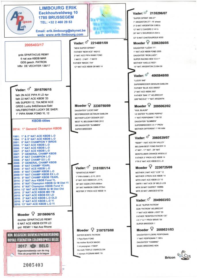 Nepot SPARTACUS REMY 1 Pipa Rank Long Distance YL 2015 6 Nat. ACE KBDB EX long Distance YL 36 Nat. Agen 2767 p. 800 km 29 Nat. Narbonne 3696 p. 872 p. oferta curenta: - |