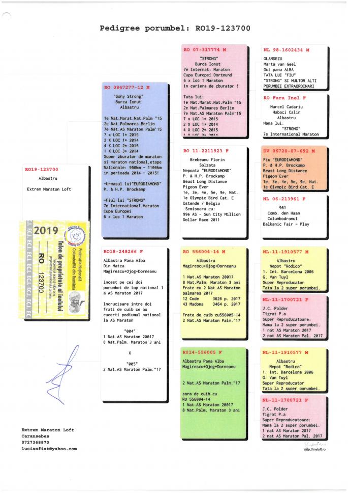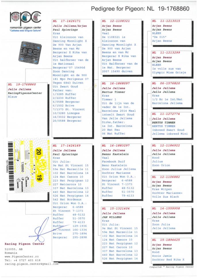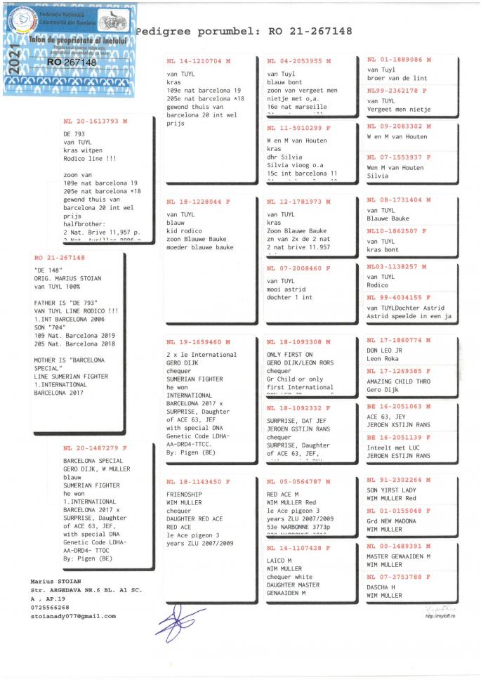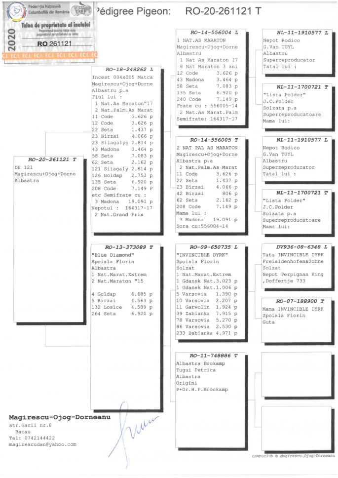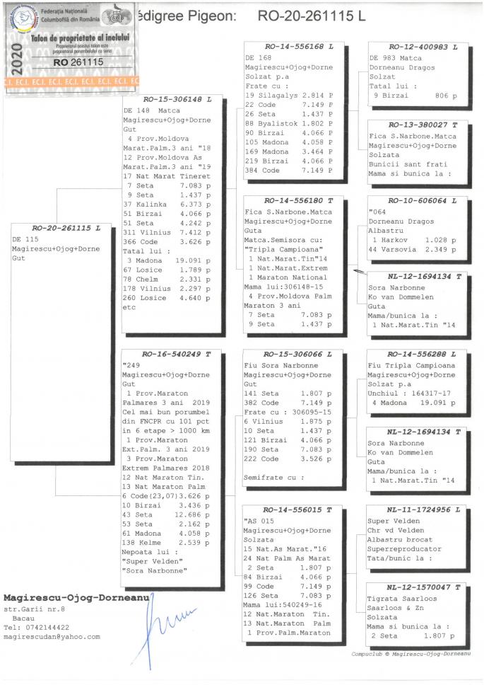 Fiu DE 249 1 Prov. Maraton Palmares 3 ani 2019 Cel mai bun porumbel din FNCPR Cu 101 Pct in 6 etape peste 1000 km 1 Prov. Maraton Extrem Palm. 3 ani 2019 3 Prov. Maraton Extrem palm. 2018 12 Nat. Maraton Tineret 13 Nat. Maraton Palm. oferta curenta: Pigeonslover |