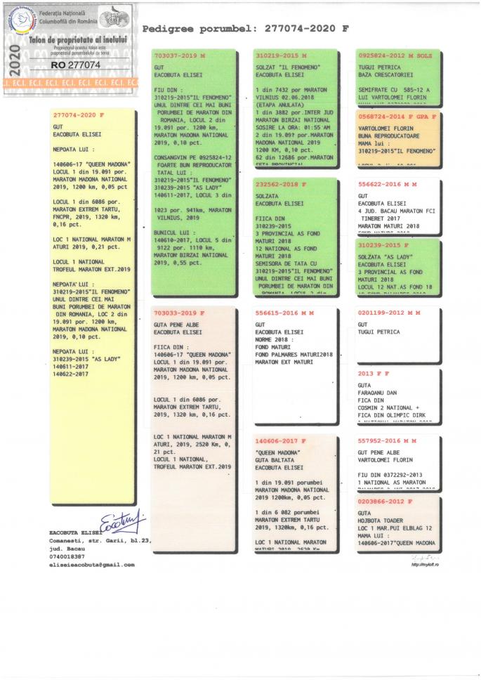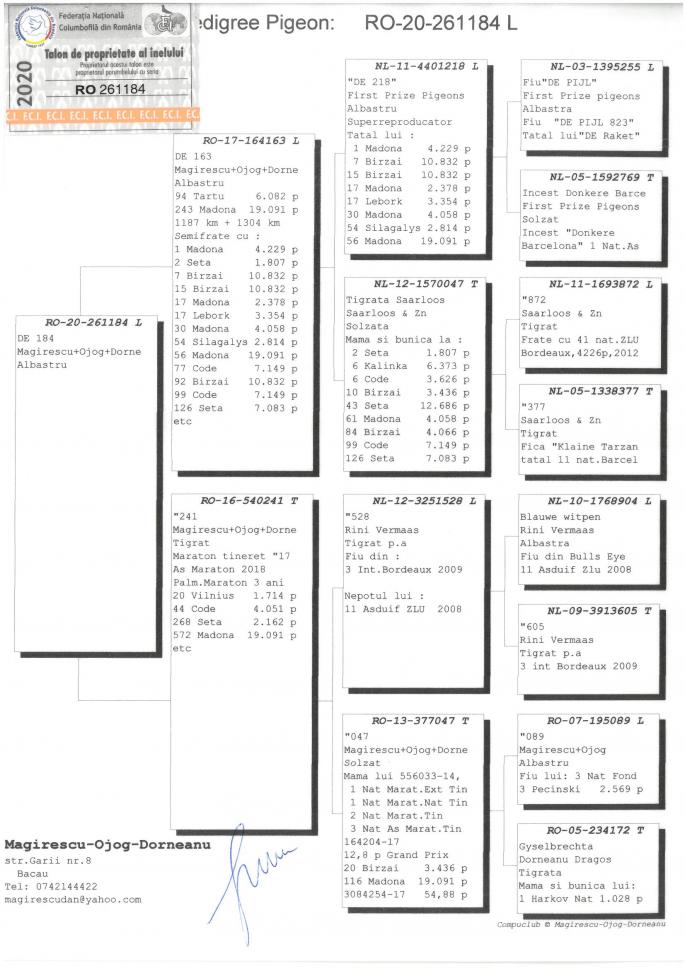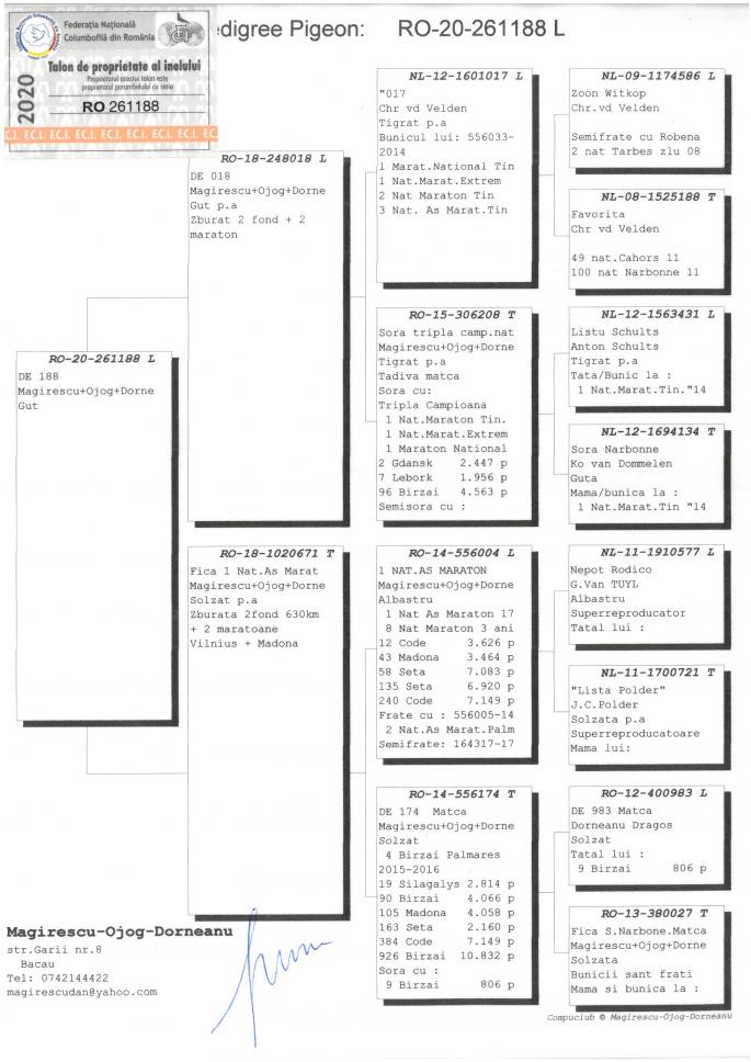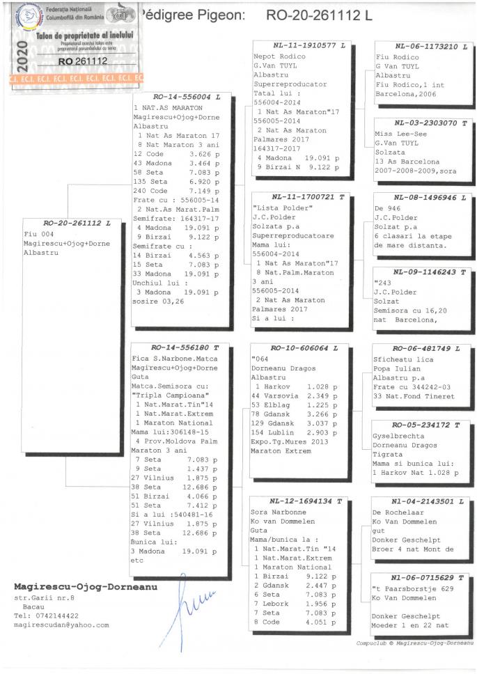 Nepot din QUEEN MADONA 1 Nat. Madona 19,091 porumbei 1200 km 1 Nat. Tartu 6,086 porumbei 1321 km 1 Nat. Maraton National Maturi 2019 cu 0,21 pct. penalizare!