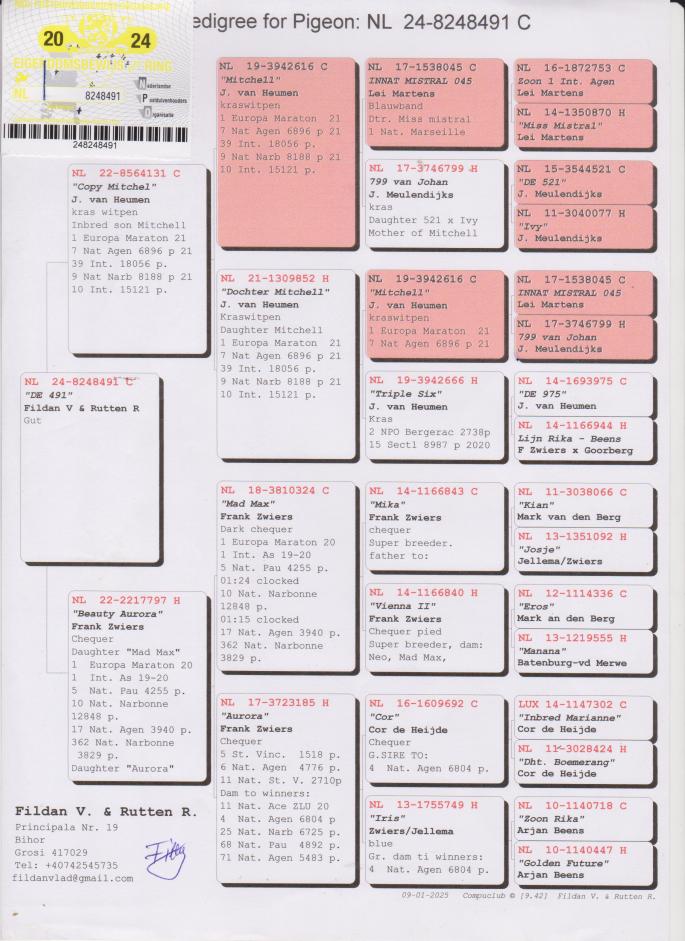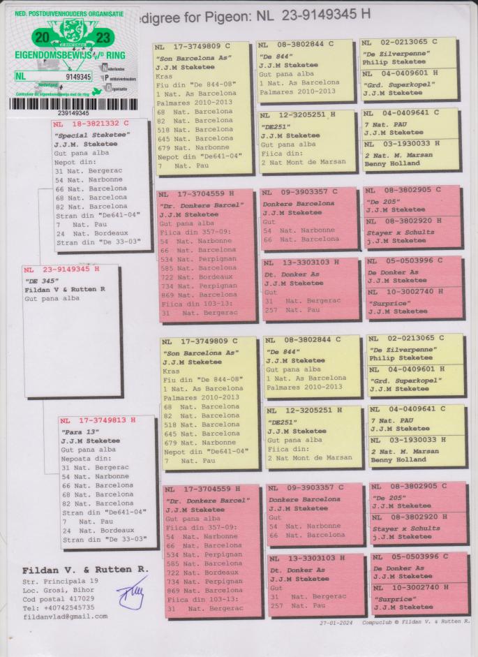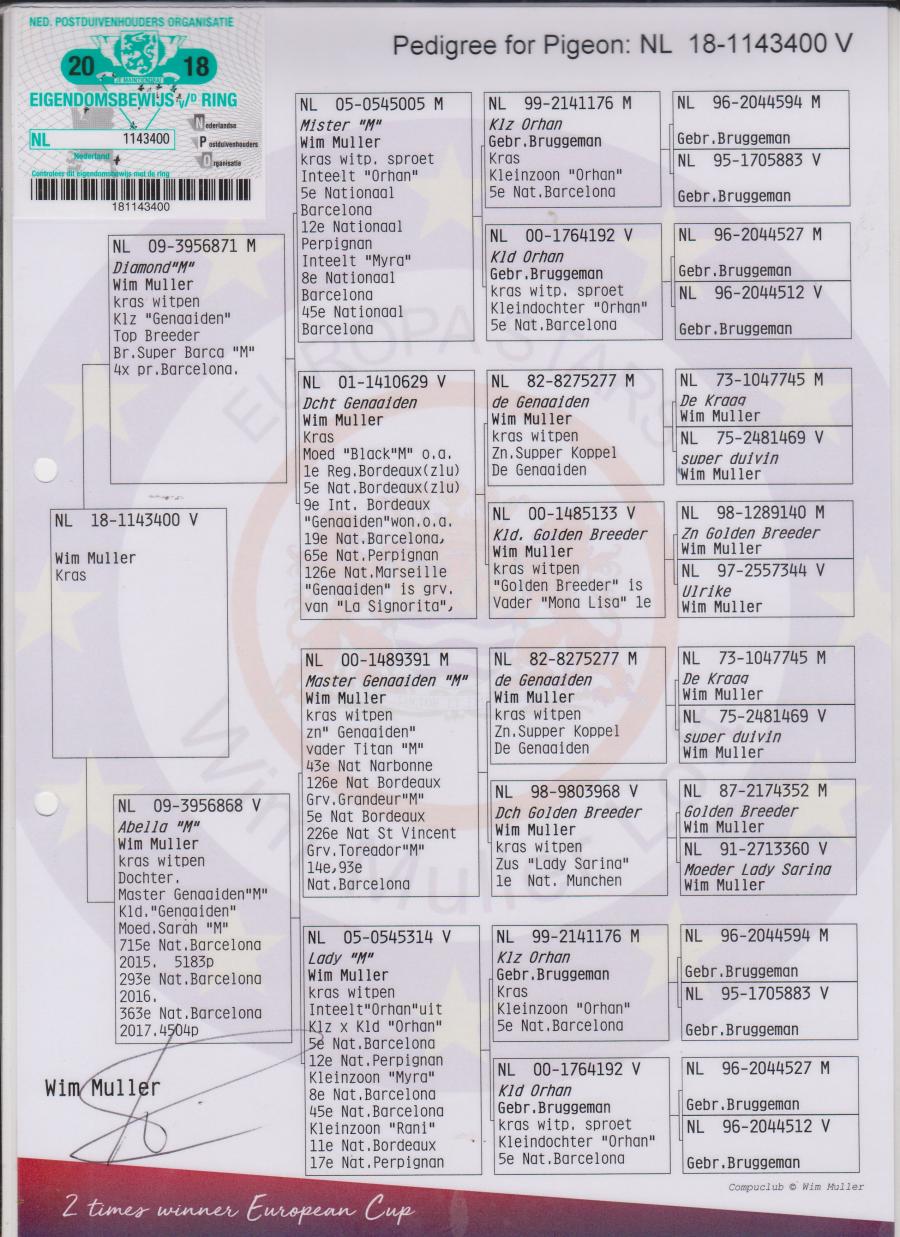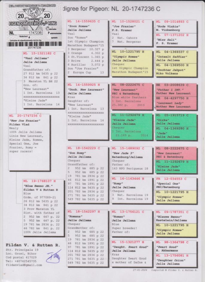Stranepot "Joe Frazier" 4. Nat. Cahors 7. Nat. Bergerac Stranepot Olympic Romee 1st Olympic Champion Marathon Budapesta 15 Stranepot "New Laureaat" 1 Int. Barcelona 25.382p 2013 Stranepot "Kleine Jade" 1 Int. Barcelona 21.169 P. – 2014 Mama fiica din NL18-1542229 & NL18-1542297 Bunici la : 2 952 km 685 p 22 5 952 km 685 p 22 19 781 km 2836 p 22 46 812 km 1891 p 22 97 781 km 1891 p 22 114 812 km 5635 p 22 201 782 km 2836 p 22 271 781 km 5635 p 22 549 782 km 5635 p 22 oferta curenta: BRUTARU NICOLAE |