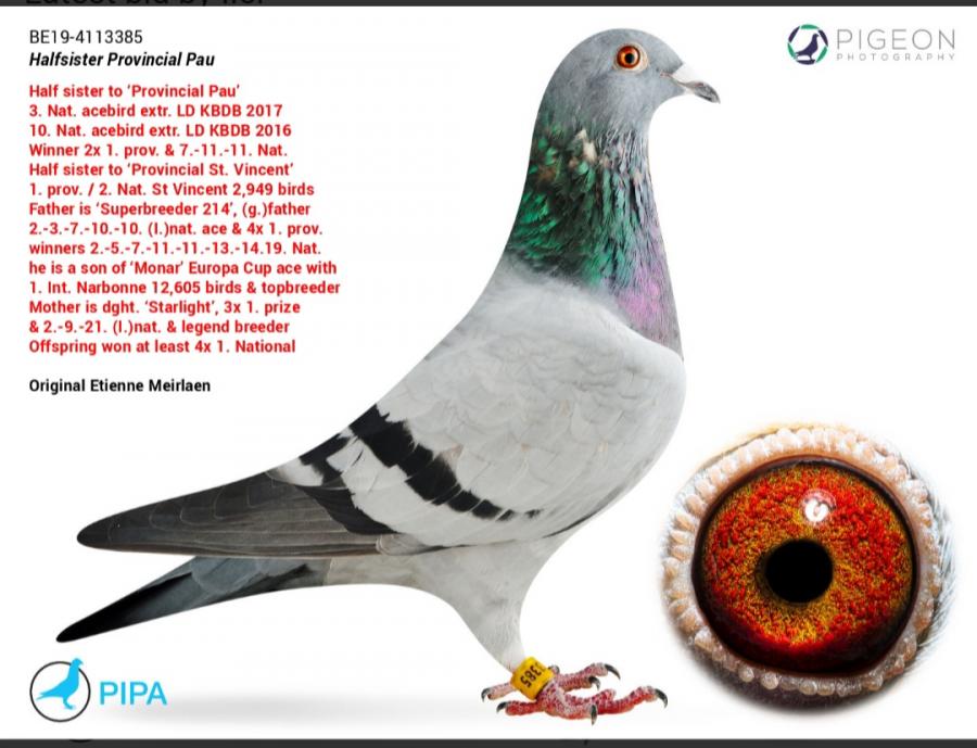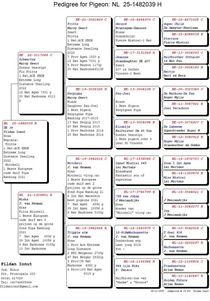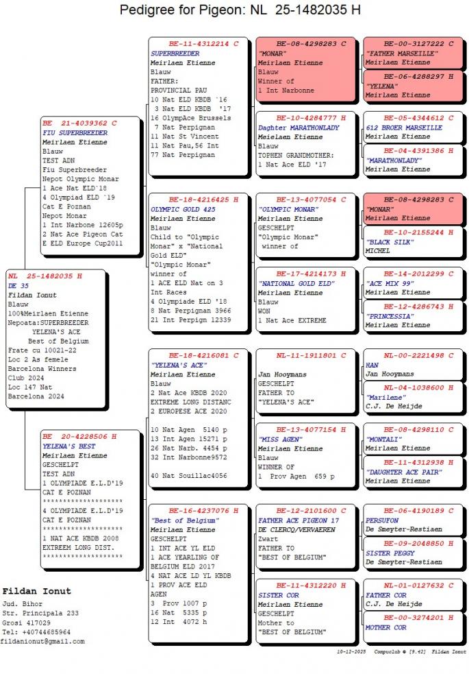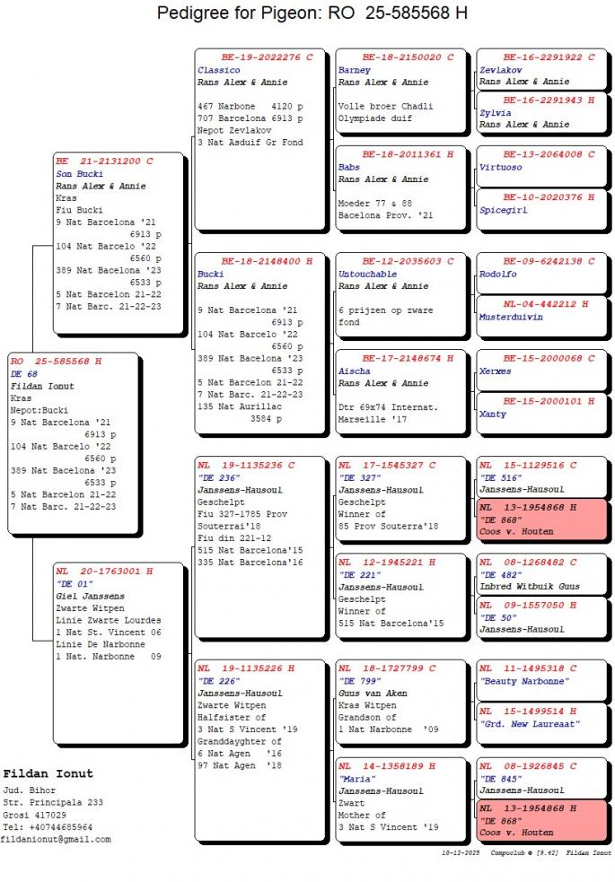Nepot DE 398 21 Nat. Barcelona 2019 Mama este nepoata Jonge Hulk 13 Nat. Bordeaux 2463 p. 15 Nat. Pau 2682 p. 44 Nat. Bordeaux 2686 p. 50% PWA van der Meulen 50% Ko van Dommelen oferta curenta: - |